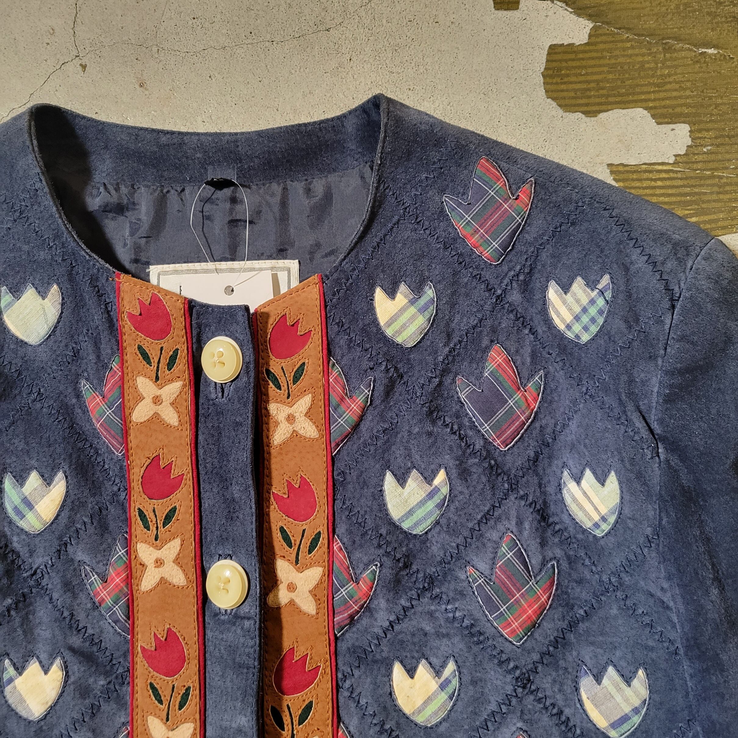 色味は、ネイビー × レッド × ブラウン × グリーン × アイボリー。カットワークでチャーミングに並ぶチューリップ、プックりと立体的なチェックのチューリップ。本当に愛情をもって作られた拘りをひしひしと感じる、愛らしい一着です。広めの肩幅、短めの着丈でスッキリとするシルエットも◎