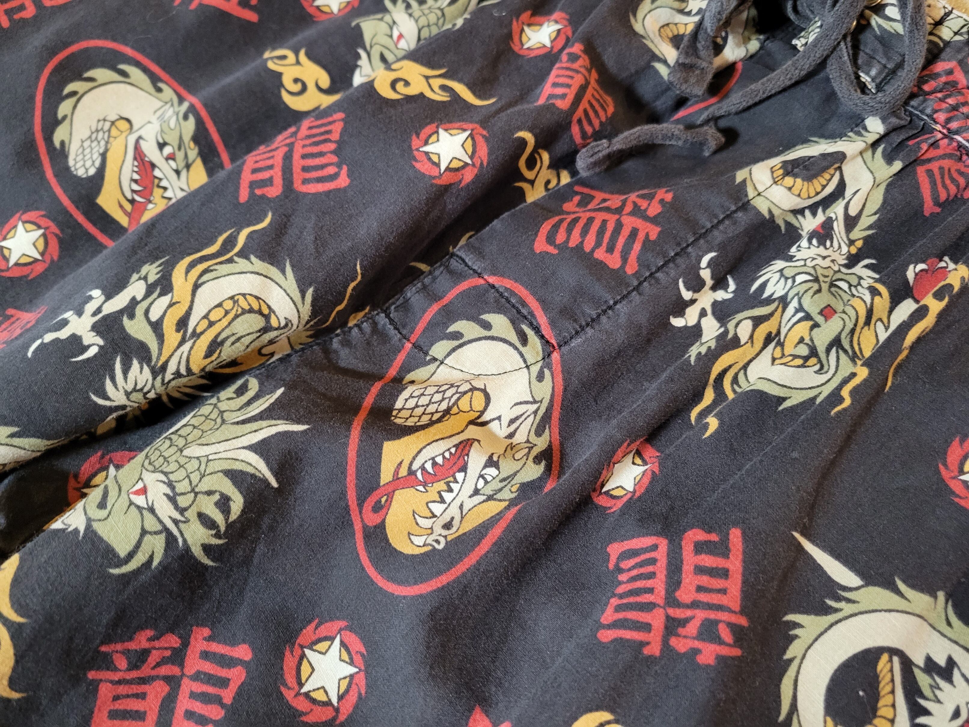 色味は、ブラック × グリーン × イエロー × ボルドー。迫力のあるような無いような。龍がプリントされたユニークな一着です。シルクやレーヨンのような軽やかさのあるコットンは着心地もよく程よいアクセントにぴったり。ウエストもただのゴムではなくデザインが入っているところも気が利いていてよし。