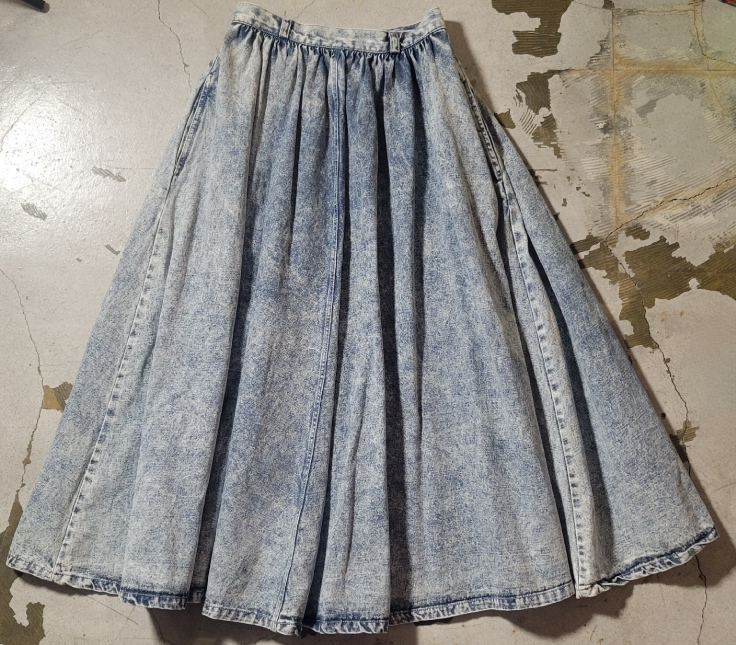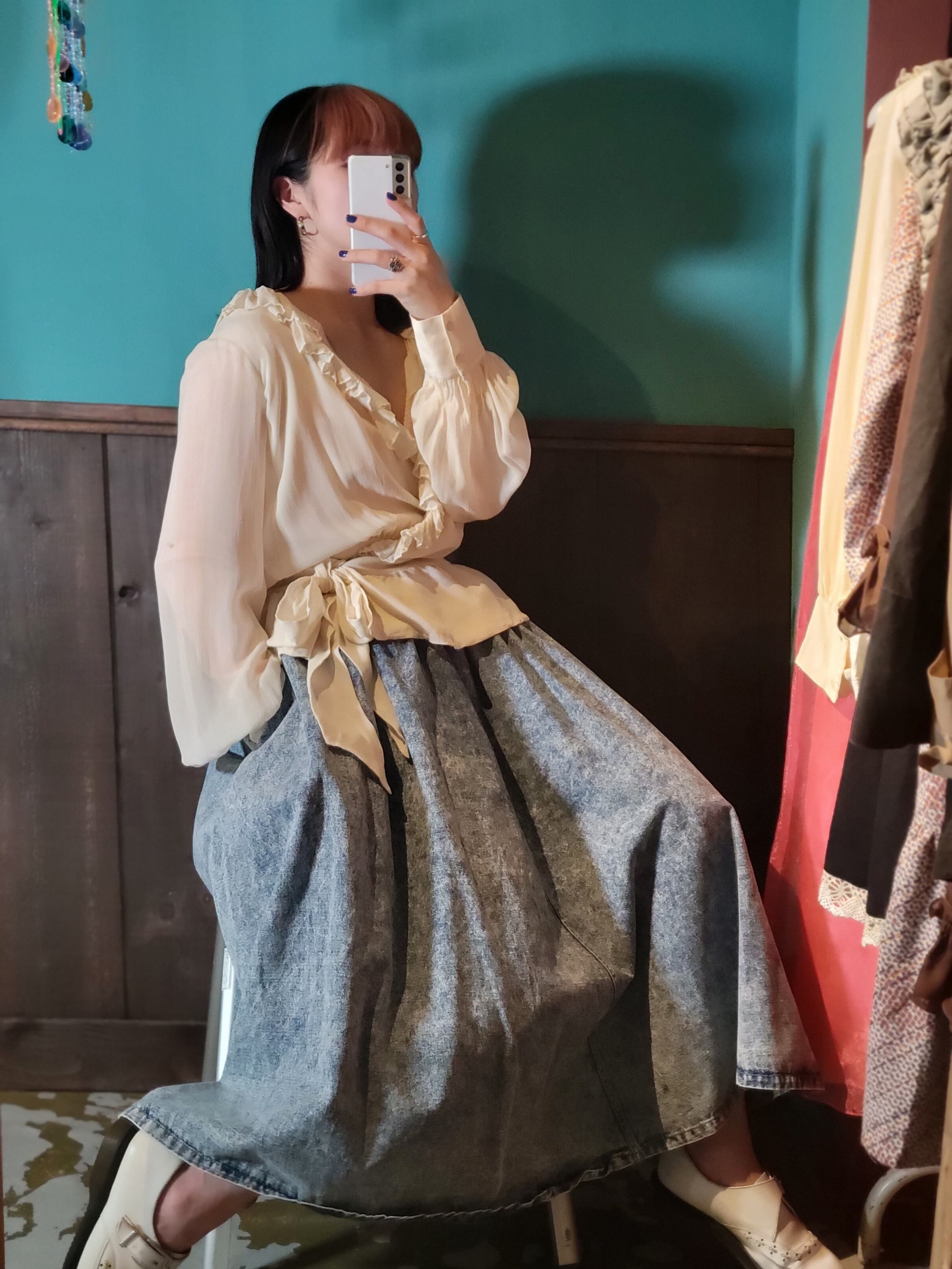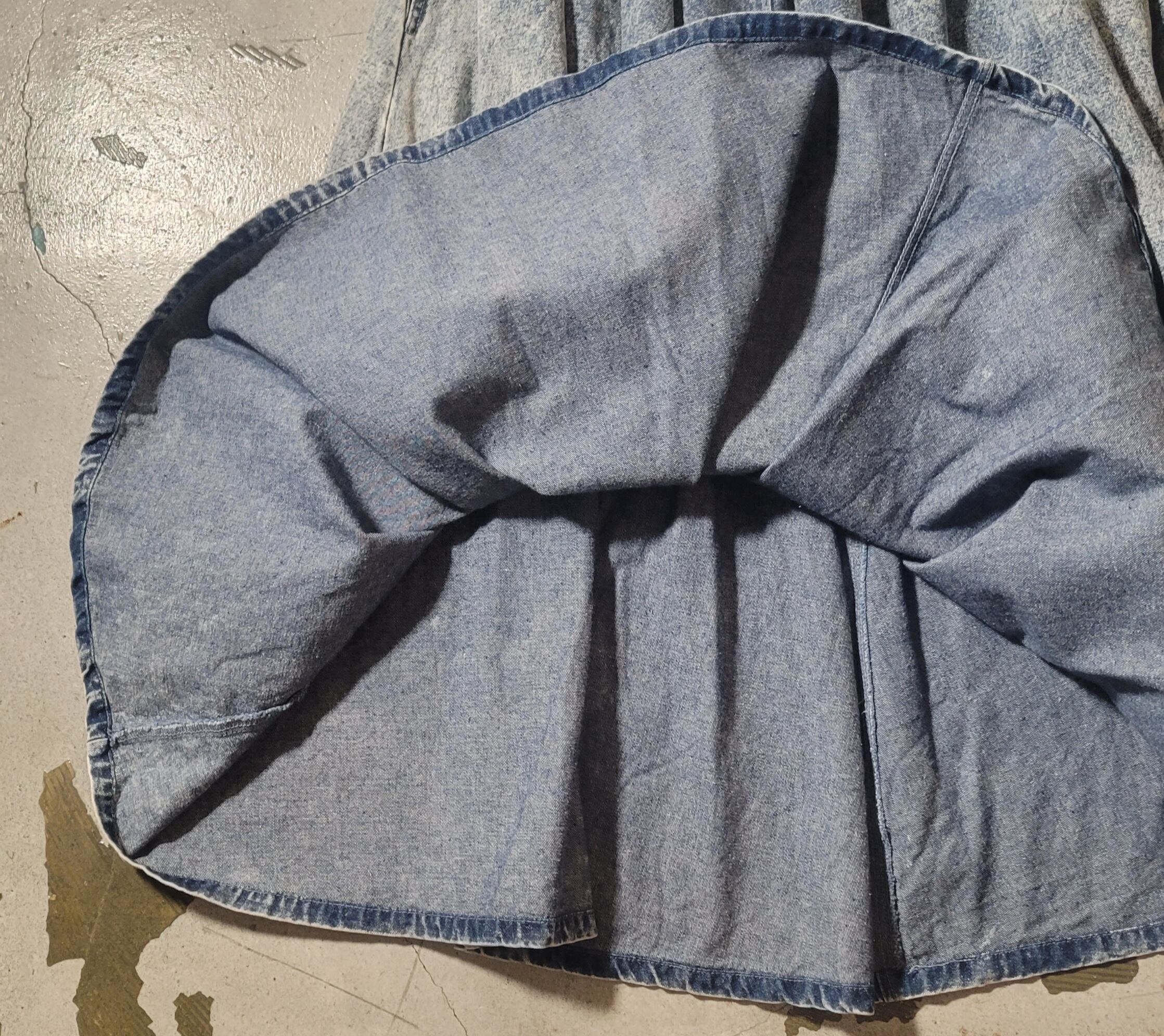 色味は、ブルー × ホワイト。たっぷりとした生地のでふんわりと広がるフレアなシルエットが魅力的な一着。ケミカルウォッシュのザ古着な雰囲気がよくカジュアルな印象に反しての綺麗なシルエットのギャップが素敵。