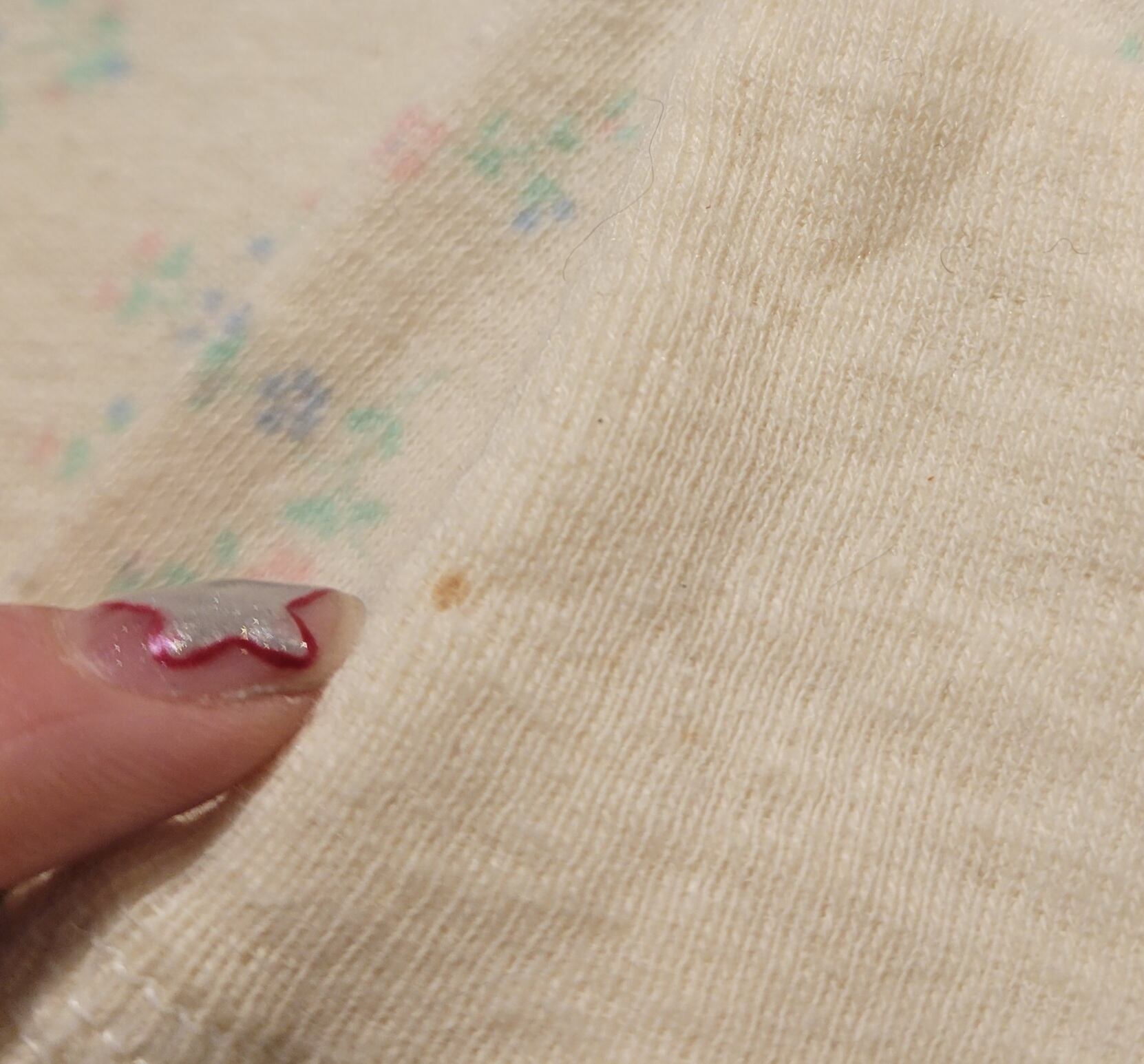 色味は、アイボリー × グリーン × ピンク × ブルー。インナーとして重宝しますが、ほどよい厚みで一枚でトップスとして成り立つのが嬉しいポイント。小花の総柄ですが淡く優しいカラーリングで主張しすぎないのもよしです。