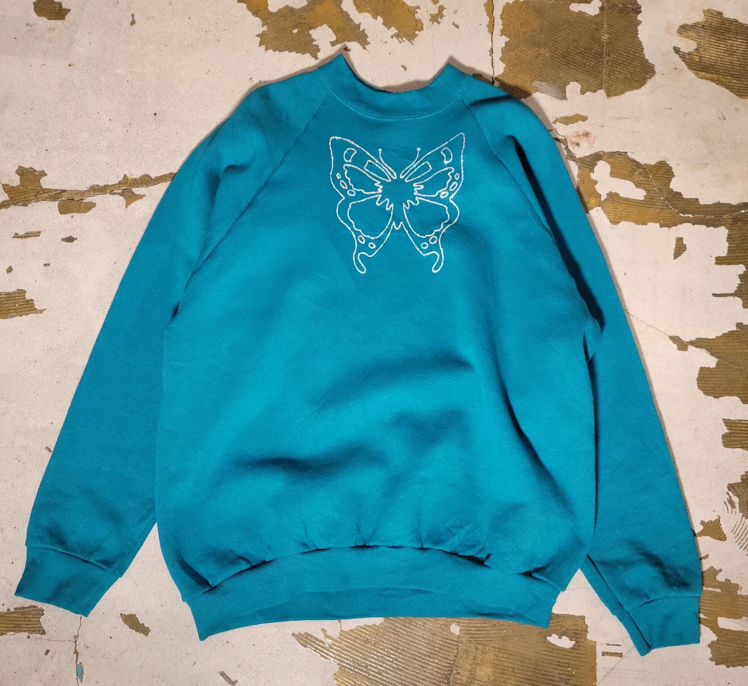 色味は、グリーン × シルバー。ゆったりとしたサイズ感と、スッキリとしたモックネックのシルエットにキラッとラメラメ蝶々のプリントがかわいい一着です。