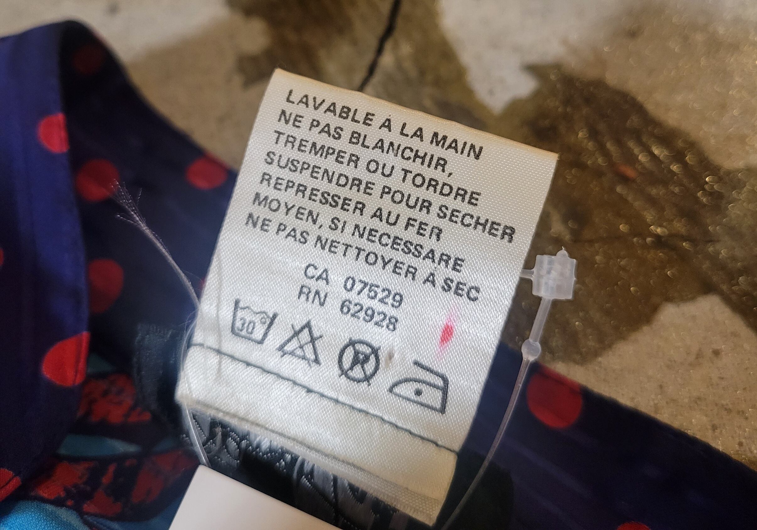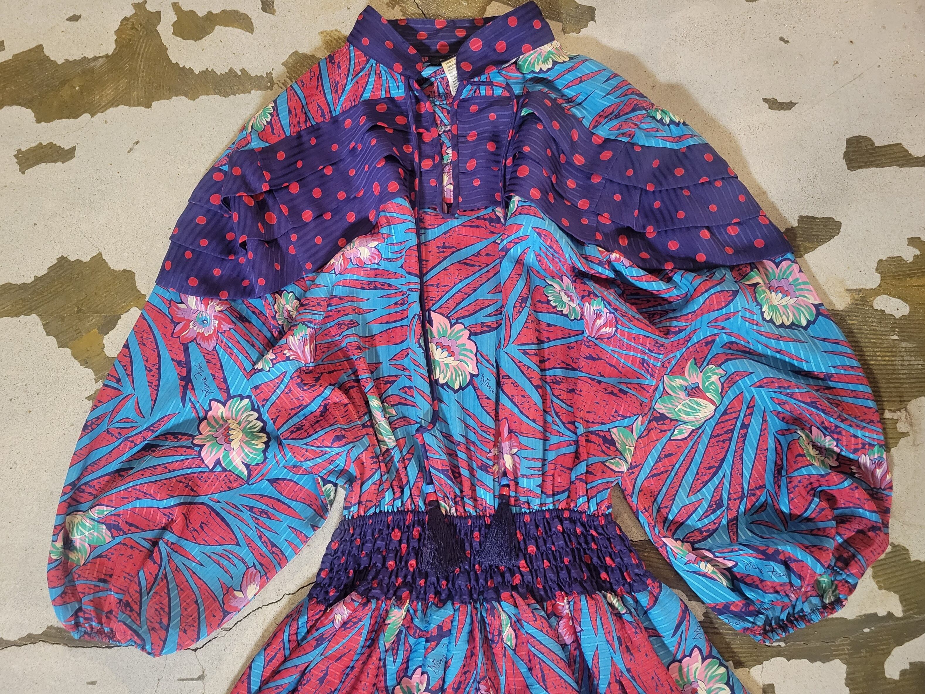 色味は、レッド × ブルー × グリーン × ネイビー × ピンク。ドットとボタニカルな柄が目を引く一着です。鮮やかな柄の組み合わせ、ギュッと寄っるウエストのシャーリングや首もとのリボン。装飾的なデザインでありつつもストレスを感じにくい着心地でファンも多いアイテムです。