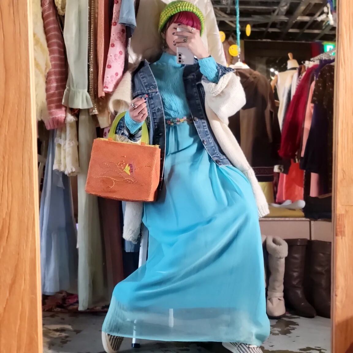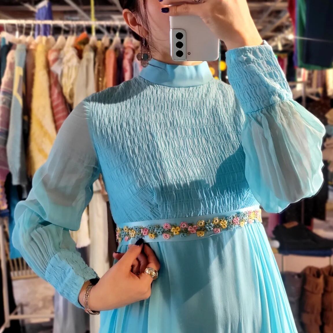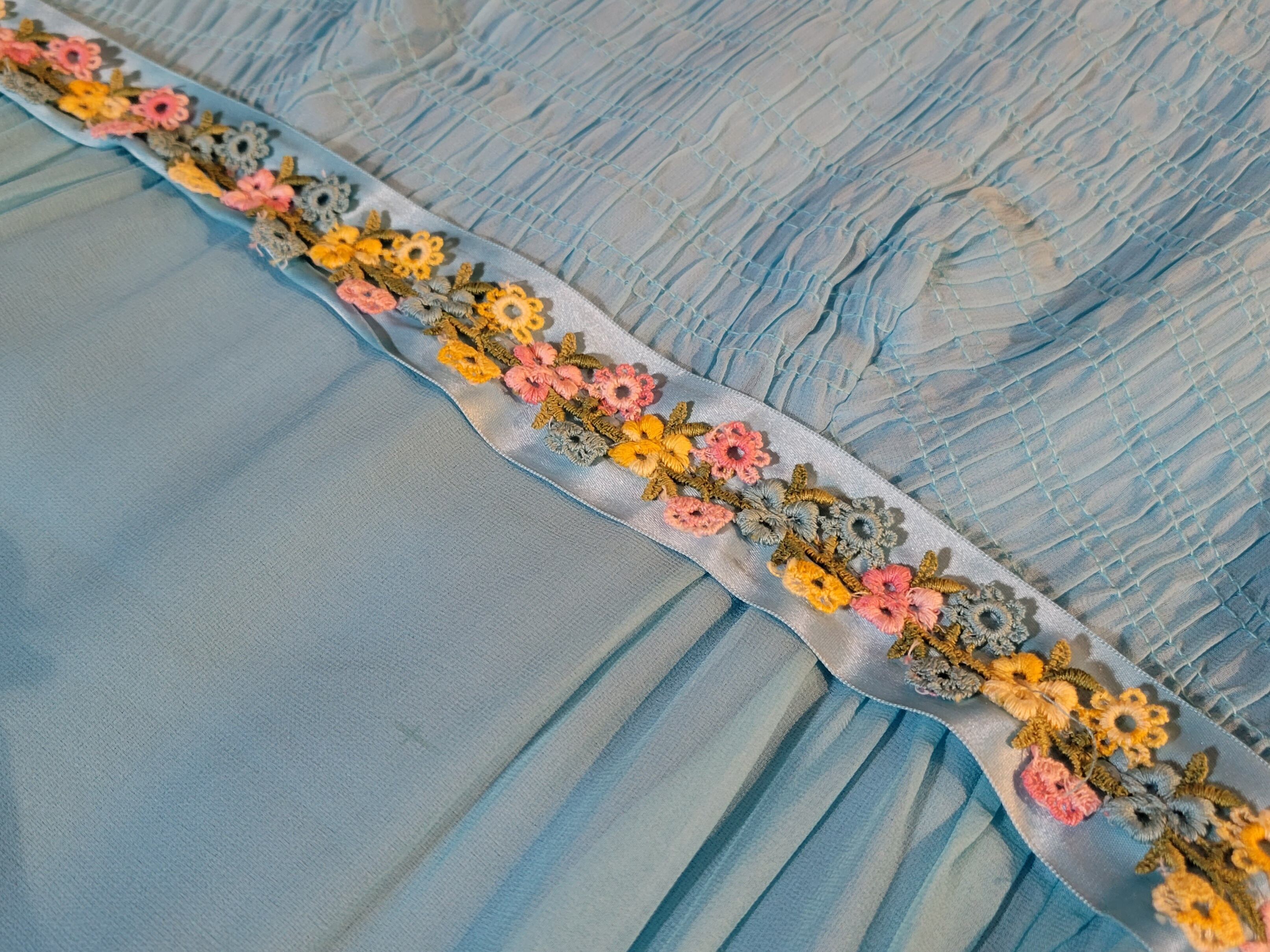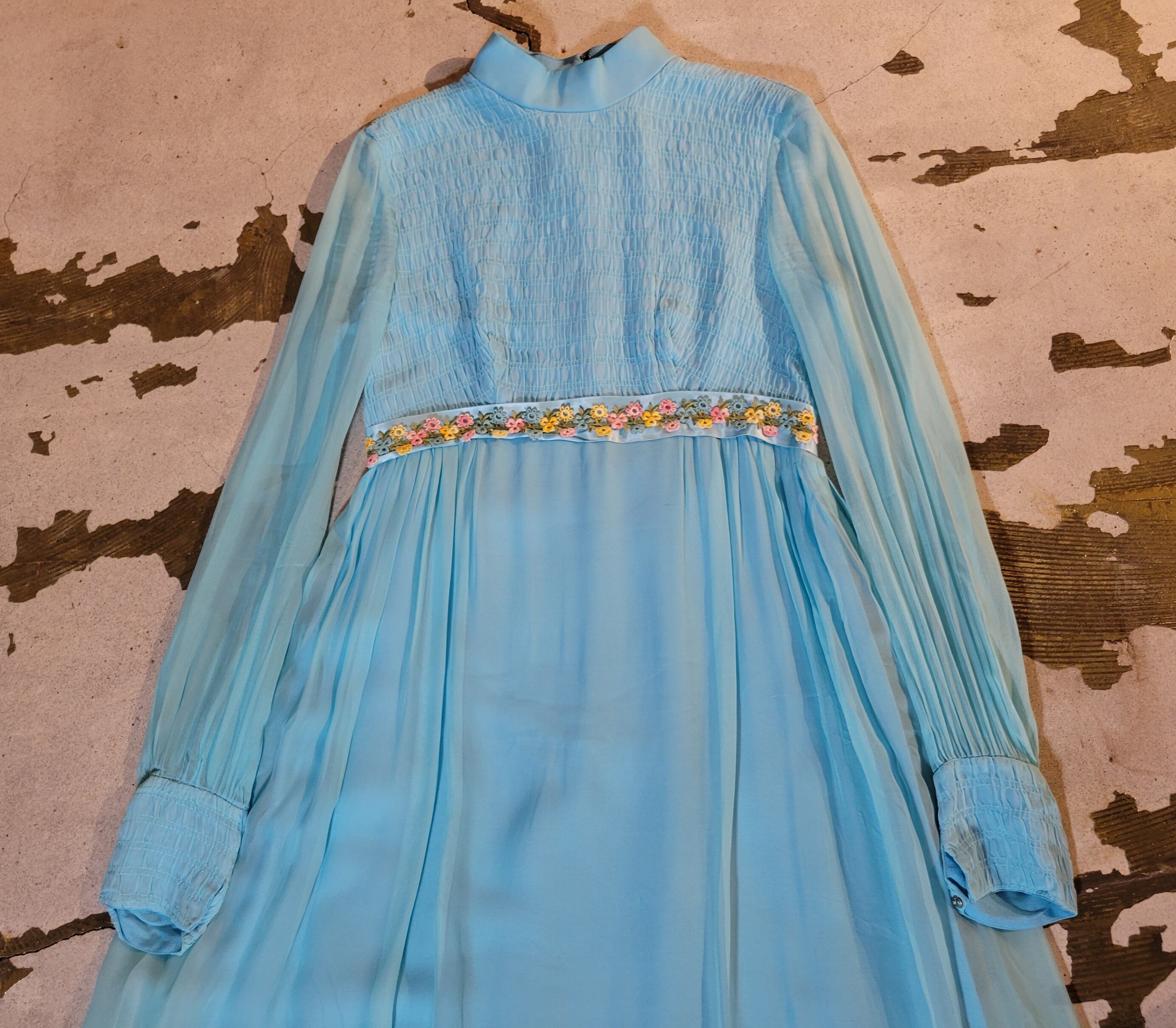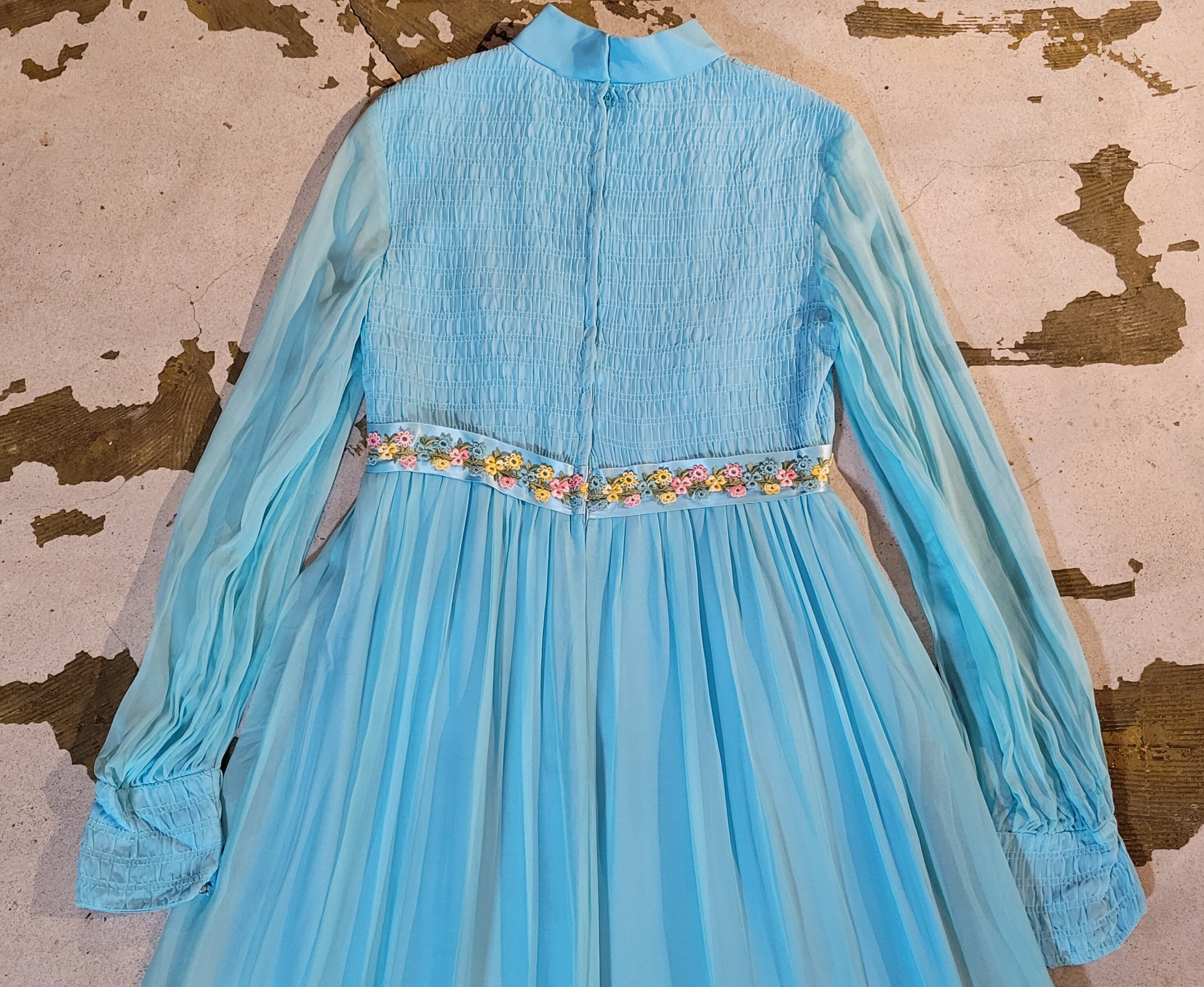 色味は、ライトブルー × ピンク × イエロー × グリーン。透け感のあるシアーな素材でたっぷりとしたマキシな丈。爽やかな優しいブルーで主張の強すぎないストンとしたシルエットも魅力的。ウエスト部分にあしらわれたお花のテープにも心惹かれる一着です。
