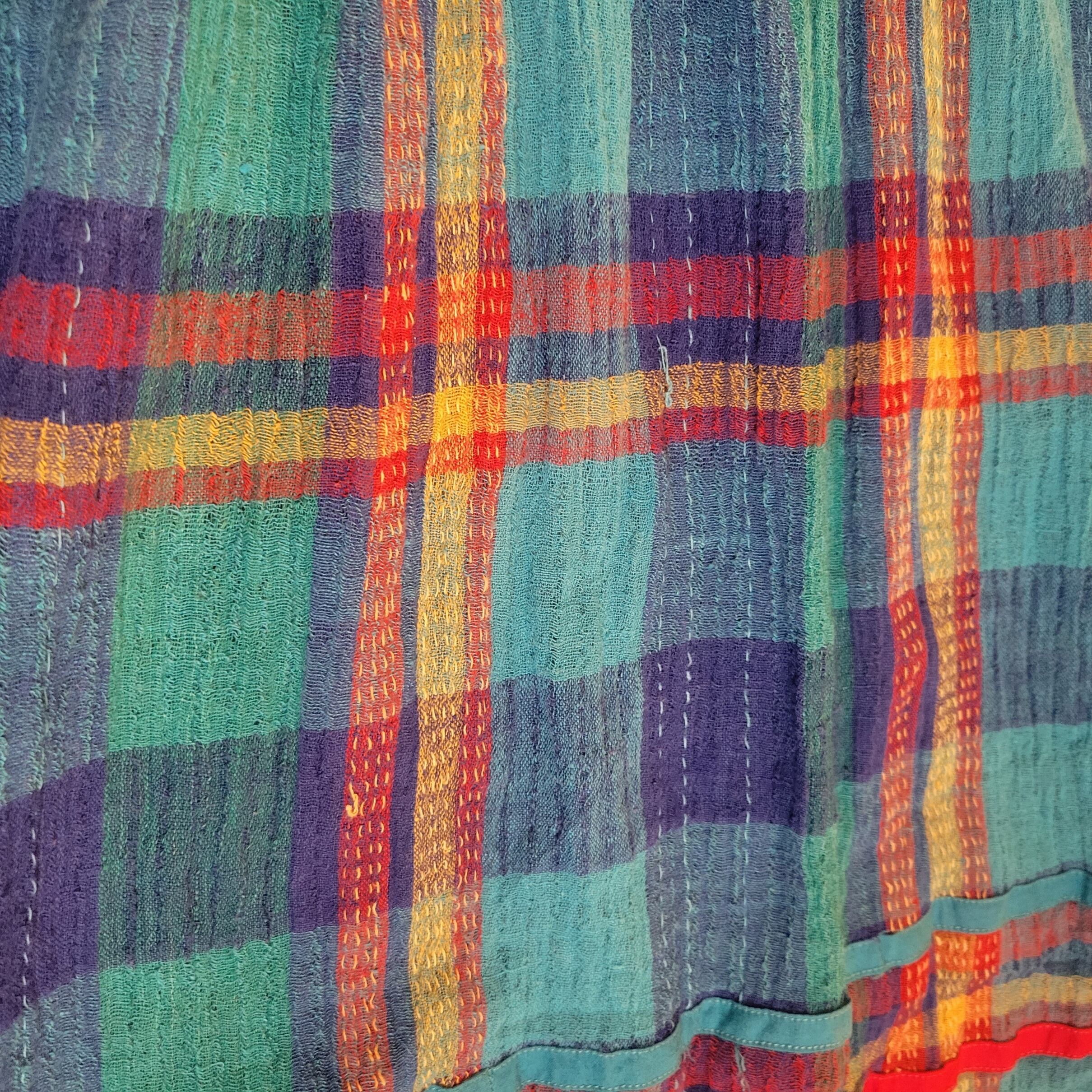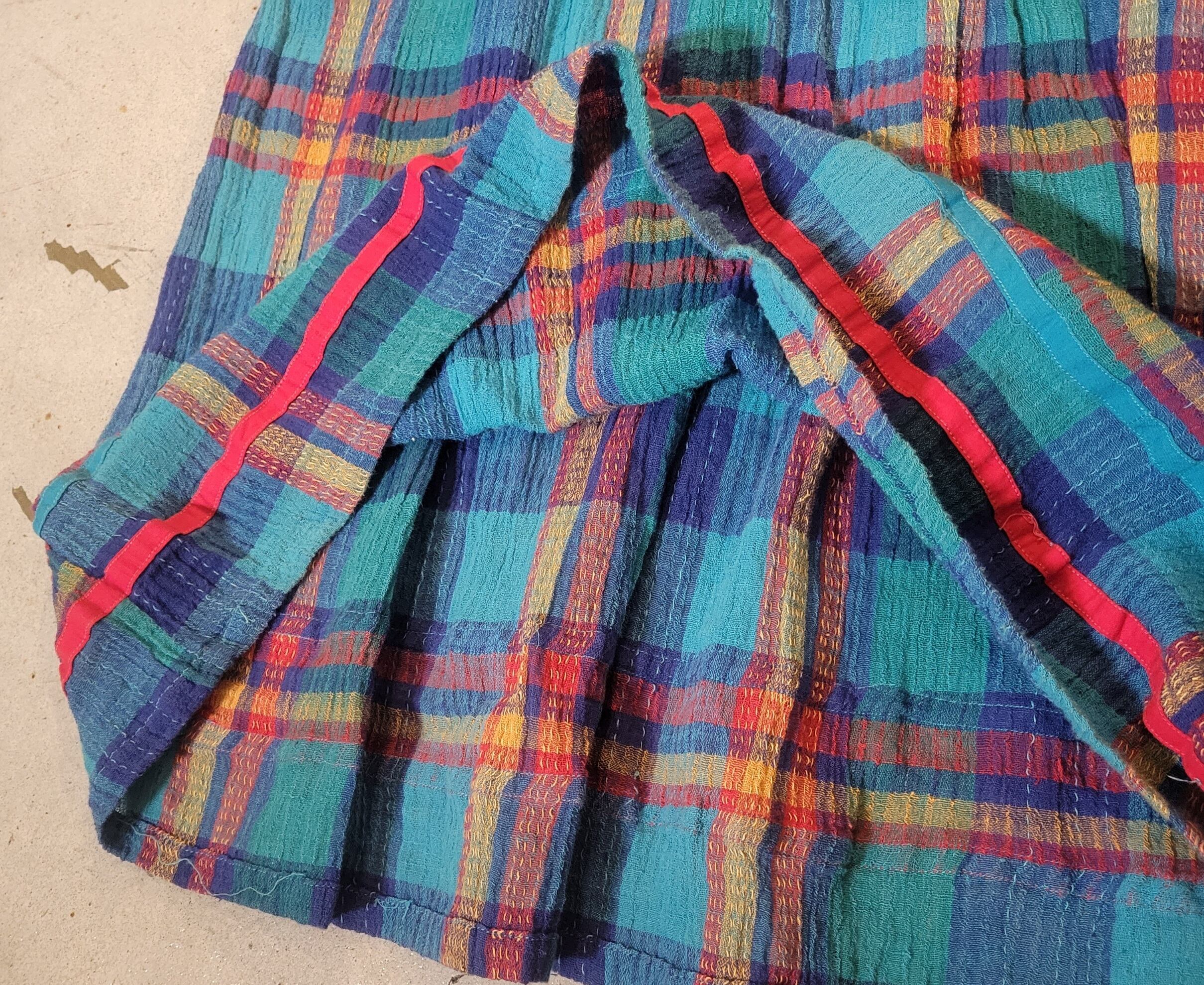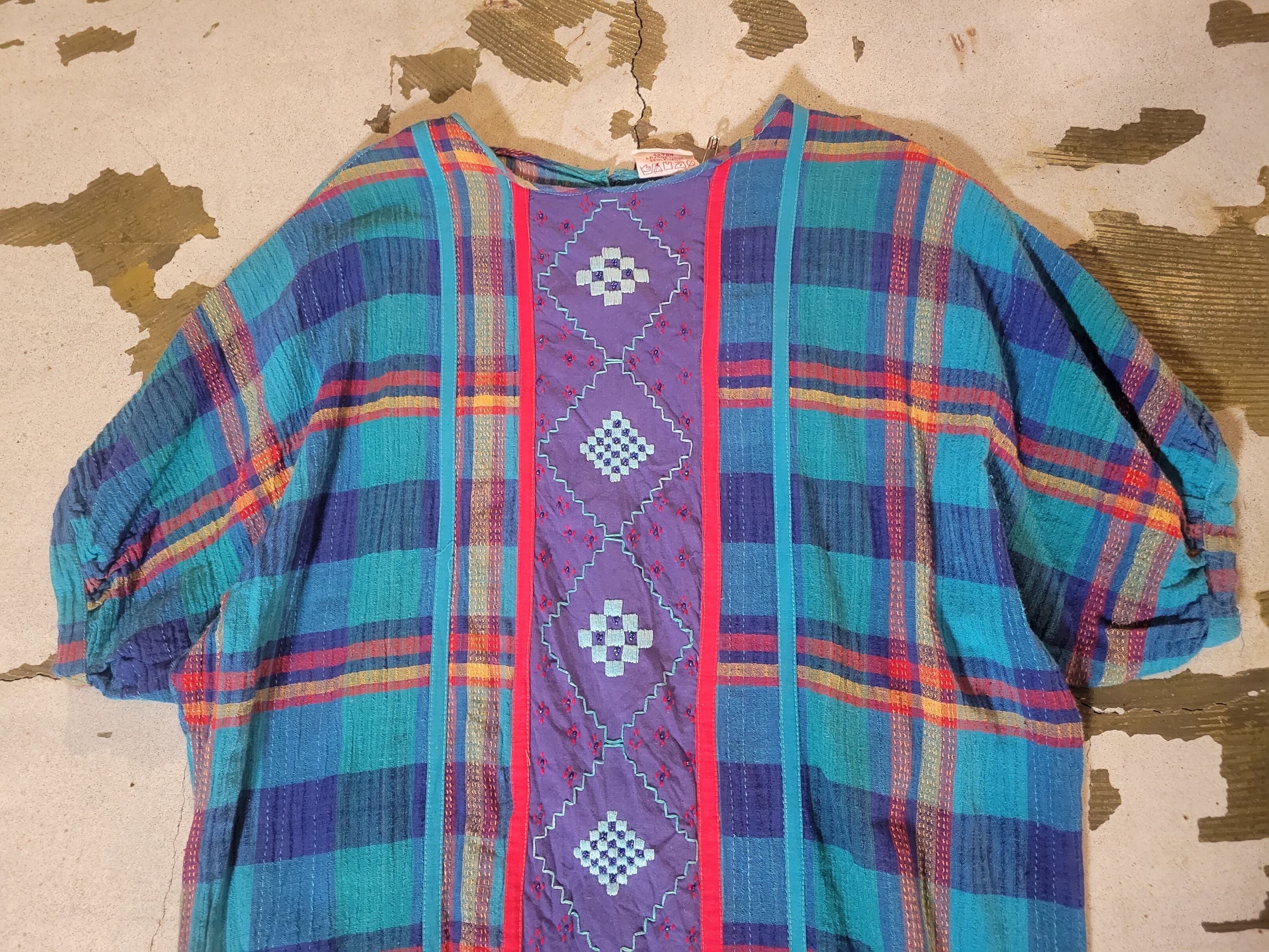 色味は、ブルー × レッド × マスタード × パープル。ビーズと刺繍ビビッドチェックが可愛い一着です。