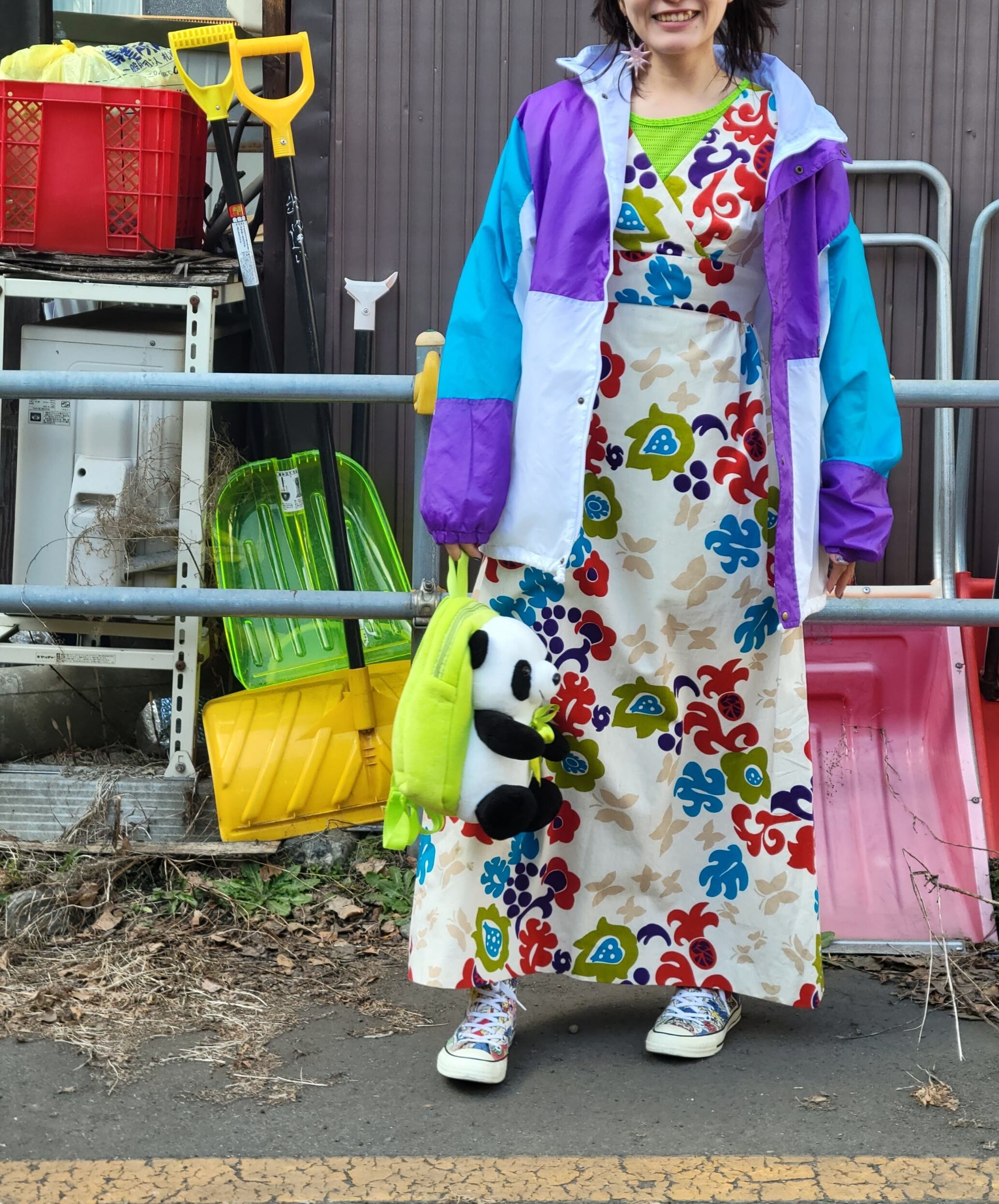 色味は、ホワイト × レッド × ブルー × グリーン × パープル。スッキリしたVネックとカシュクールのデザイン、カラフルで大振りなテキスタイルですが余白もありトータルバランスがとてもよい一着です。