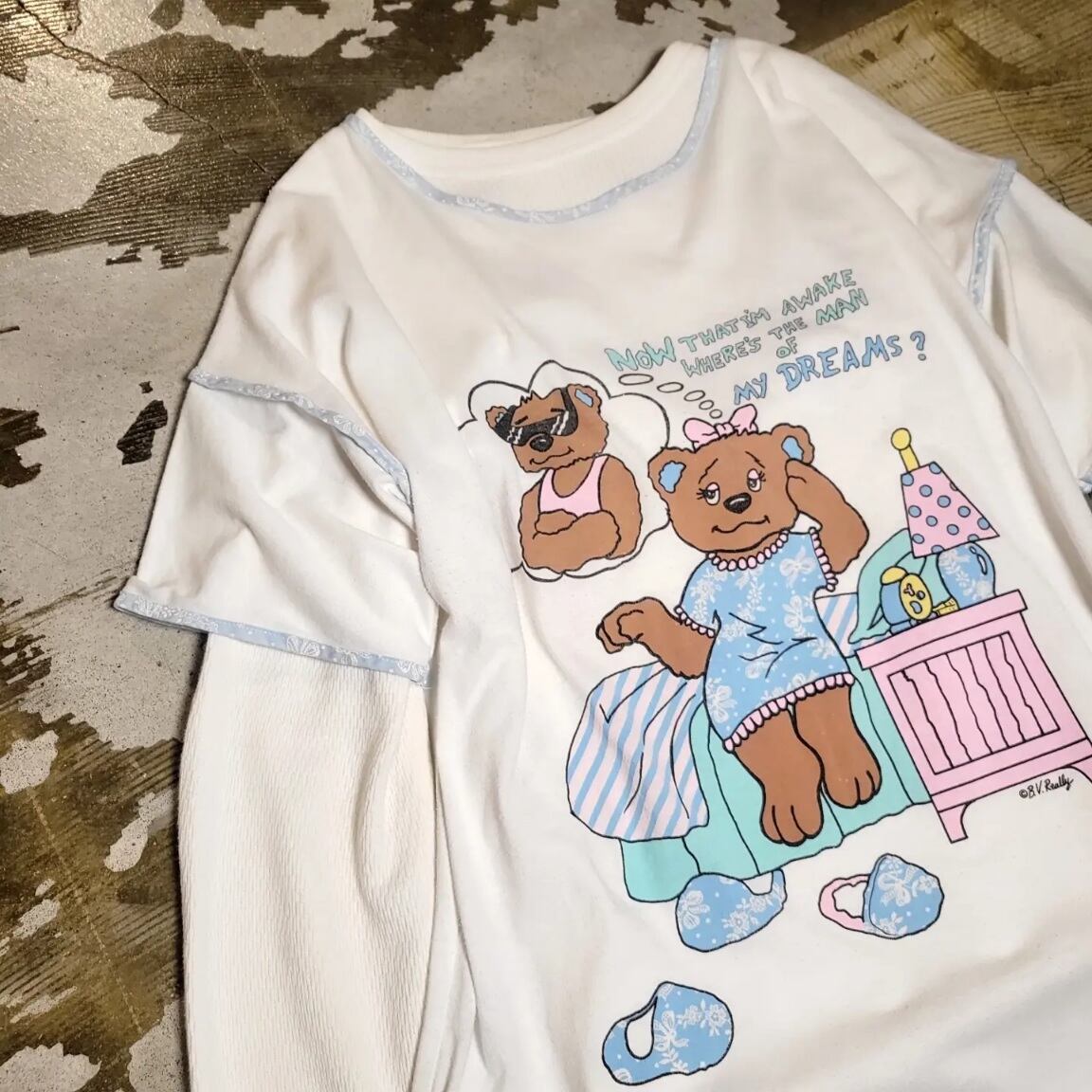 色味は、ホワイト × ブルー × ピンク × ブラウン × ブラック。お目覚めくまちゃんのプリントが◎ポリエステルとコットンがハーフハーフの柔らか軽やか、着心地最高なのが魅力的。パイピングの生地とくまちゃんのお召し物とのテキスタイルがリンクしてる細かさにもキュン♡