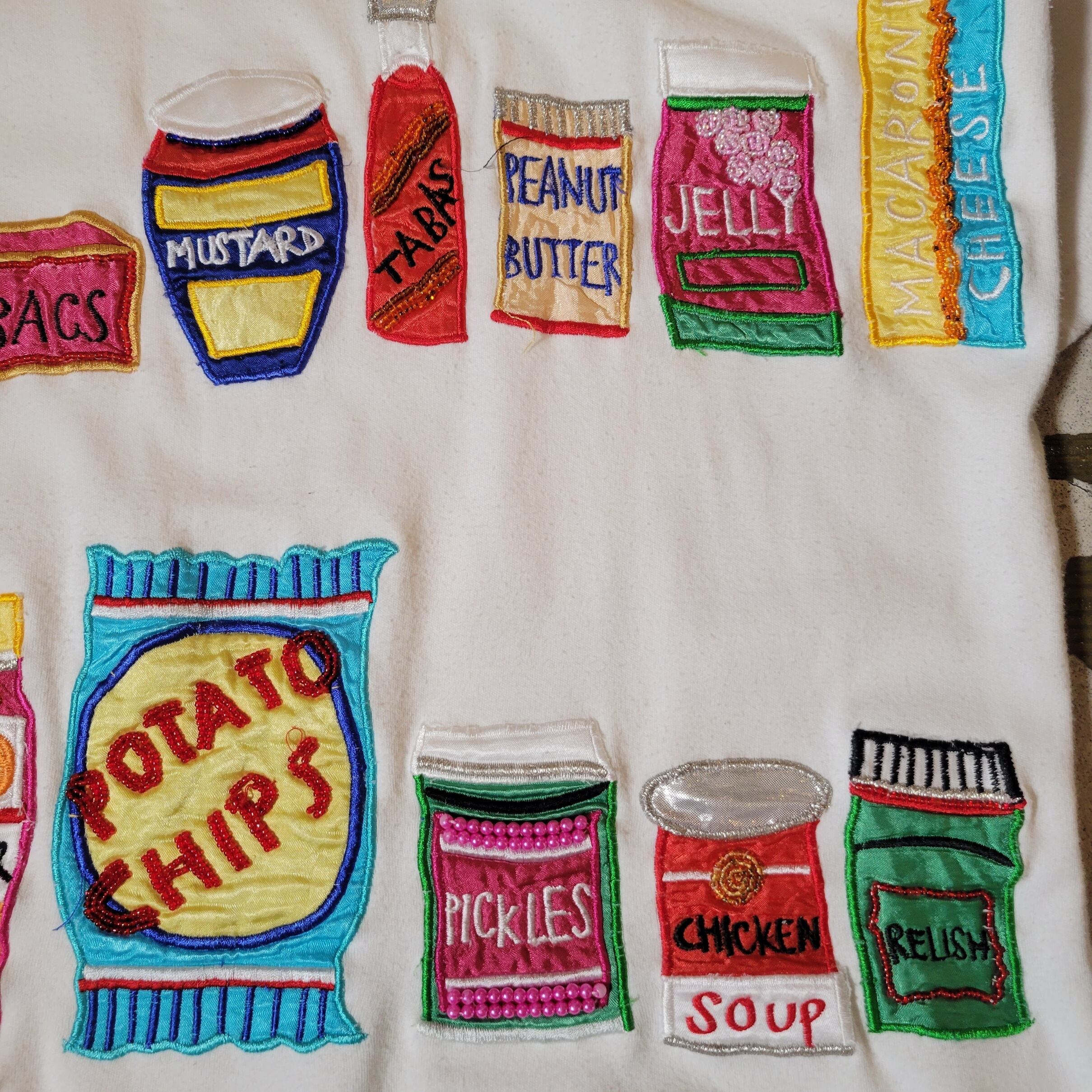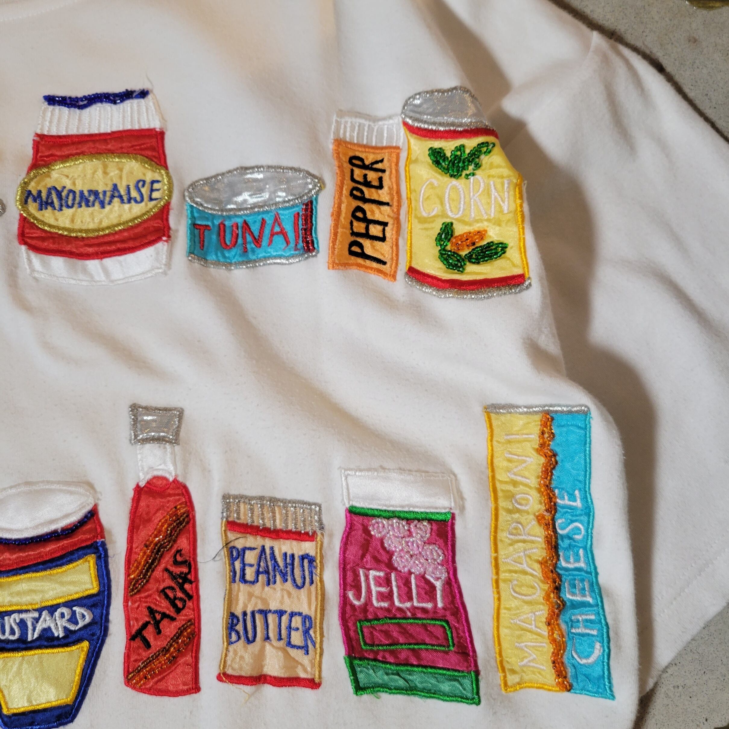 色味は、ホワイト×いろいろ。カラフルな缶詰や調味料の刺繍はビーズなども施されこだわりを感じます。ホワイトベースにファニーな柄が他にはない魅力的な1着。シンプルなスタイリングに遊び心をどうぞ。