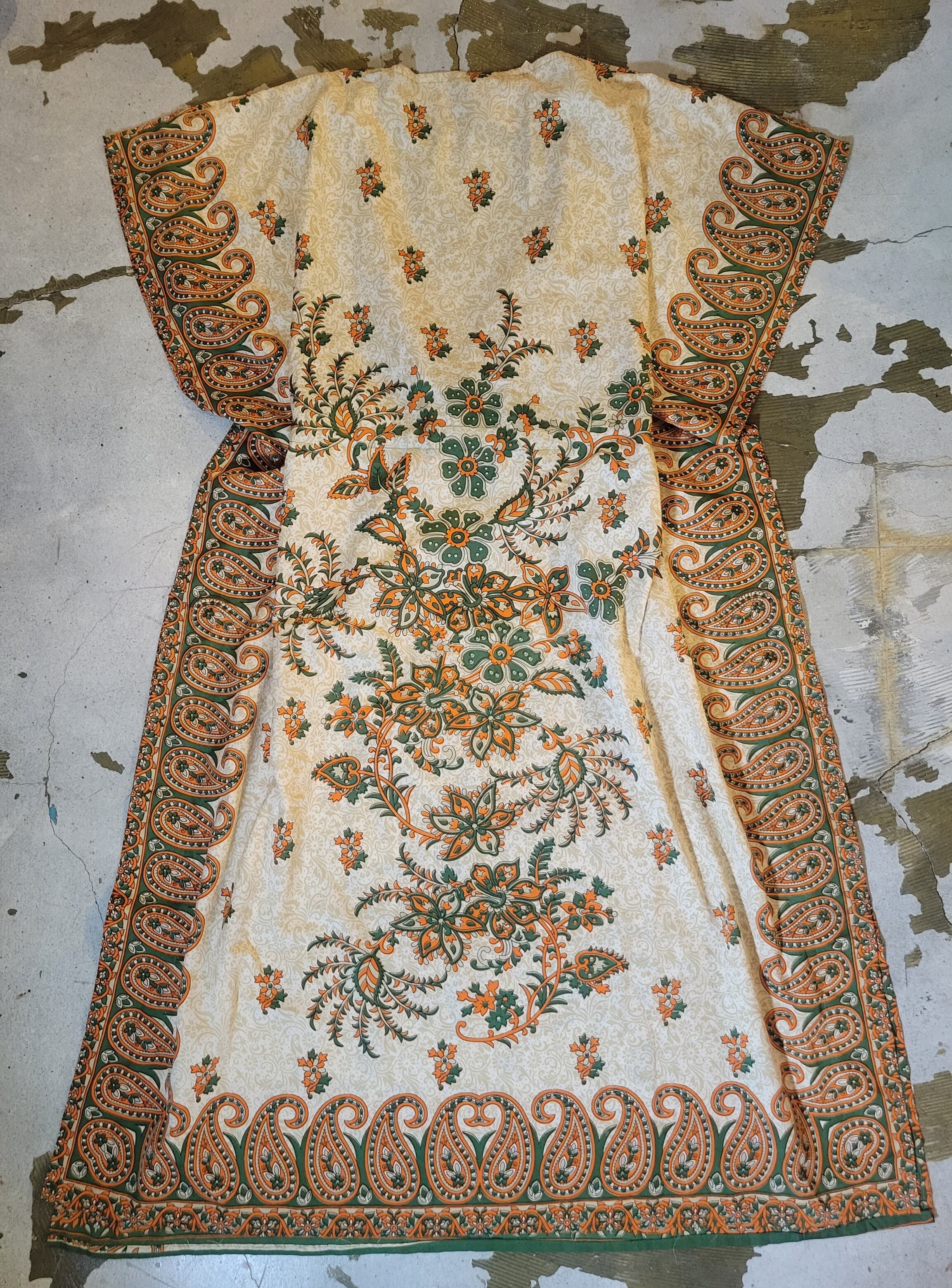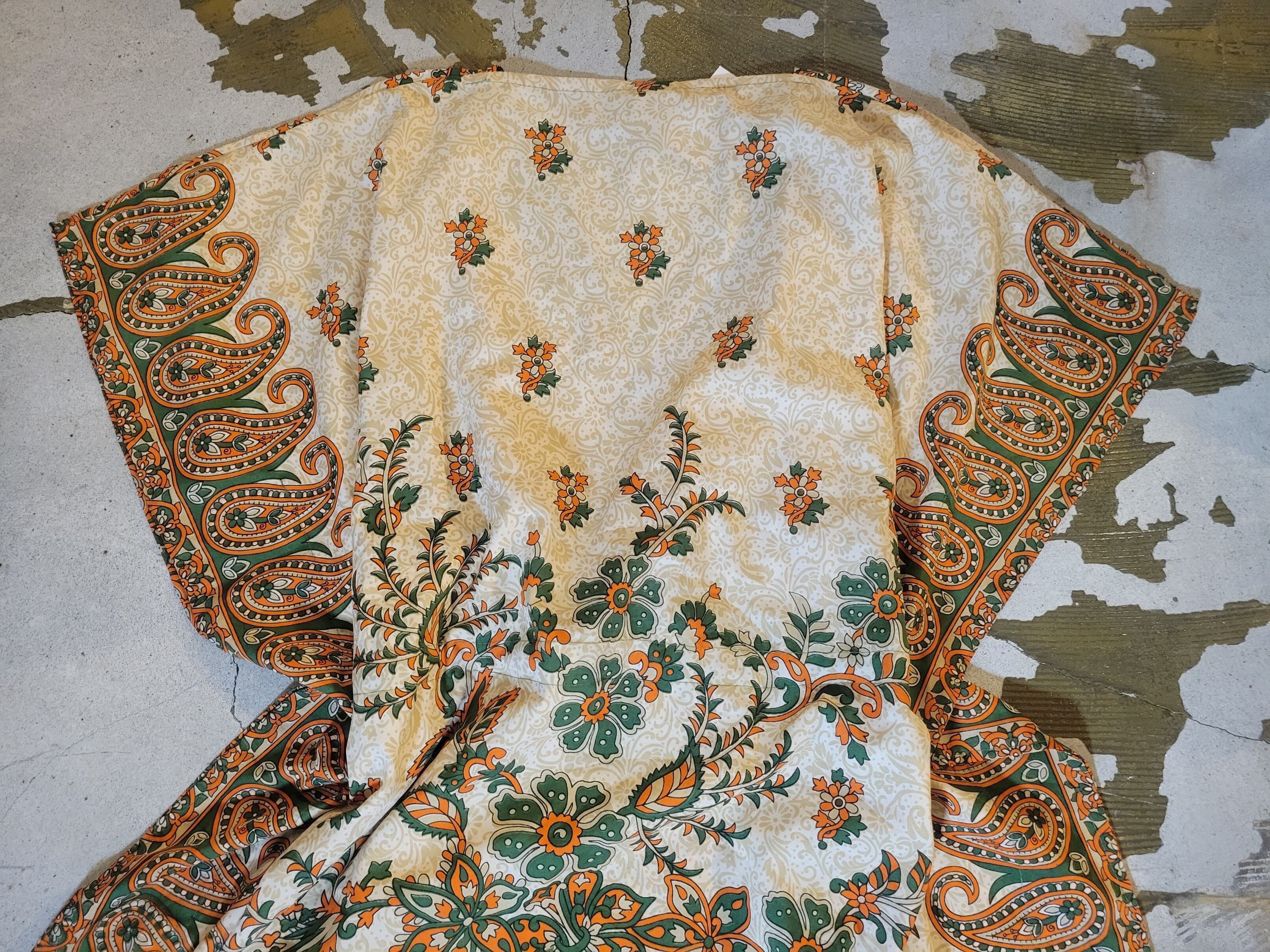 色味は、アイボリー×グリーン×オレンジ。ストレスフリーでさらりと着られるのに、一枚でキまります。襟部分はVになっており、ゆとりがあるのでシャツ等をレイヤードしても◎