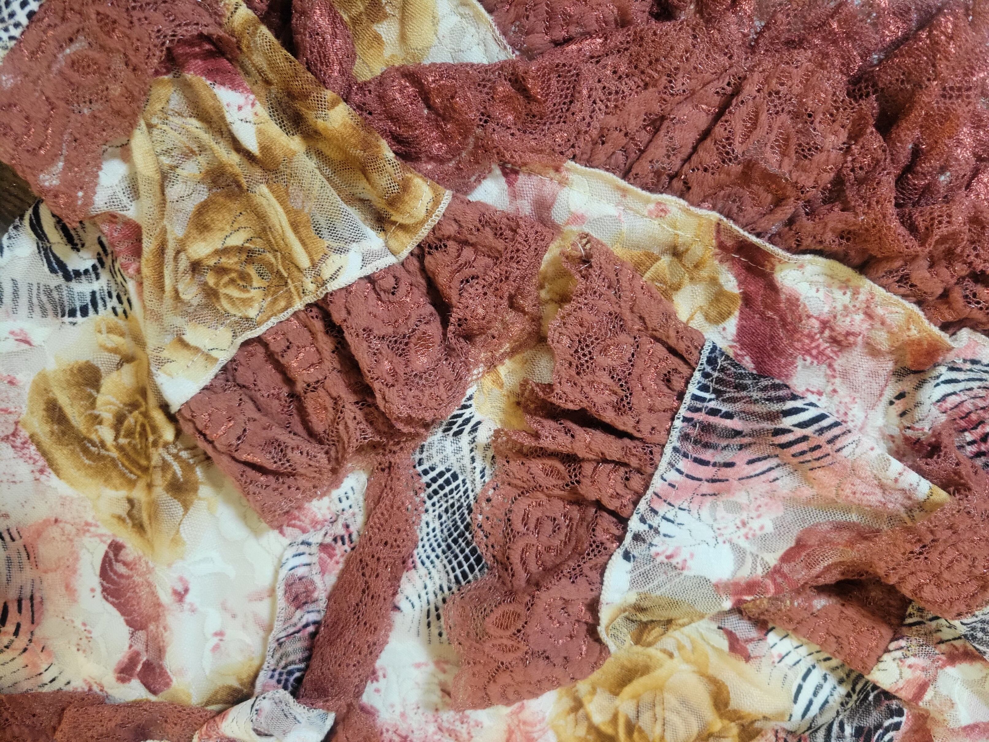 色味は、ボルドー×ホワイト×ブラック。アウトラインのフリル、なんともいえないお花の柄がめを引きます。襟部分にはパールがあしらわれていたりとユニークな一着です。流行りのY2Kなスタイリングにもぴったり。