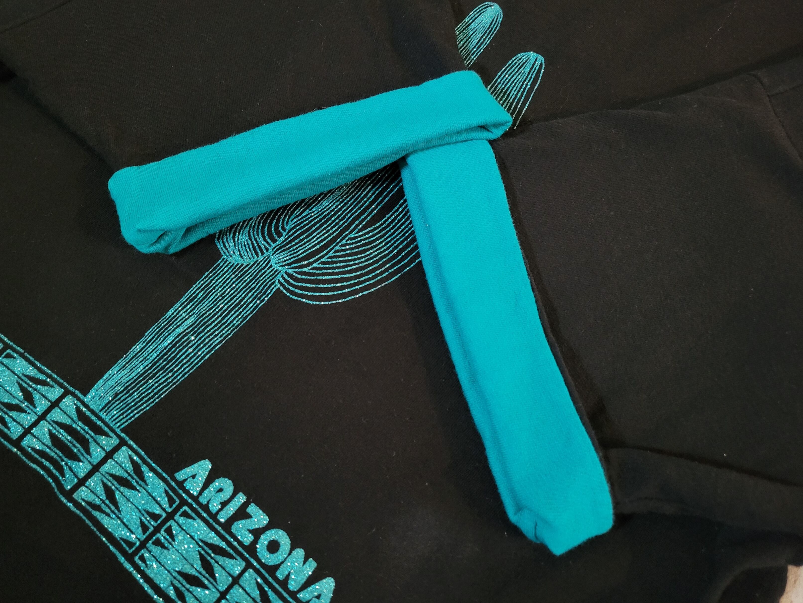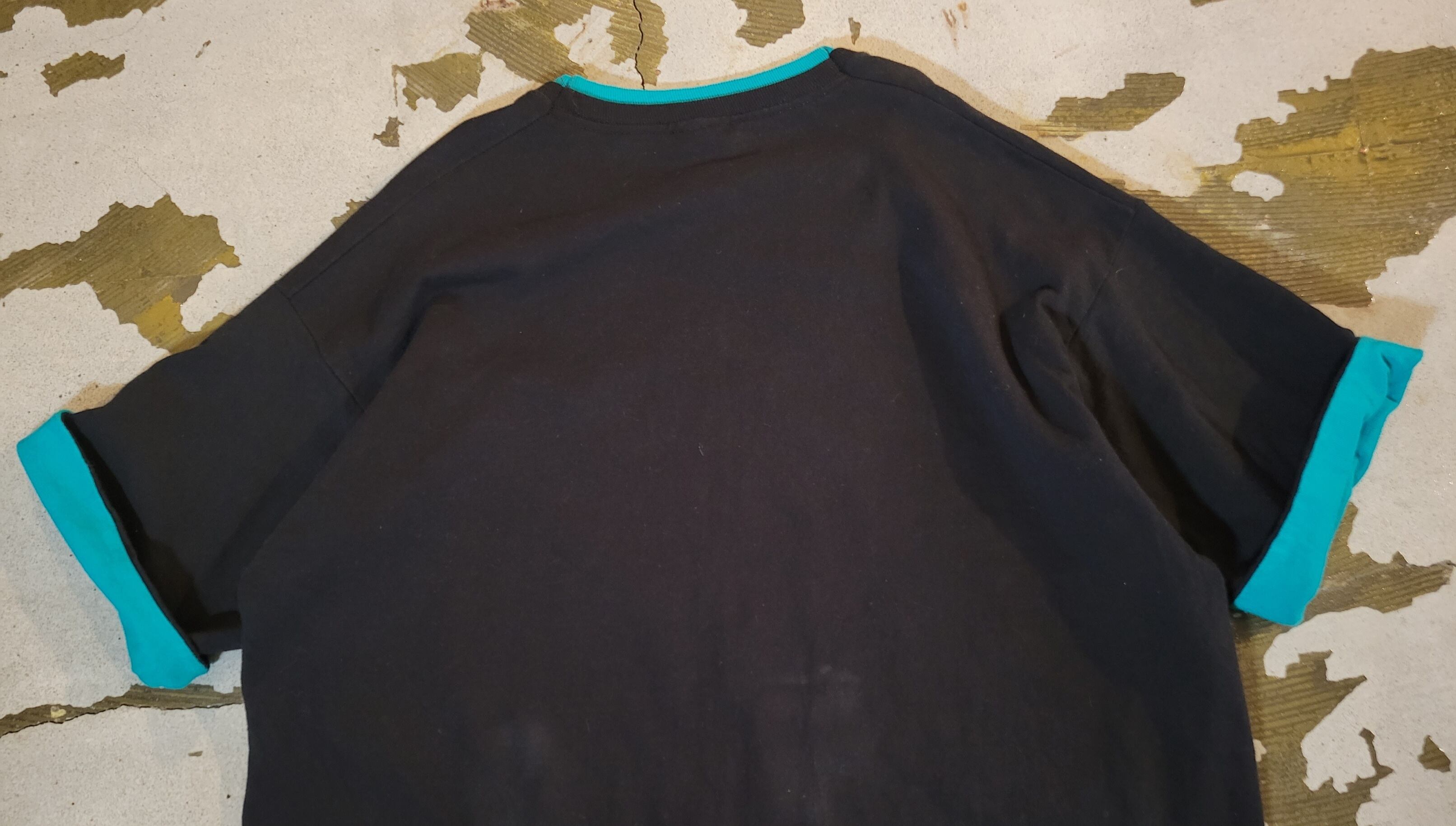 色味は、ブラック×ブルーグリーン。襟と袖部分が二重になっており、好きな幅で折り返してチラ見せで着るのが◎また、なんといってもやはりギラギラのサボテンがかわいいです。