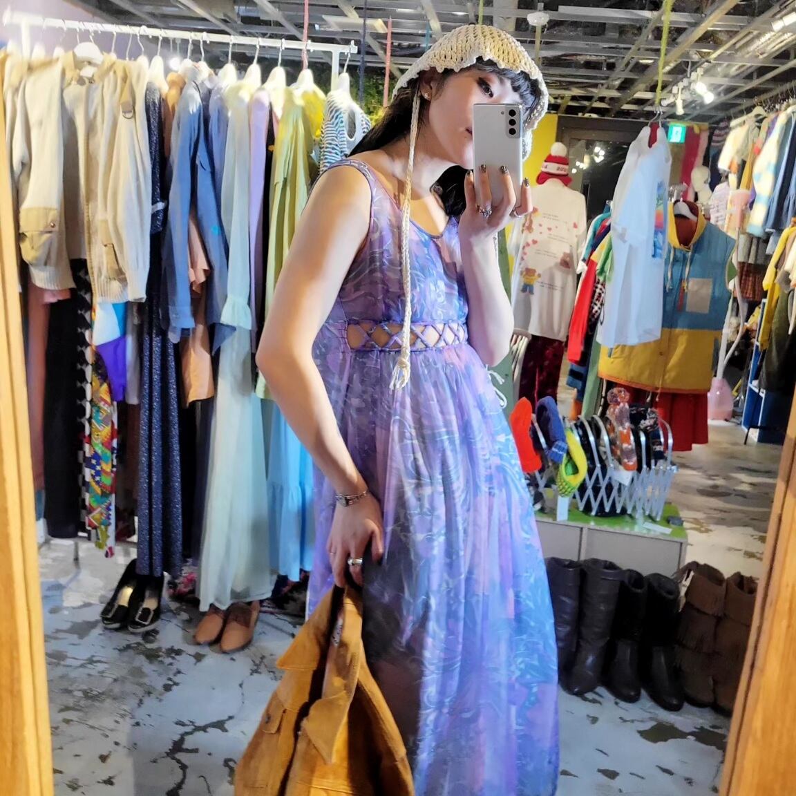 色味は、パープル×ピンク。ふんわりとした柔らかいシフォンのような素材にお花のようなマーブルのようなちょっぴりサイケなテキスタイル。ストンとしたシンプルなシルエットとウエスト部分の透かしになっているデザインがグッと来ます。