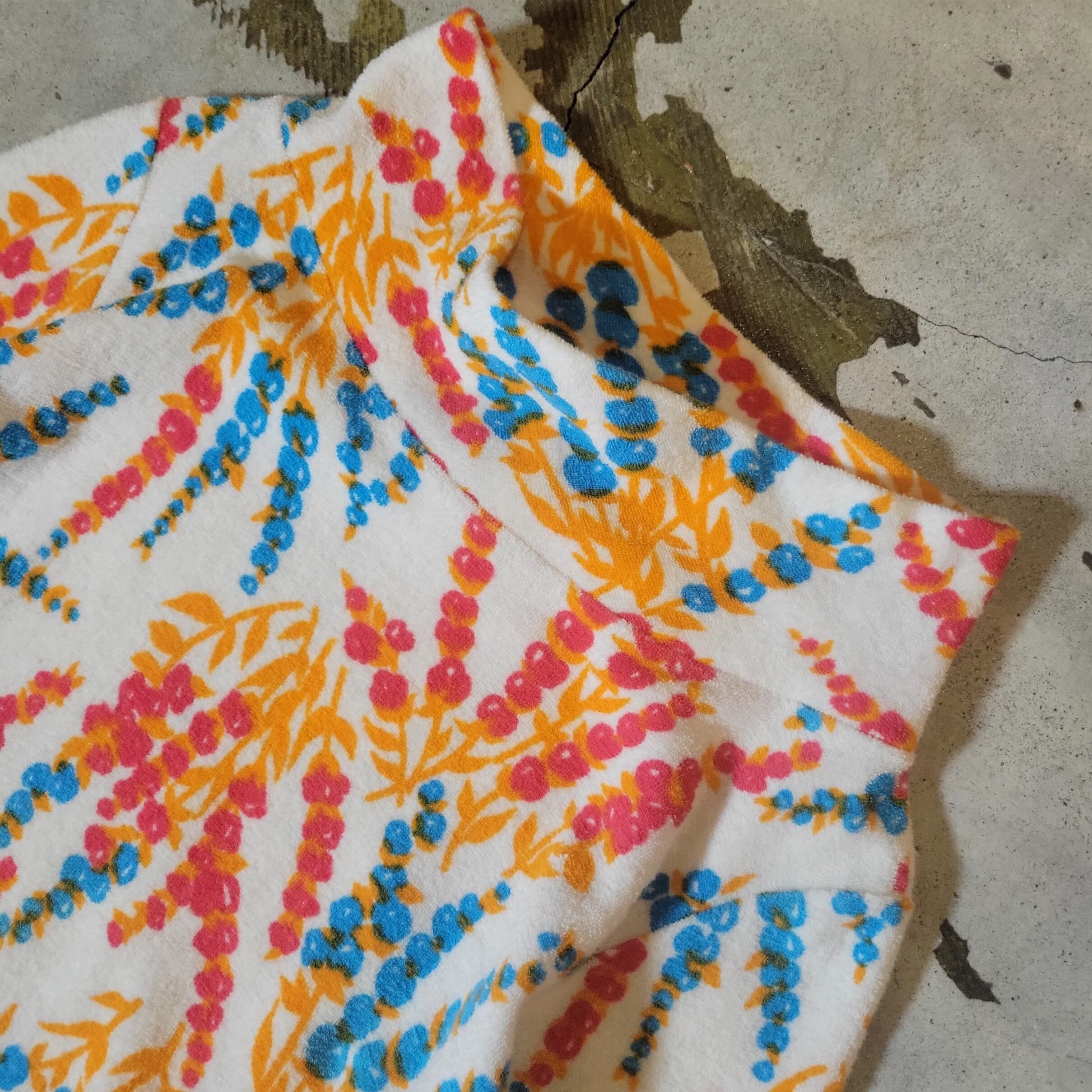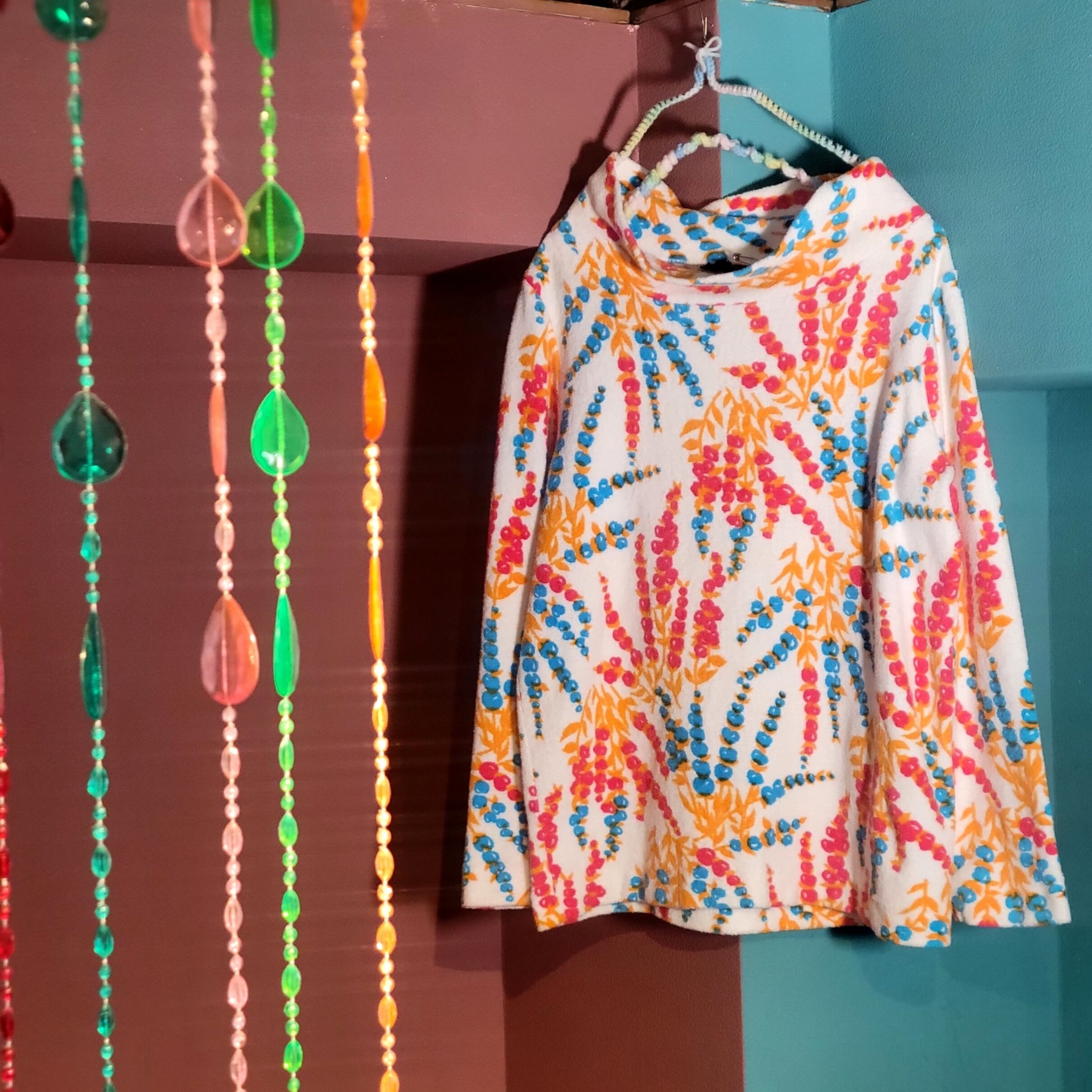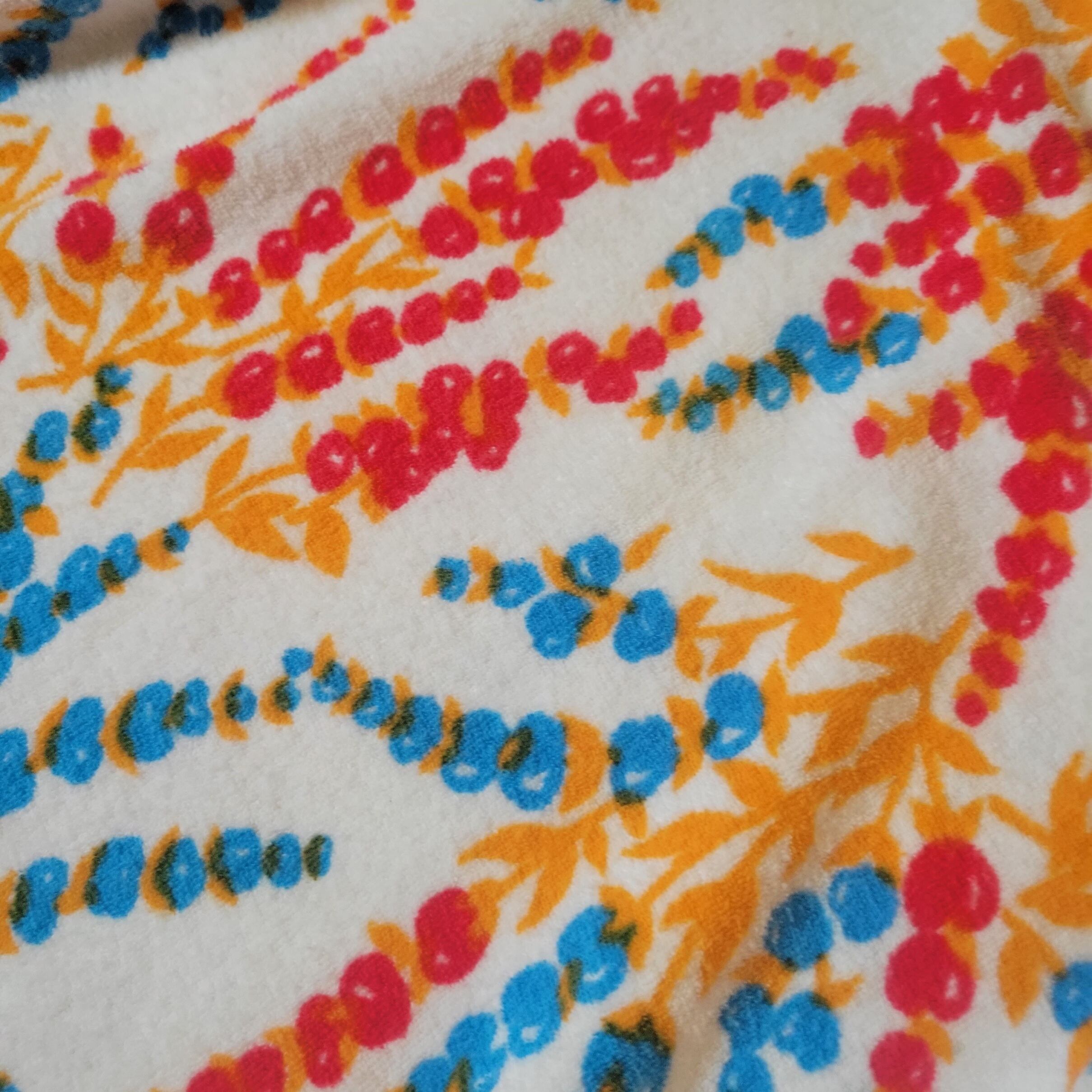 色味は、ホワイト×オレンジ×レッド×ブルー。ふわふわとしたならではの質感と可愛らしいカラーリングが魅力的。木の実のような総柄やゆったりとした襟部分のデザインなども可愛らしくて◎デニムなどと合わせるだけでも華やかになります。