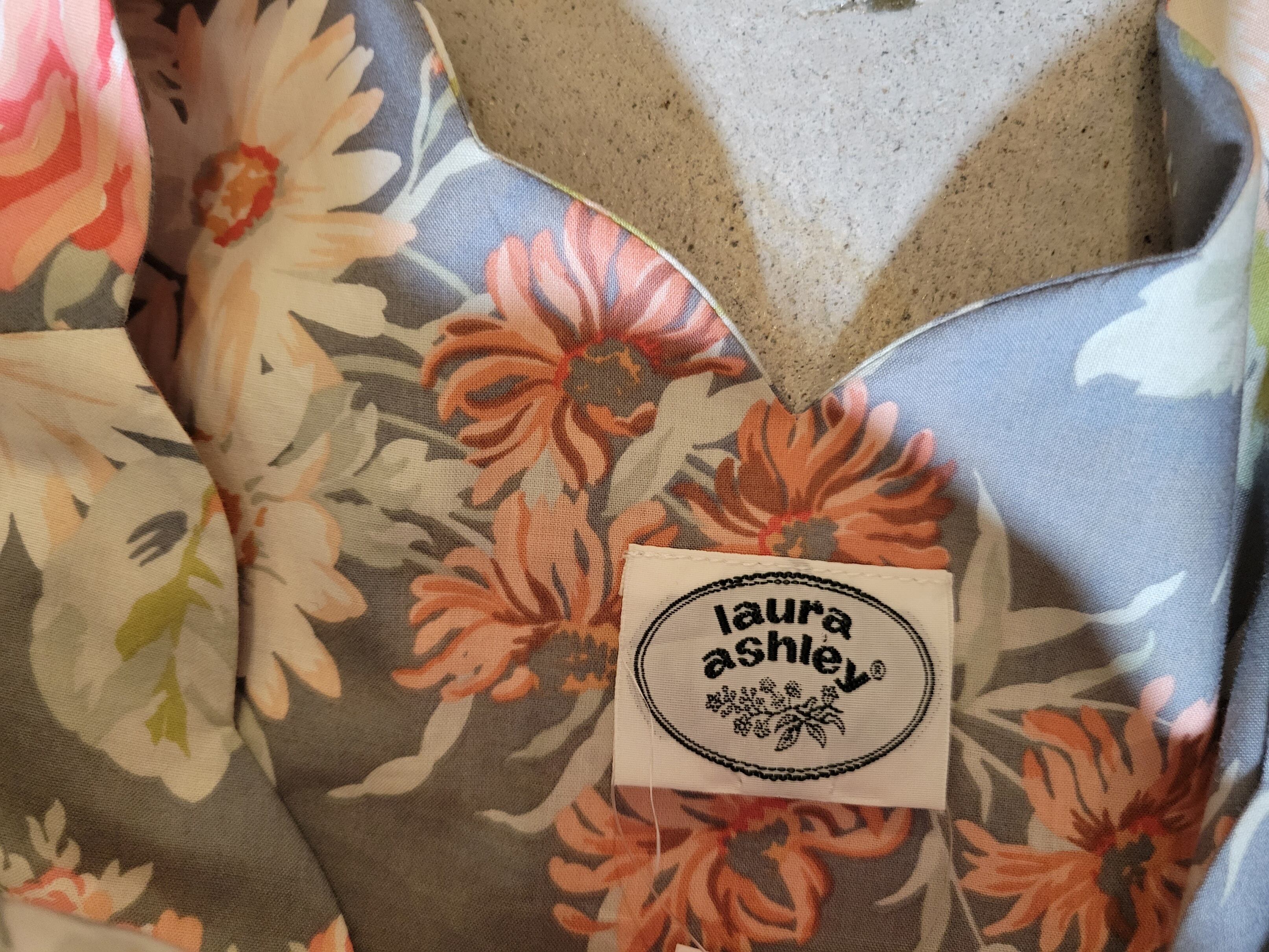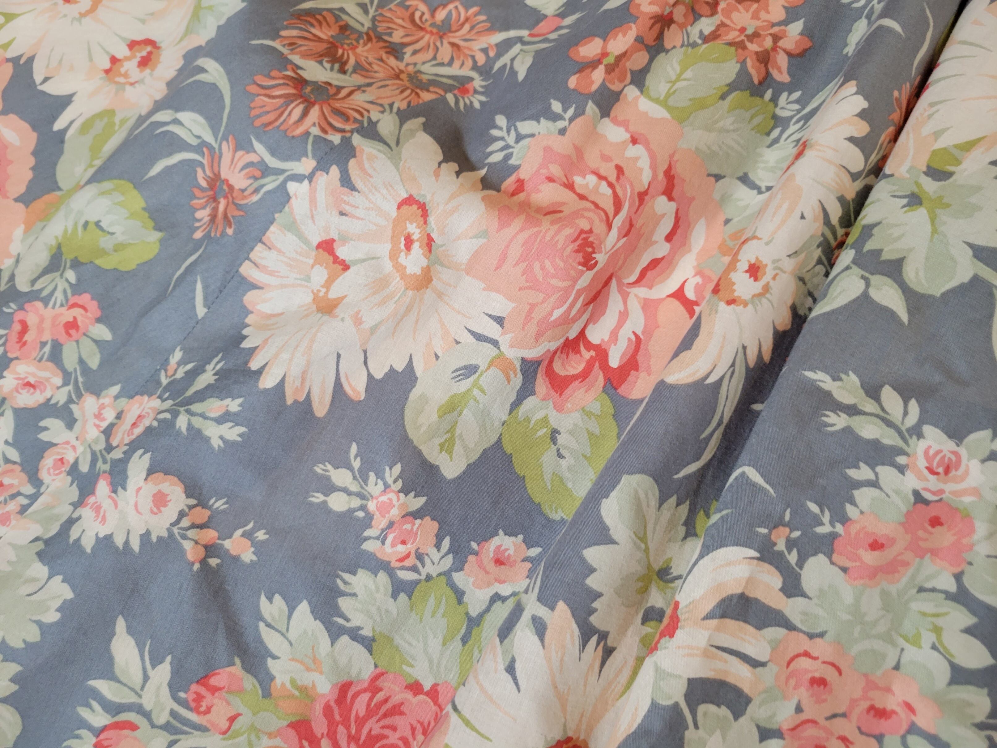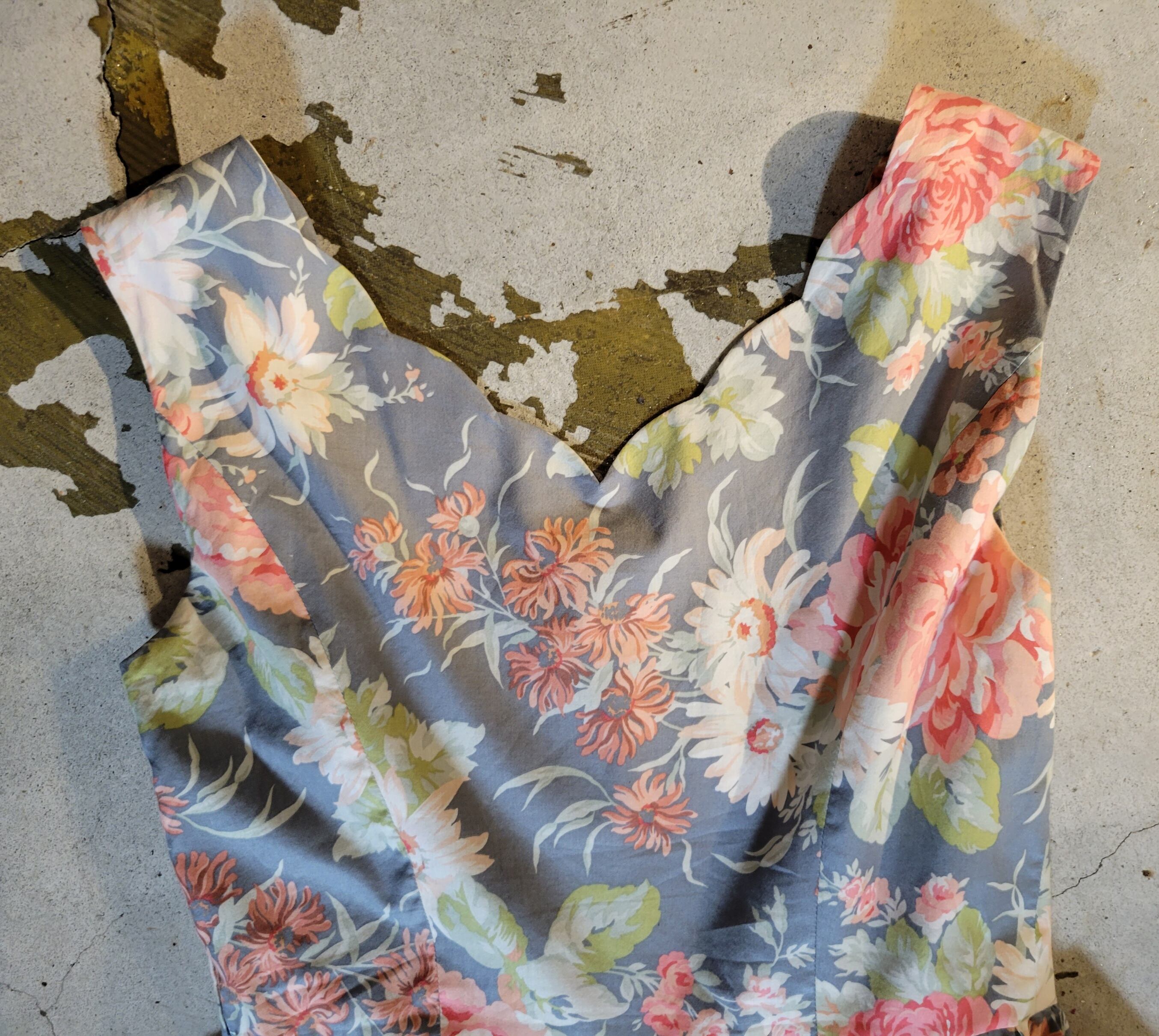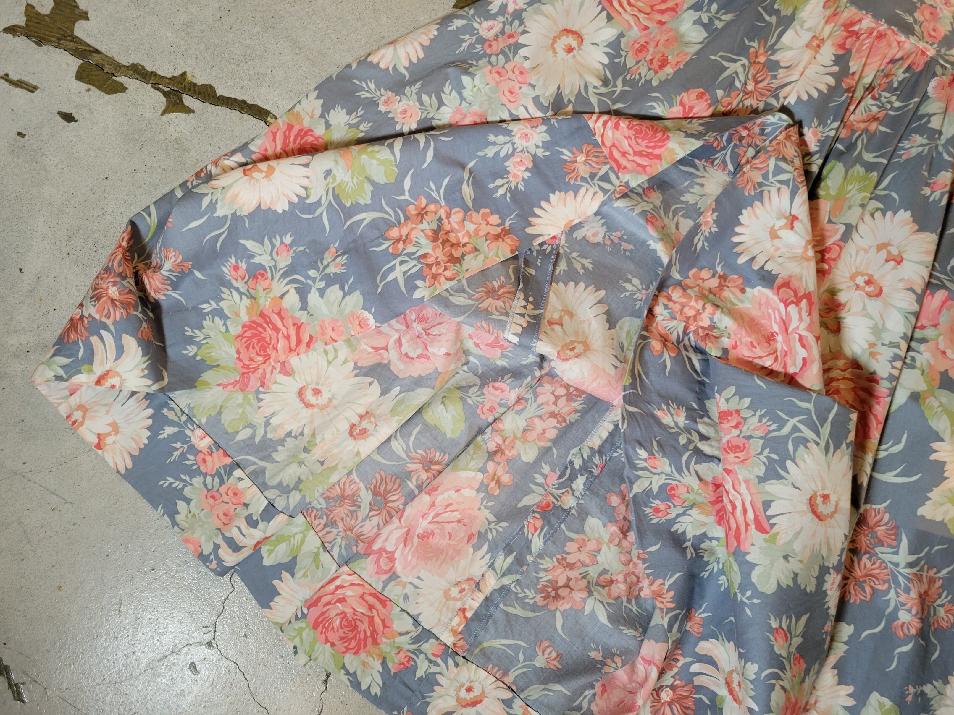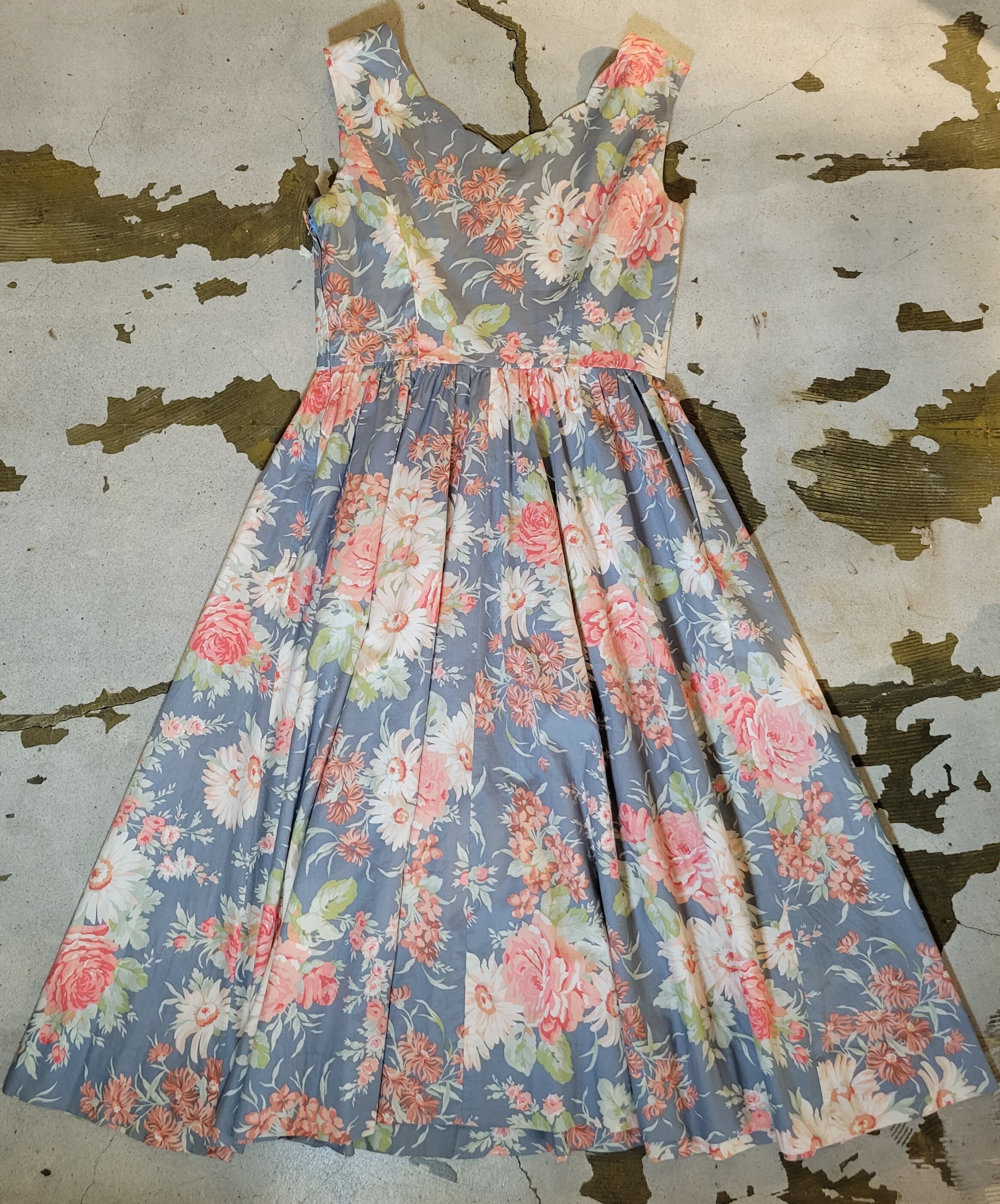 色味は、アイスブルー×ピンク×グリーン。柔らかく優しい雰囲気のカラーリングにリアルなお花の模様がとっても素敵な一着です。ウエストのギャザーでうまれるふんわりとしたAラインのシルエットや、襟部分のスカラップになっているデザインもお上品。