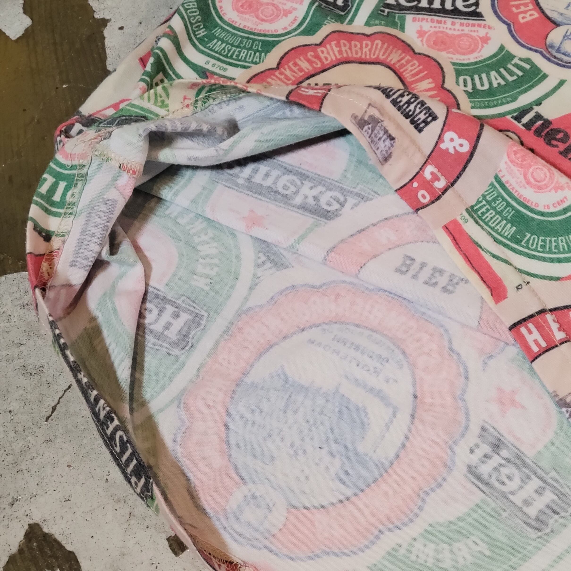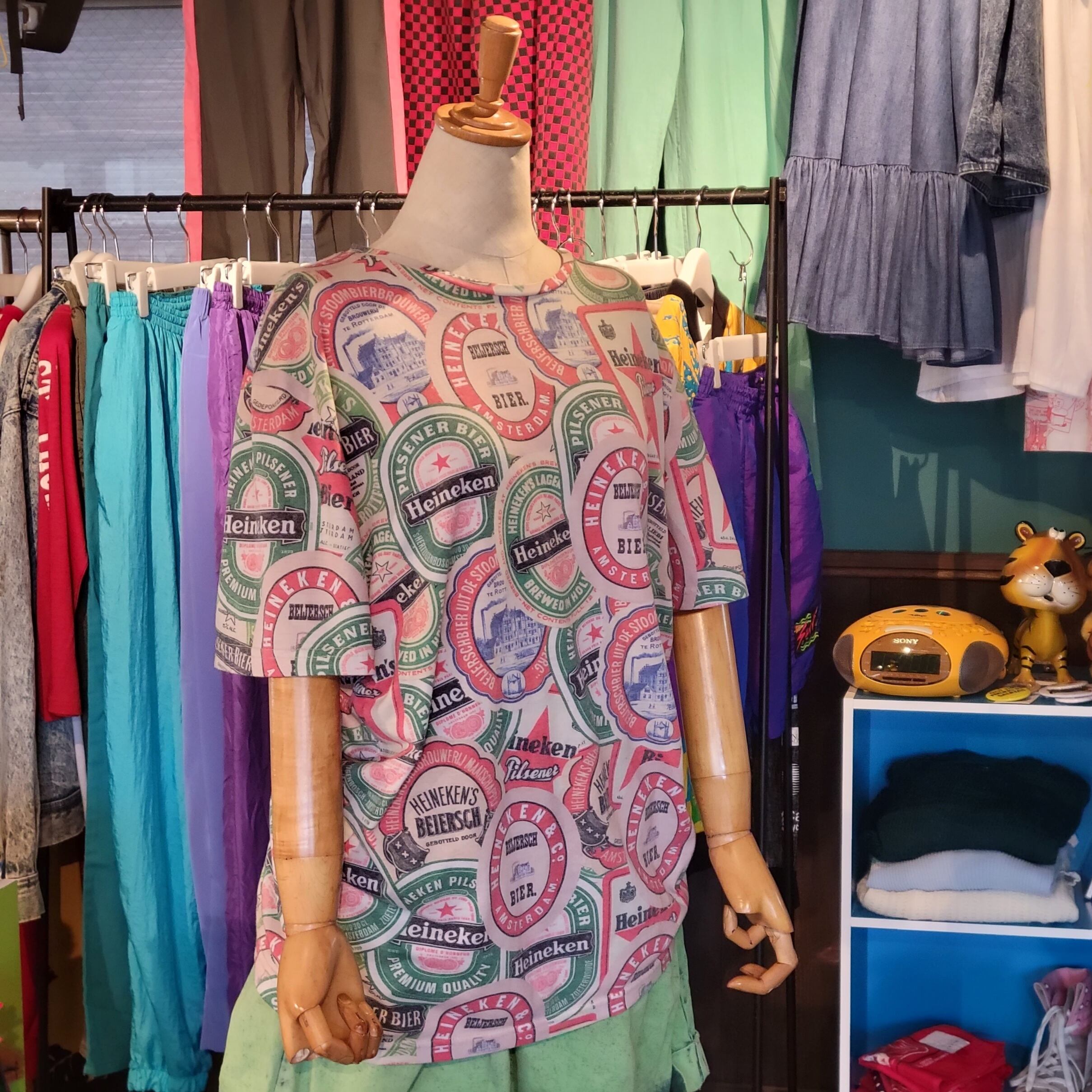 色味は、ベージュ×グリーン×レッド×ブルー×ブラック。インパクト大の総柄が魅力的。そのままペロッと着てもレイヤードしても面白いスタイリングが出来ます。グビッと行きたい夏に酒飲みさんが着るのも、あえて下戸さんが突っ込みまちするのも楽しそう。