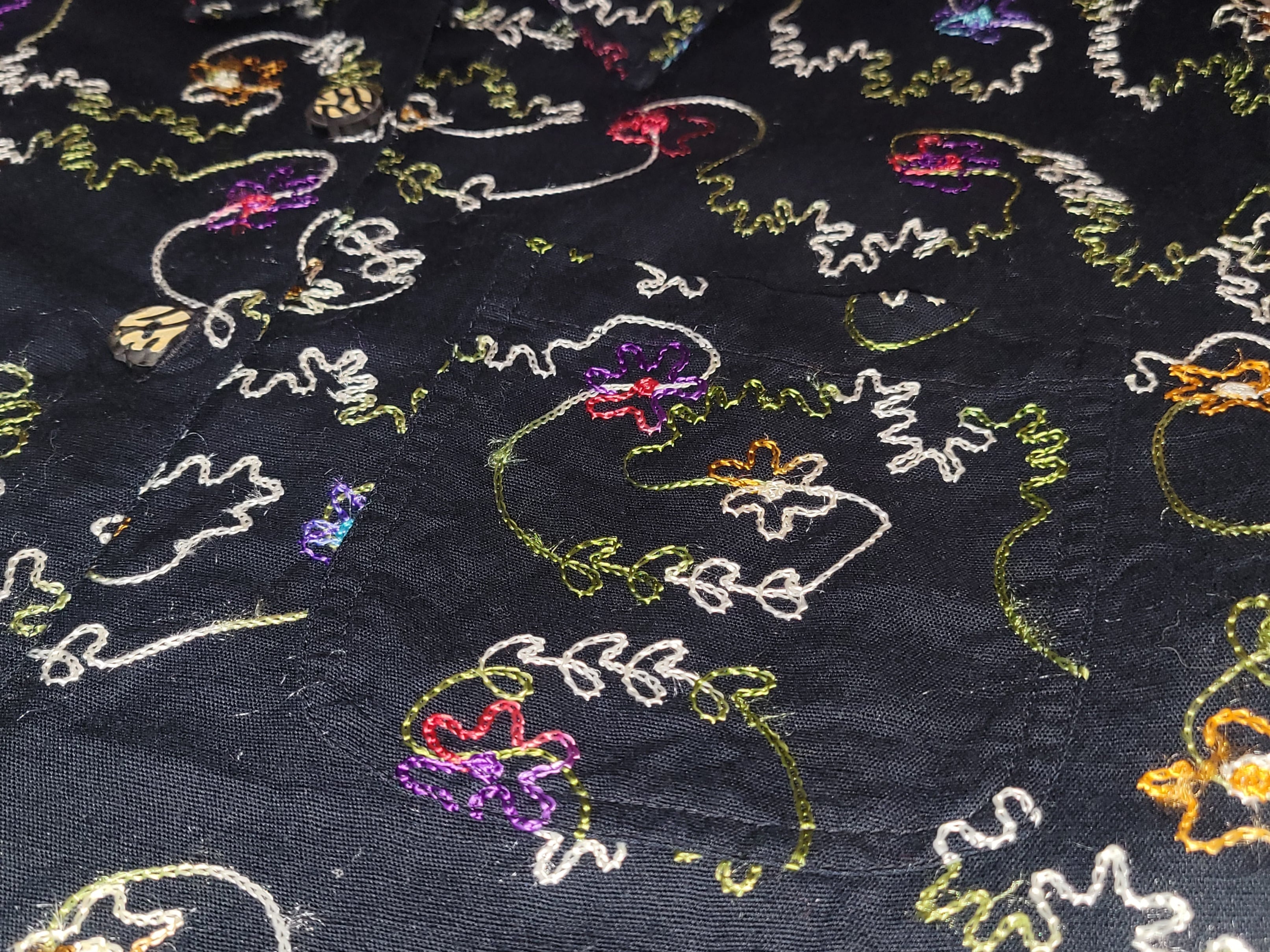 色味は、ブラック×ホワイト×ブルー×グリーン×レッド×オレンジ。全面に入った繊細な刺繍のインパクトが素敵。ブラックベースで大人っぽくアクセント的に着るのがおすすめ。ちょっぴりチャイナな雰囲気もありデニムなどのデイリーなアイテムにプラスするだけでも気分を変化させてくれます。軽さもあるので通年使いやすいのも◎