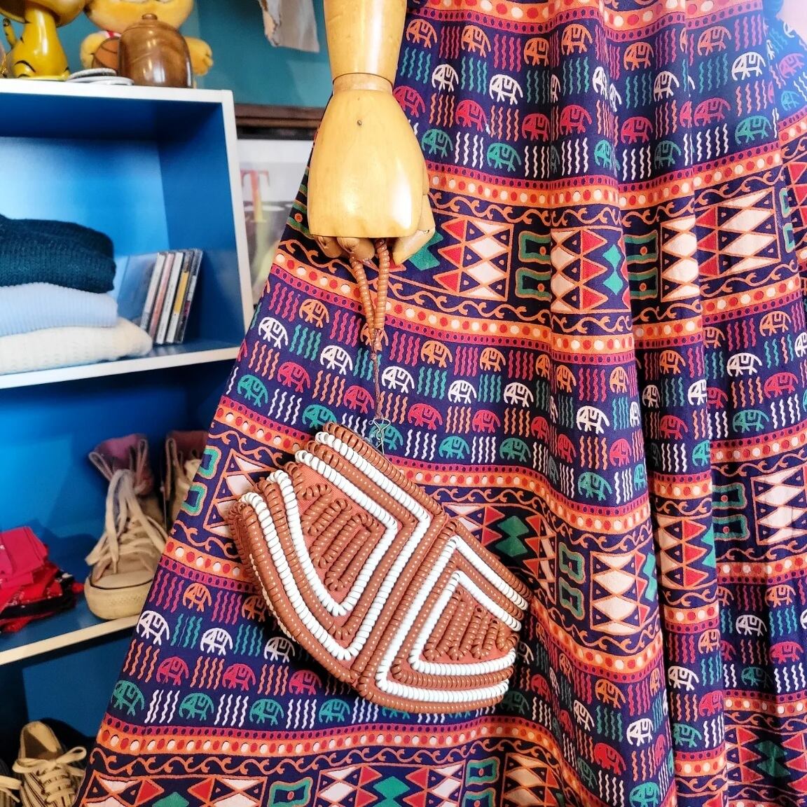 色味は、ネイビー×グリーン×オレンジ×ホワイト×レッド。象形文字のような壁画のようなテキスタイルがなんだかスパイシー。シルエットもストンとせずにフレアでたっぷりと使われたスカート部分の生地がふわりと落ちます。