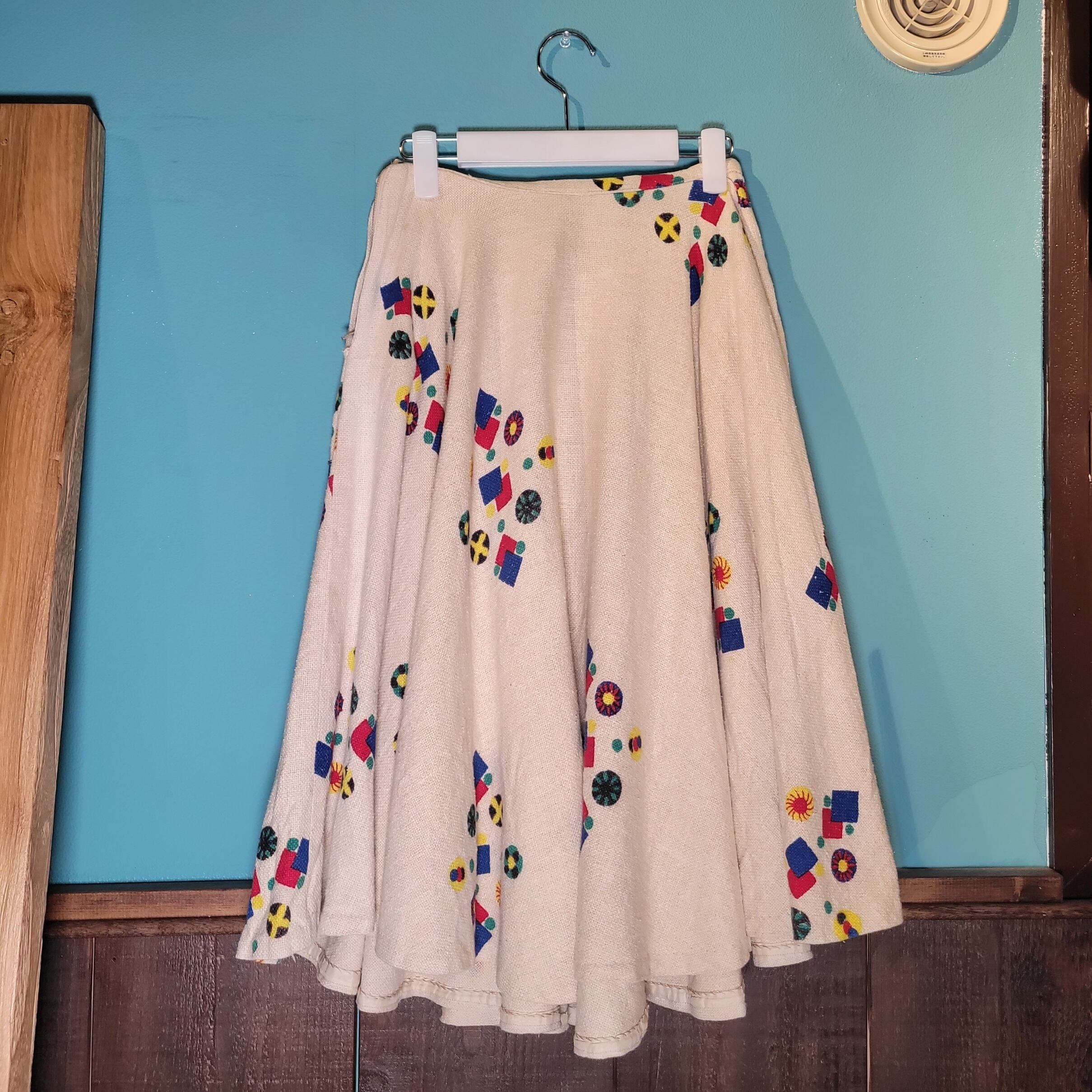 色味は、ベージュ×ブルー×イエロー×レッド×グリーン。がさっとした古いコットンやリネンのようなしっかりした素材感。昭和レトロな雰囲気のプリントと