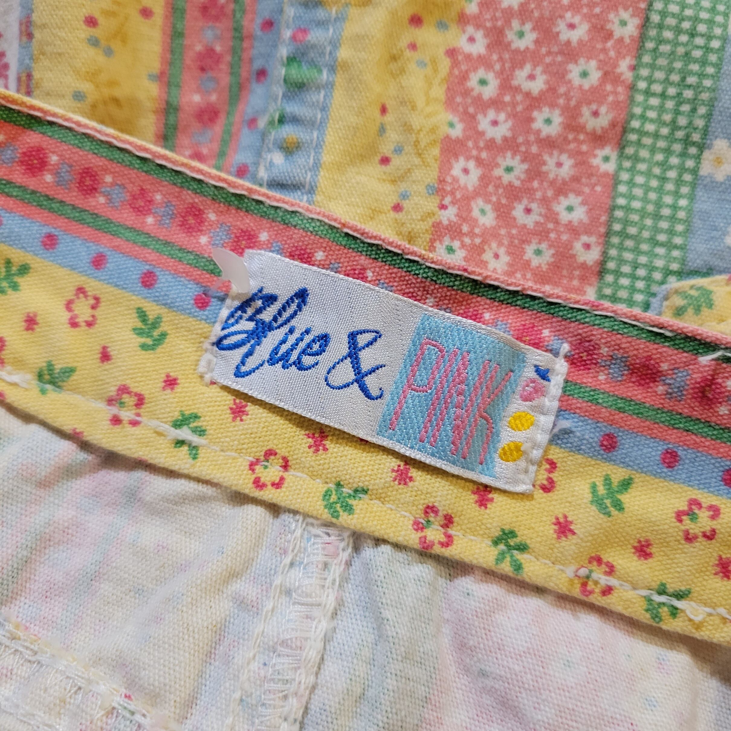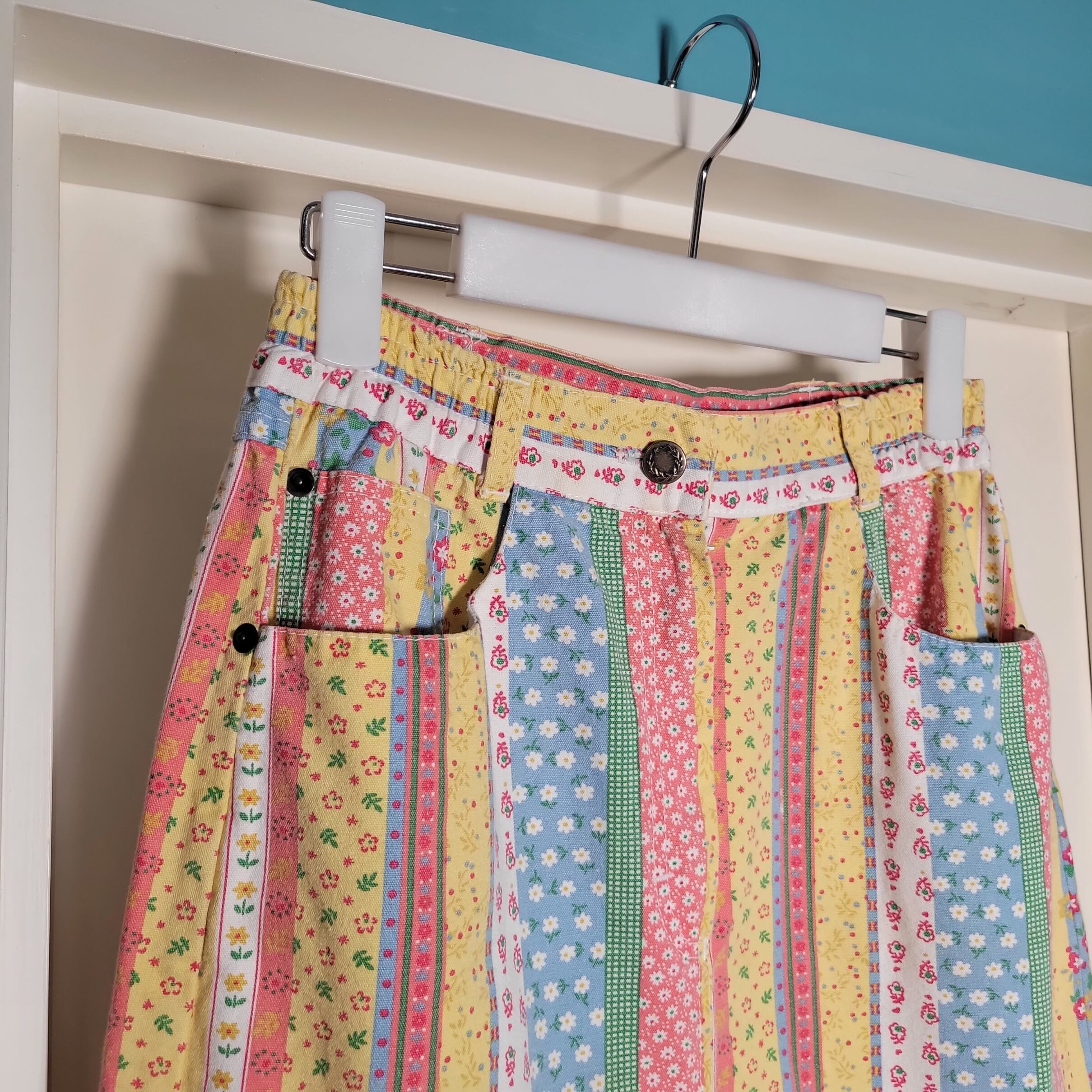 色味は、ピンク×イエロー×ホワイト×ブルー×グリーンなどなど。パステルカラーでいろいろなお花がプリントされたパッチワーク風のテキスタイルがとってもポップでキュート。スクエアタイプのスカートでコンパクトに着られます。