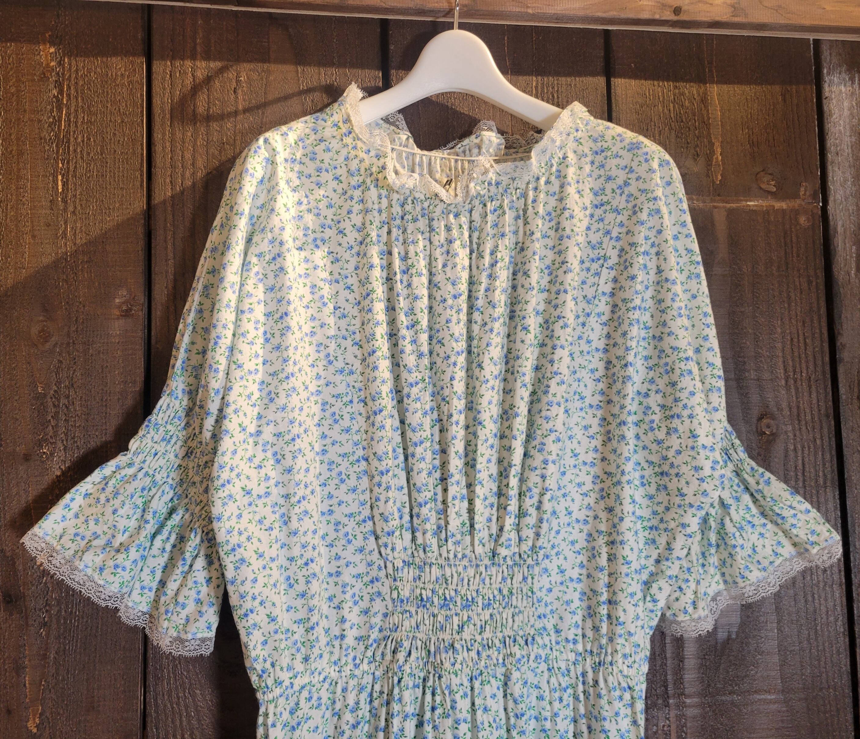 色味は、ホワイト×ブルー×グリーン。細やかな花柄や繊細なレースが儚げで可愛らしい雰囲気。ウエスト部分のシャーリング、そでもとのきゅっとくびれたデザインなど随所へのこだわりも感じる一着です。