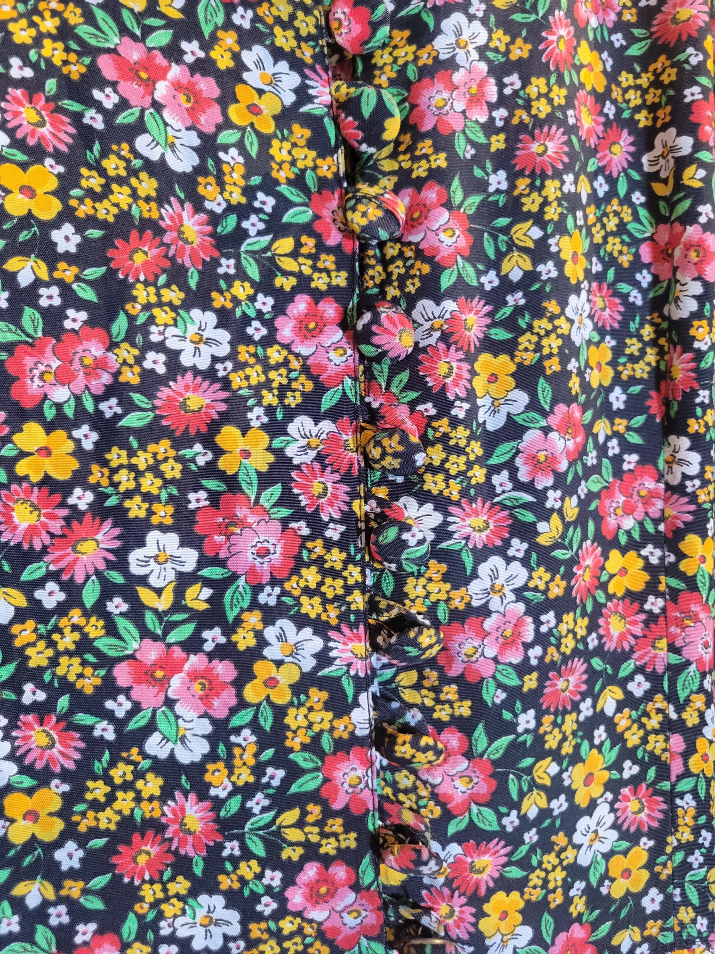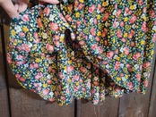 色味は、ブラック×レッド×イエロー×グリーン×ホワイト。細かなお花柄が全面に施された可愛げのある一着。クルミボタンがコロコロと並ぶデザインも古着らしい雰囲気があって素敵です。メッシュのトップスなどを重ねても◎