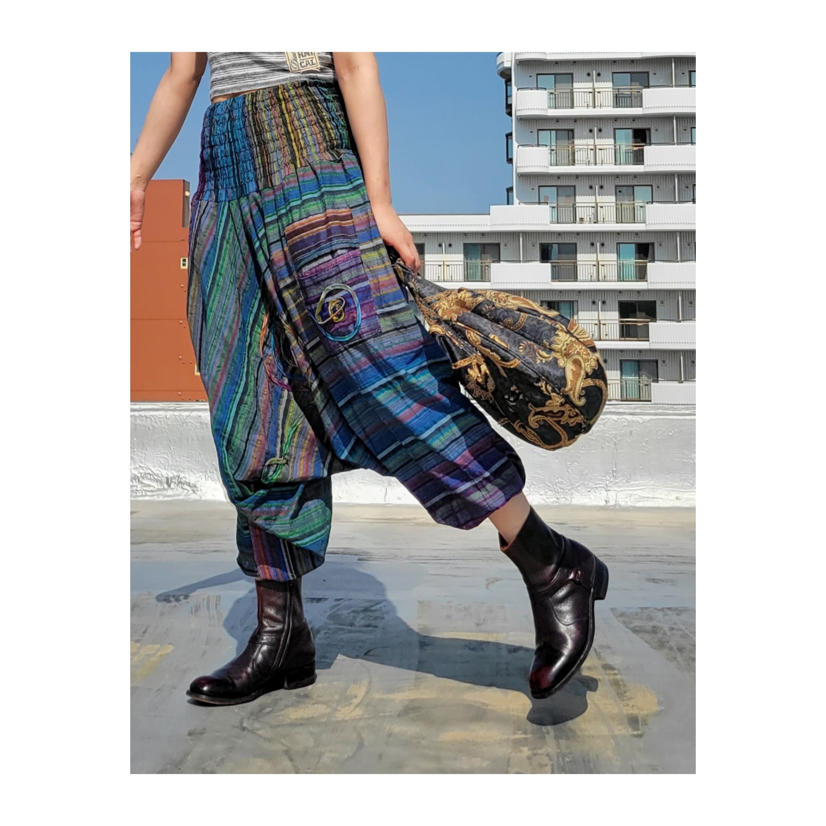 色味は、ネイビー×グリーン×パープル×オレンジなどなど。こすけ感のあるカラフルな色味とユニークな渦巻き模様はサルエルパンツの不思議なシルエットにピッタリ。暑い日でも陽気になりそうな一着です。エスニックな着こなしは勿論、ジャケットやブーツの合わせにハズしとして着るのもおすすめ。