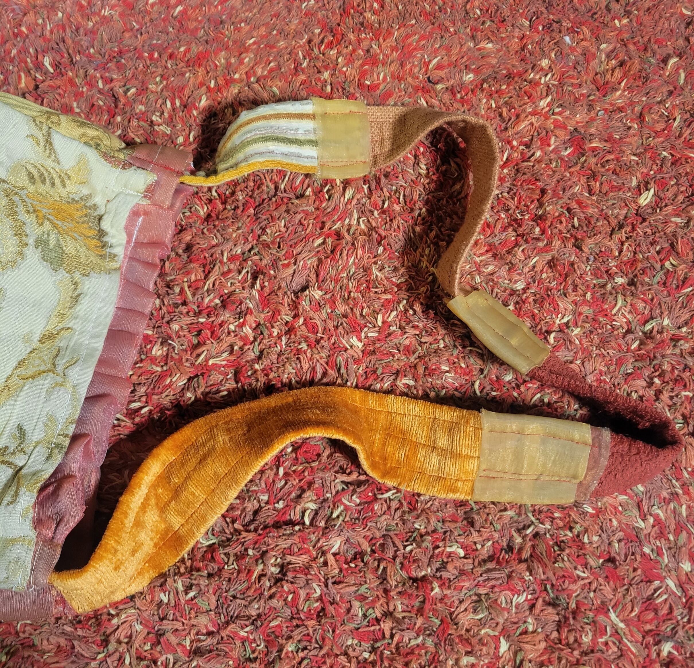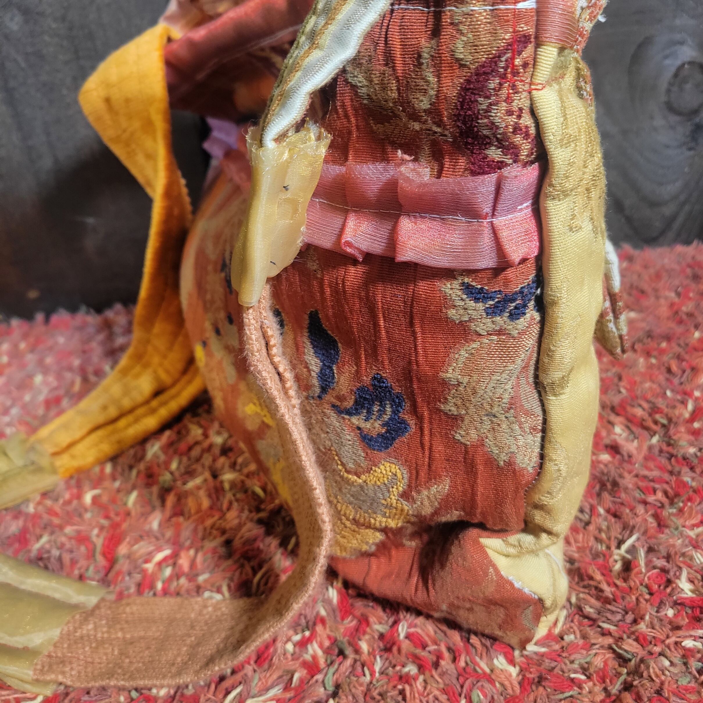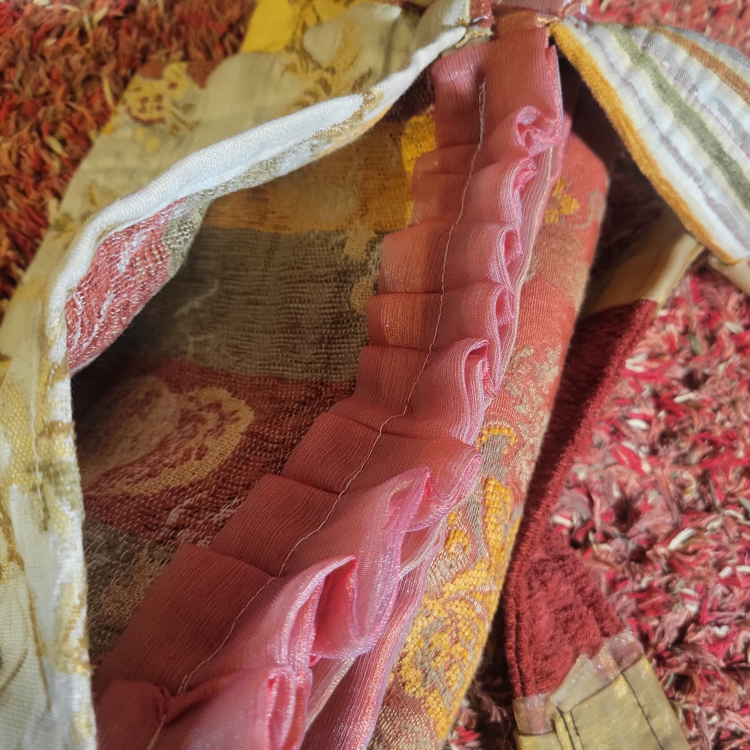 ヌーディーなカラーリングといろいろな生地、透け感のあるフリルがアクセントに施された一点。ハンドメイドならではの拙い部分はあるもののそこも味。何よりも柄や色の組合せのセンスに羨ましささえ感じます。