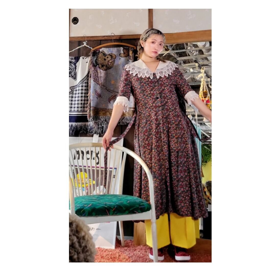 色味は、ブラック×ホワイト×いろいろ。ギュギュっとひしめく一面のお花、ブラックベースに細やかなお花、ギザギザとしたレースの襟で少女っぽい無邪気さと大人っぽい感じのの狭間のようななんともいえない雰囲気があります。レーヨンだからこその軽やかさも◎