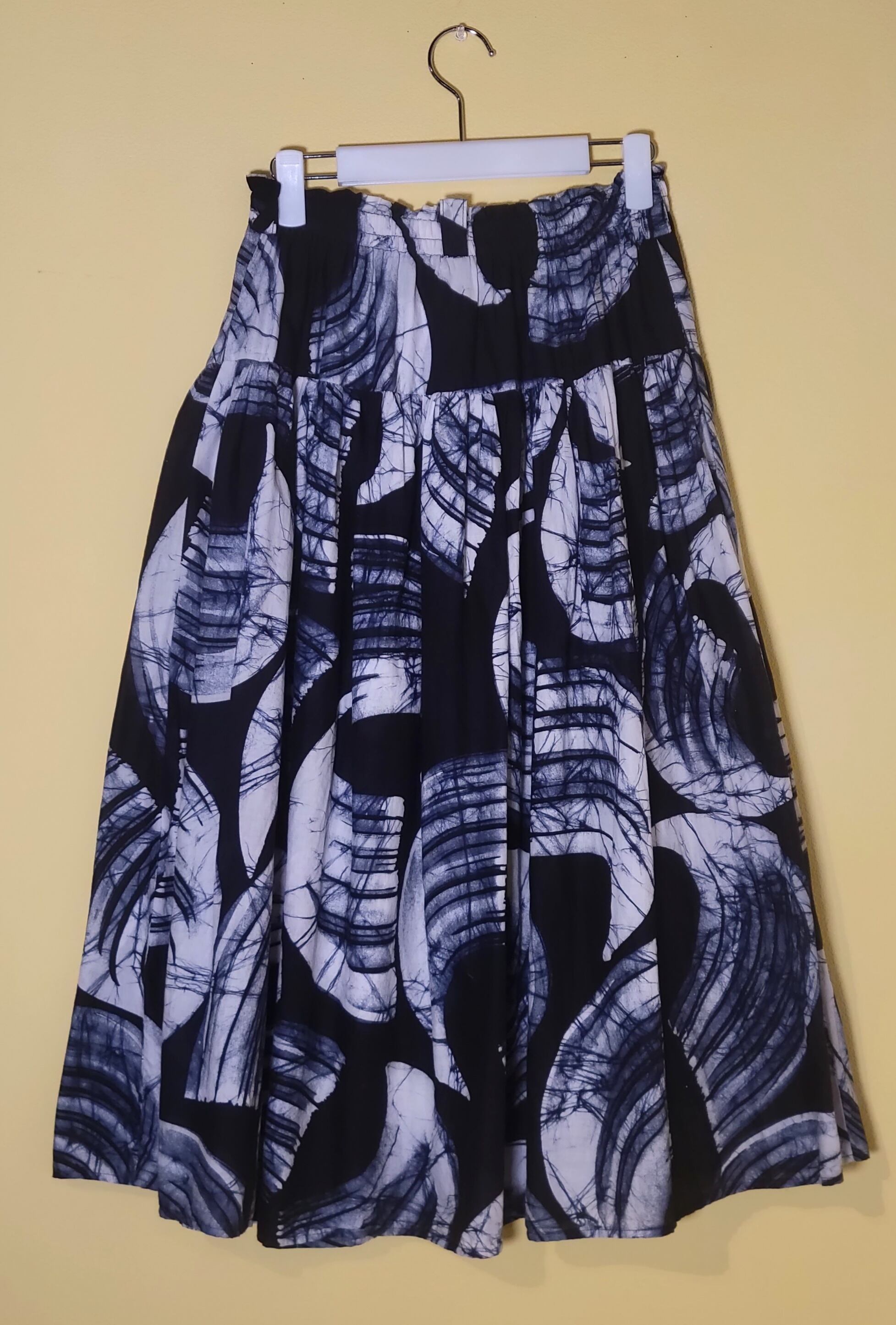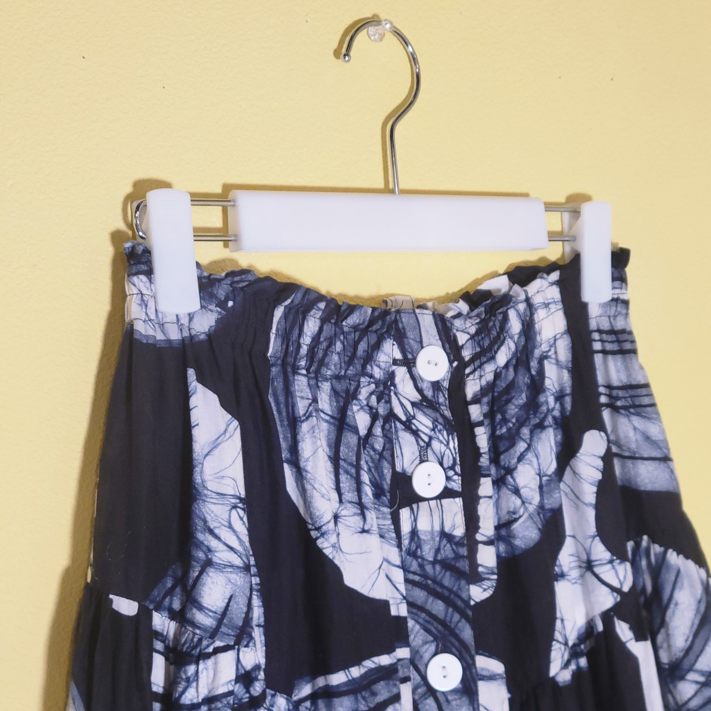 色味は、ブラック×ホワイト。独特な染めのような柄から感じるアジアな雰囲気がなんだか素敵な一着。軽いコットンで涼しげ、風を含んでふんわりと広がるシルエットも◎
