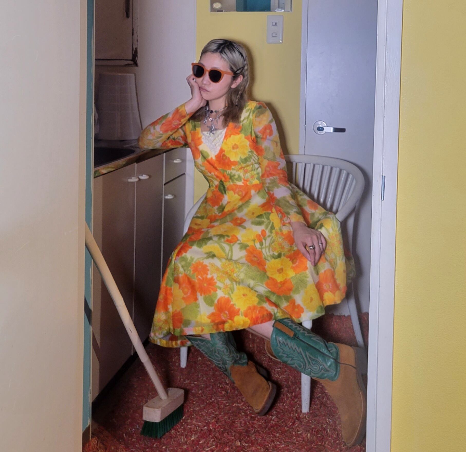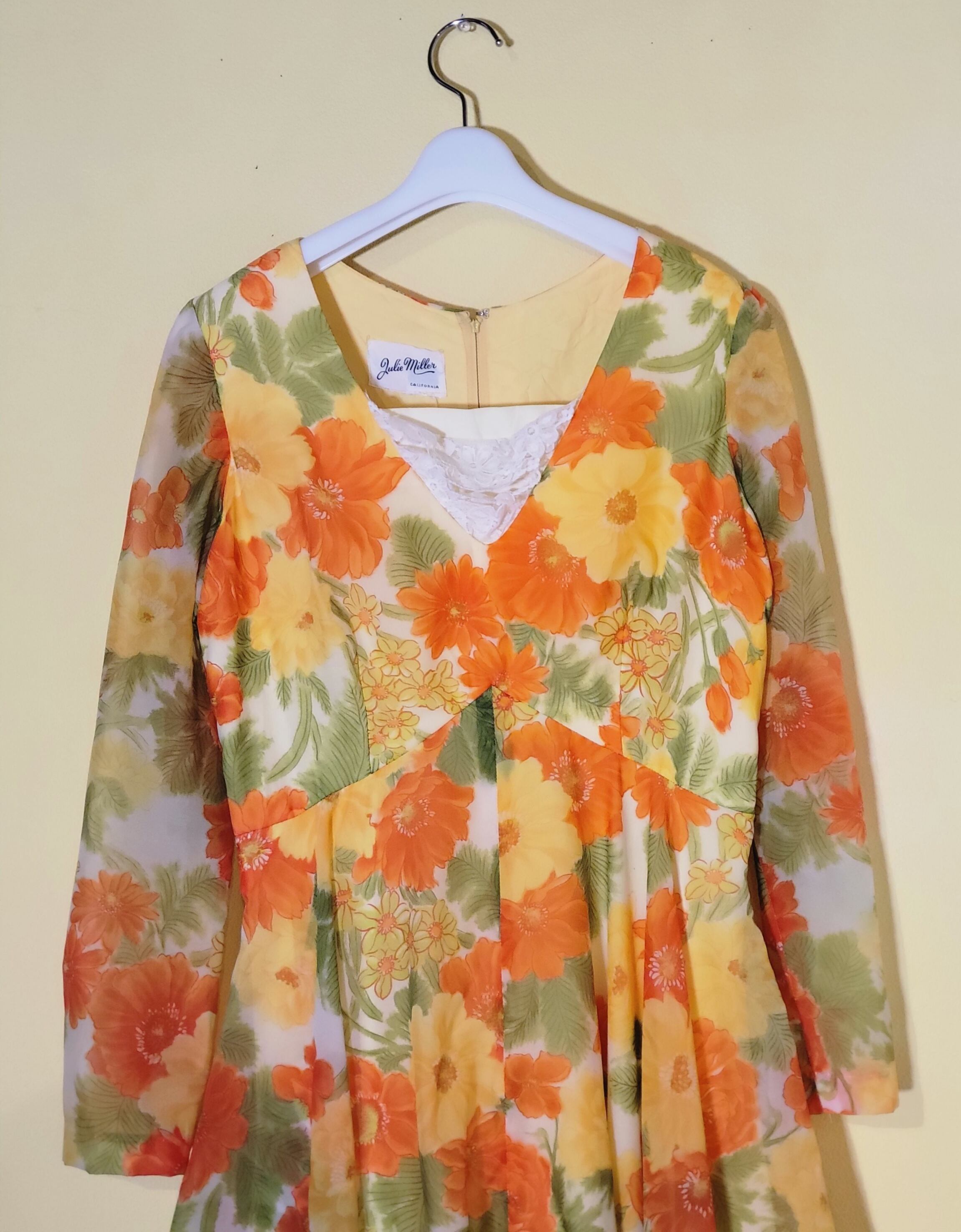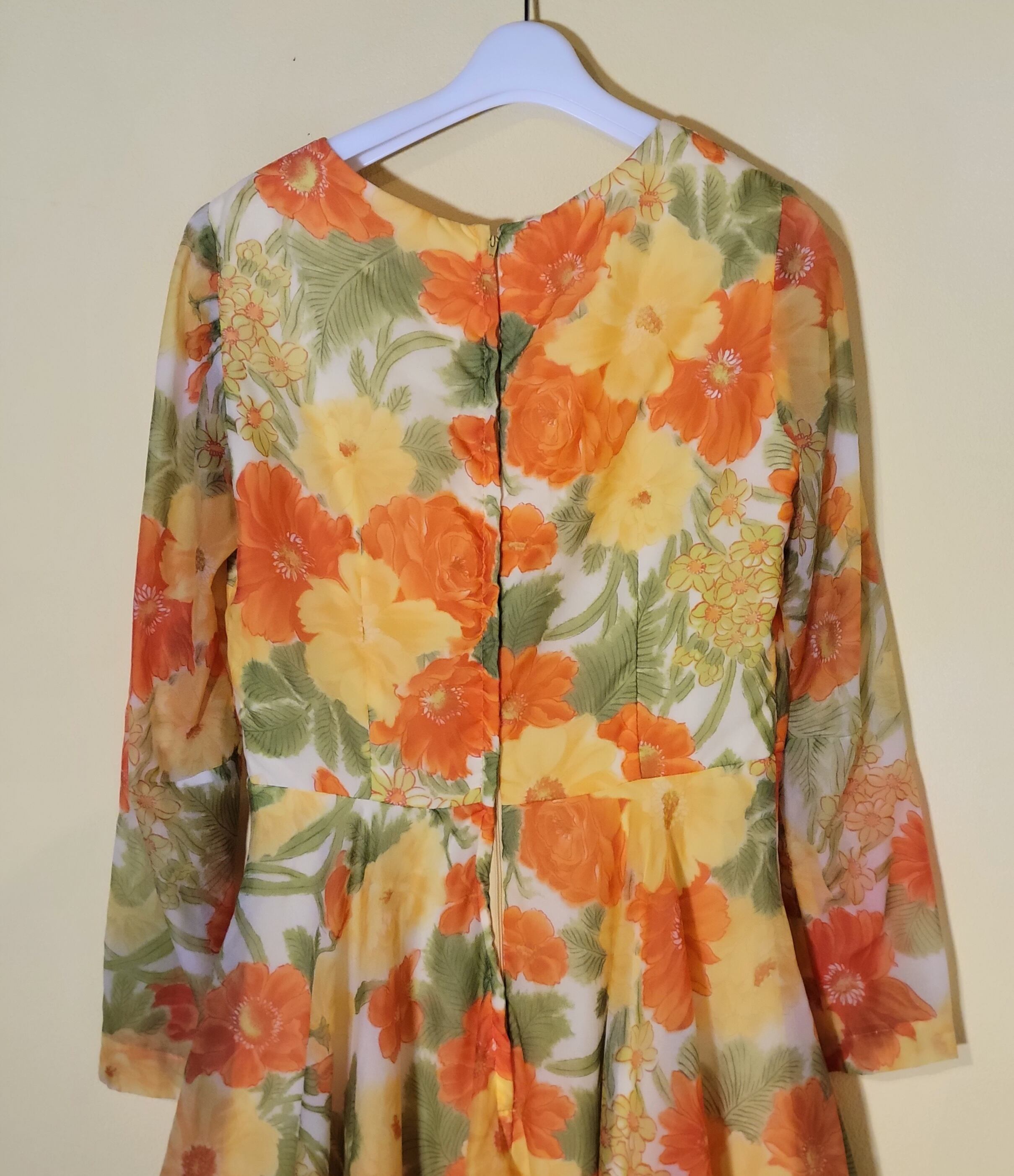 色味は、オレンジ×イエロー×グリーン×ホワイト。クラシカルなAラインのシルエット。透け感のあるビビッドなお花柄がとっても華やかかつ、スカート部分にもたっぷり使われているのでなかなか贅沢です。胸元には控えめなレースがちらり。