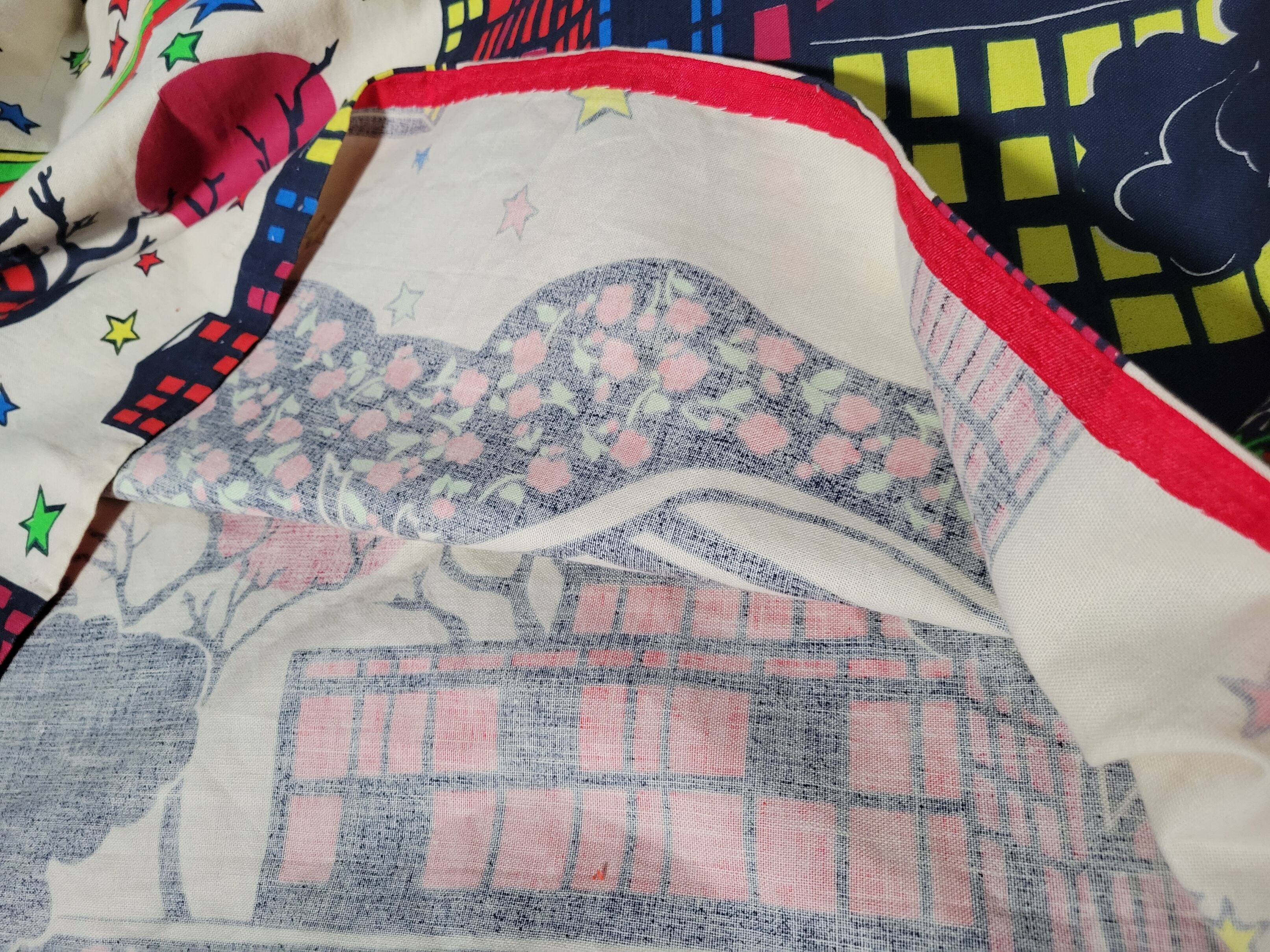 色味は、レッド×アイボリー×ブラック×ブルー×イエローなどなど。ポップでレトロな夜の町並みがプリントされたユニークな一着。ビビッドなカラーリングとかわいらしいテキスタイル。一枚さらっとにロングブーツで思い切りレトロに着るのもおすすめ◎