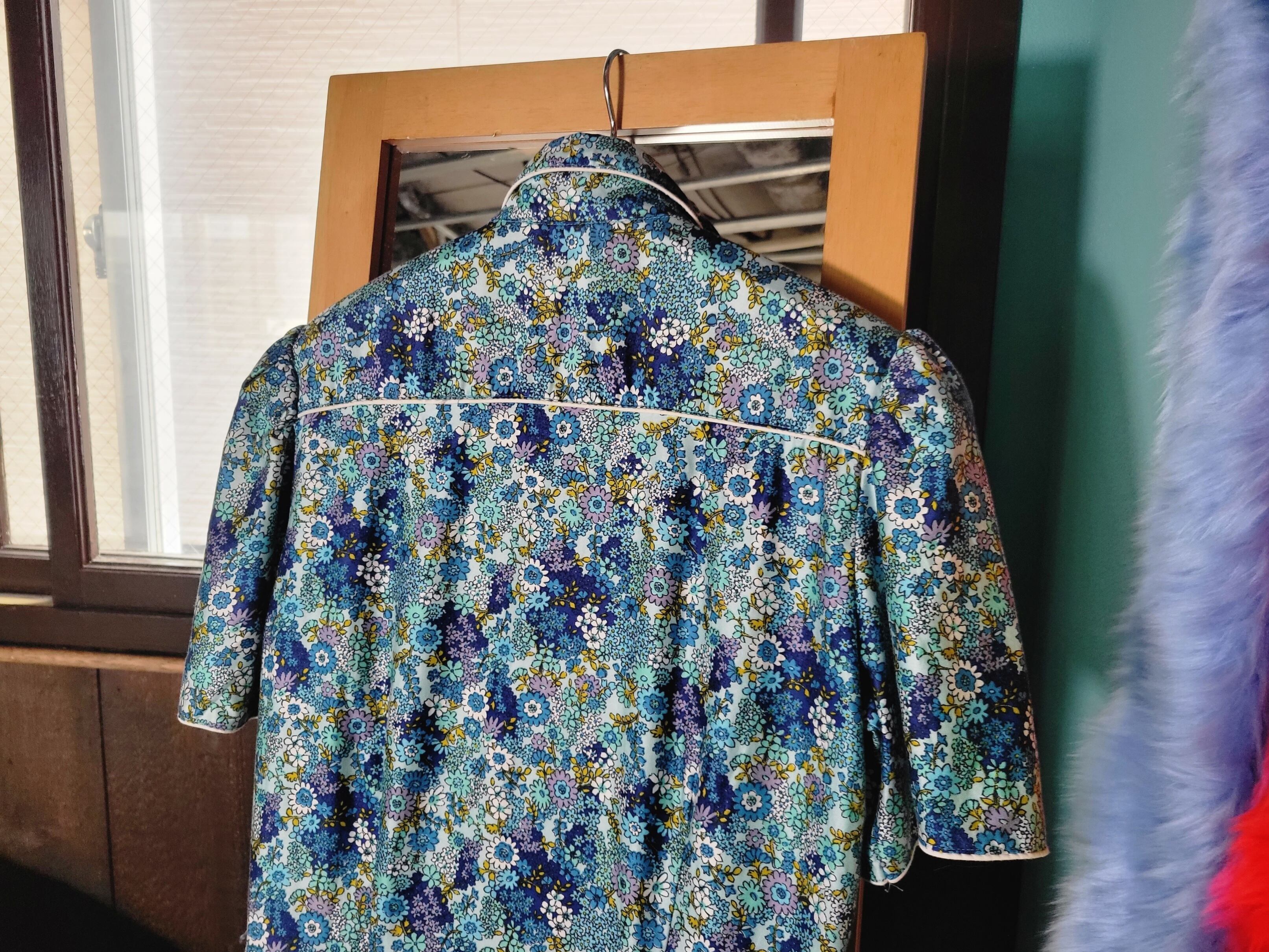 色味は、ブルー×パープル×ホワイト×グリーン。なだらかなAライン、ギュギュっとプリントされた細かいお花のテキスタイル、艶やかな素材感がとっても魅力的◎