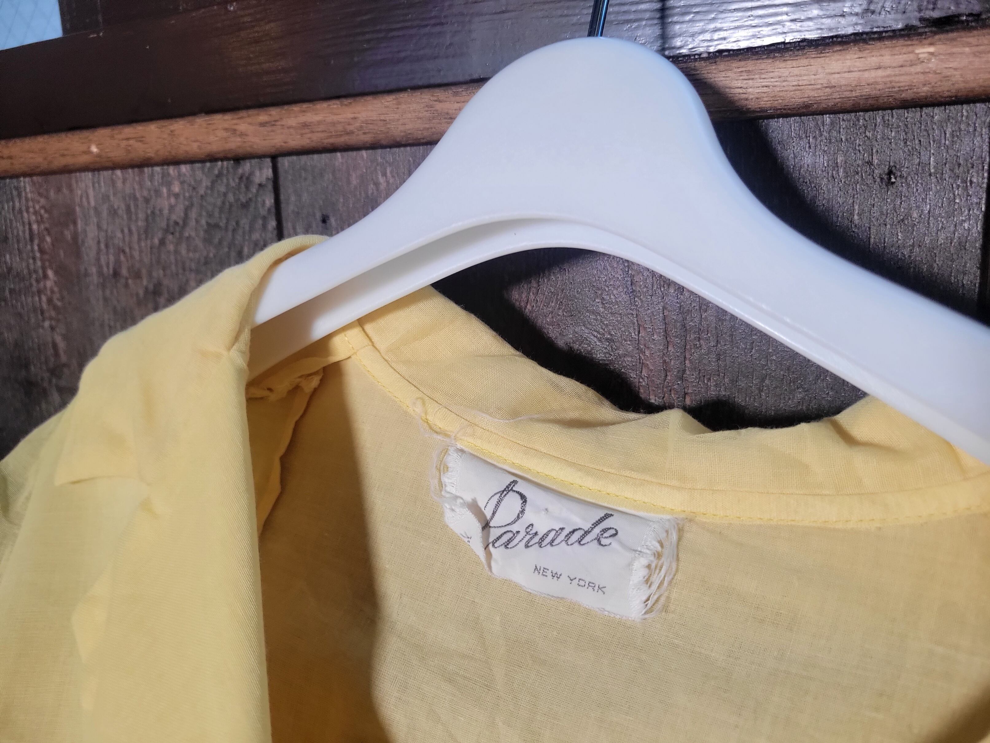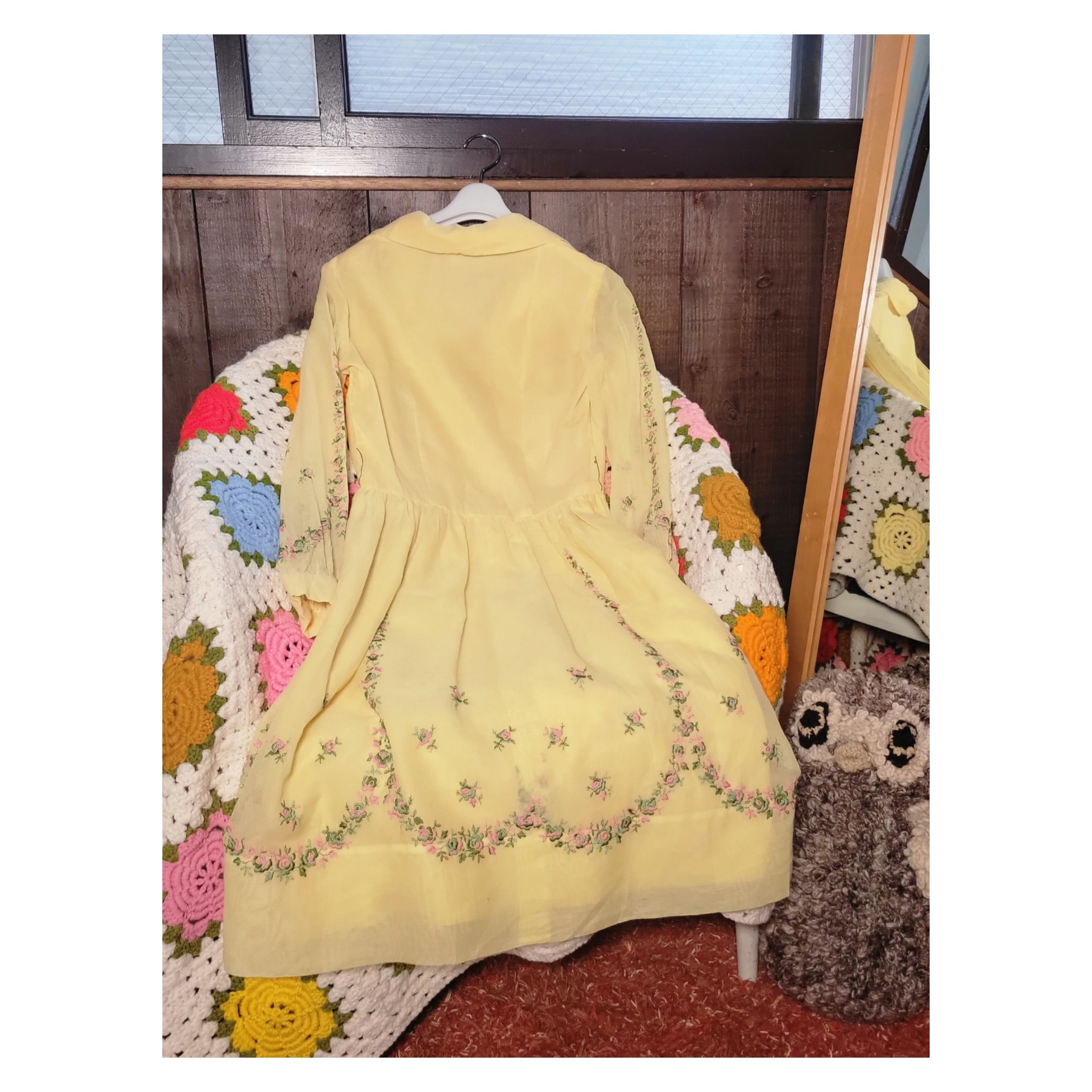 色味は、ペールイエロー×ピンク×グリーン。カチッとした襟やレトロなシルエットを軽やかで透け感のある素材感で作られた華やかな雰囲気が魅力的。袖やスカート部分にあしらわれたお花の刺繍も素敵。