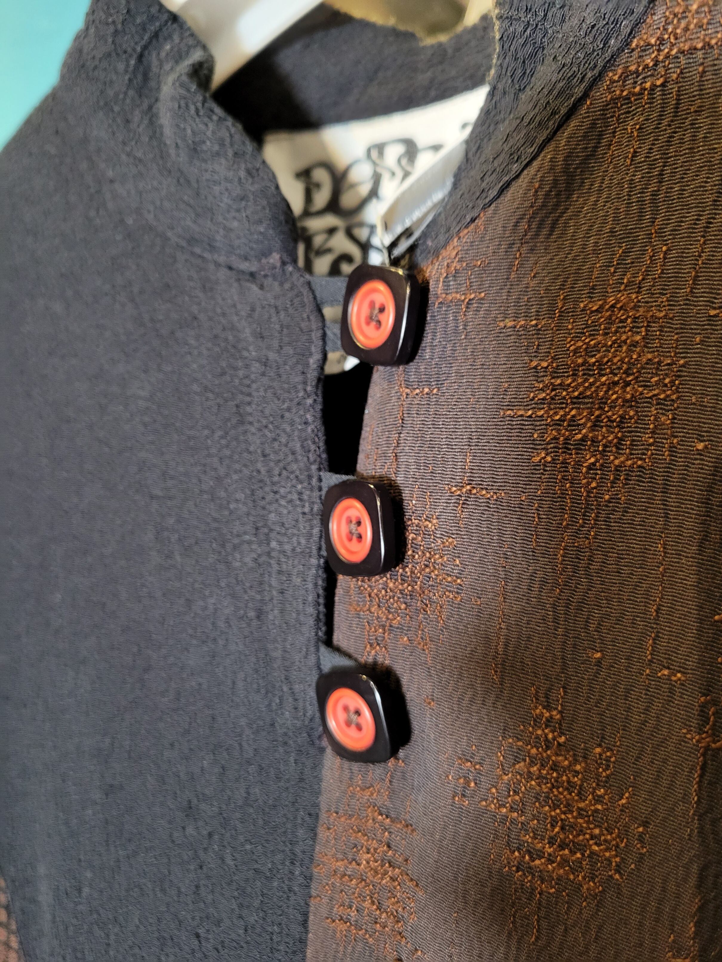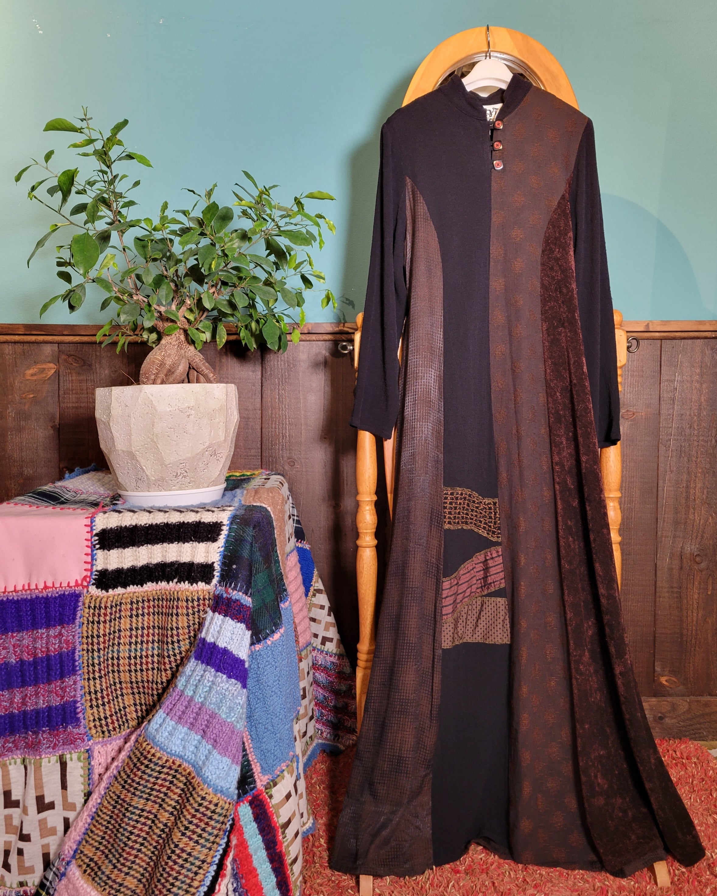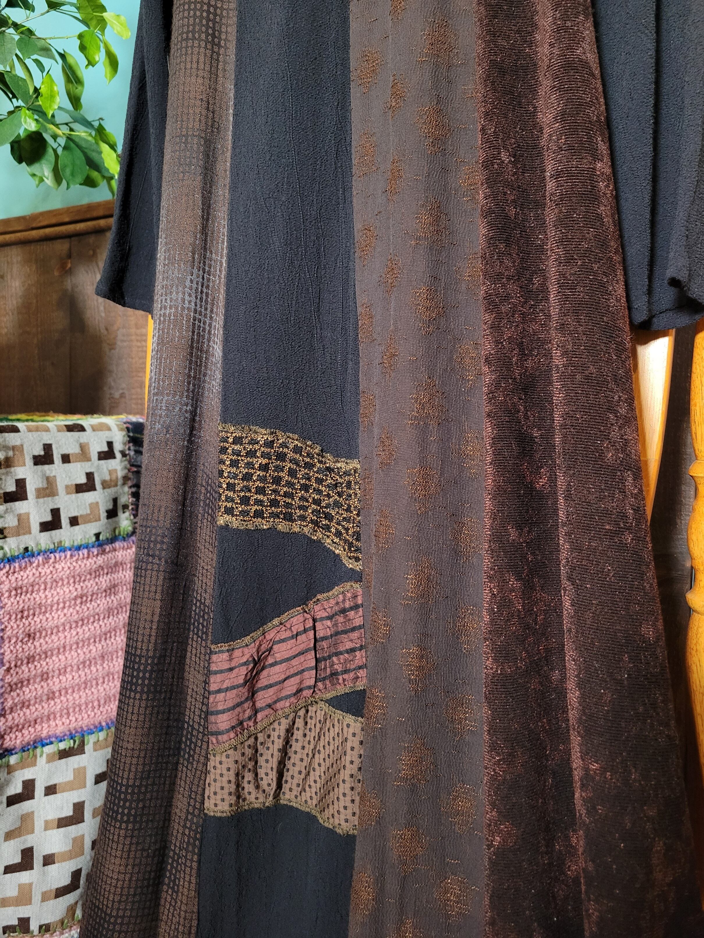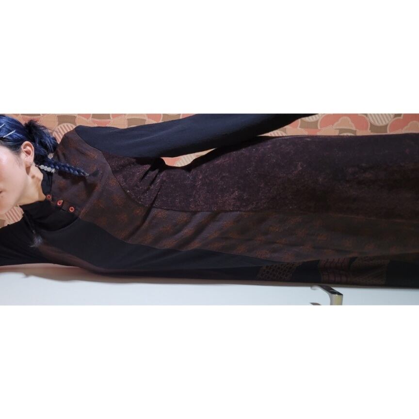 色味は、ブラウン×ブラック。比較的タイトめな上半身部分から裾へ向かってなだらかに広がるシルエットが魅力的。落ち着きのあるカラーリング。様々な素材のパッチワークですがほっこり感はほぼなく、どことなくエキゾチックな印象が素敵。