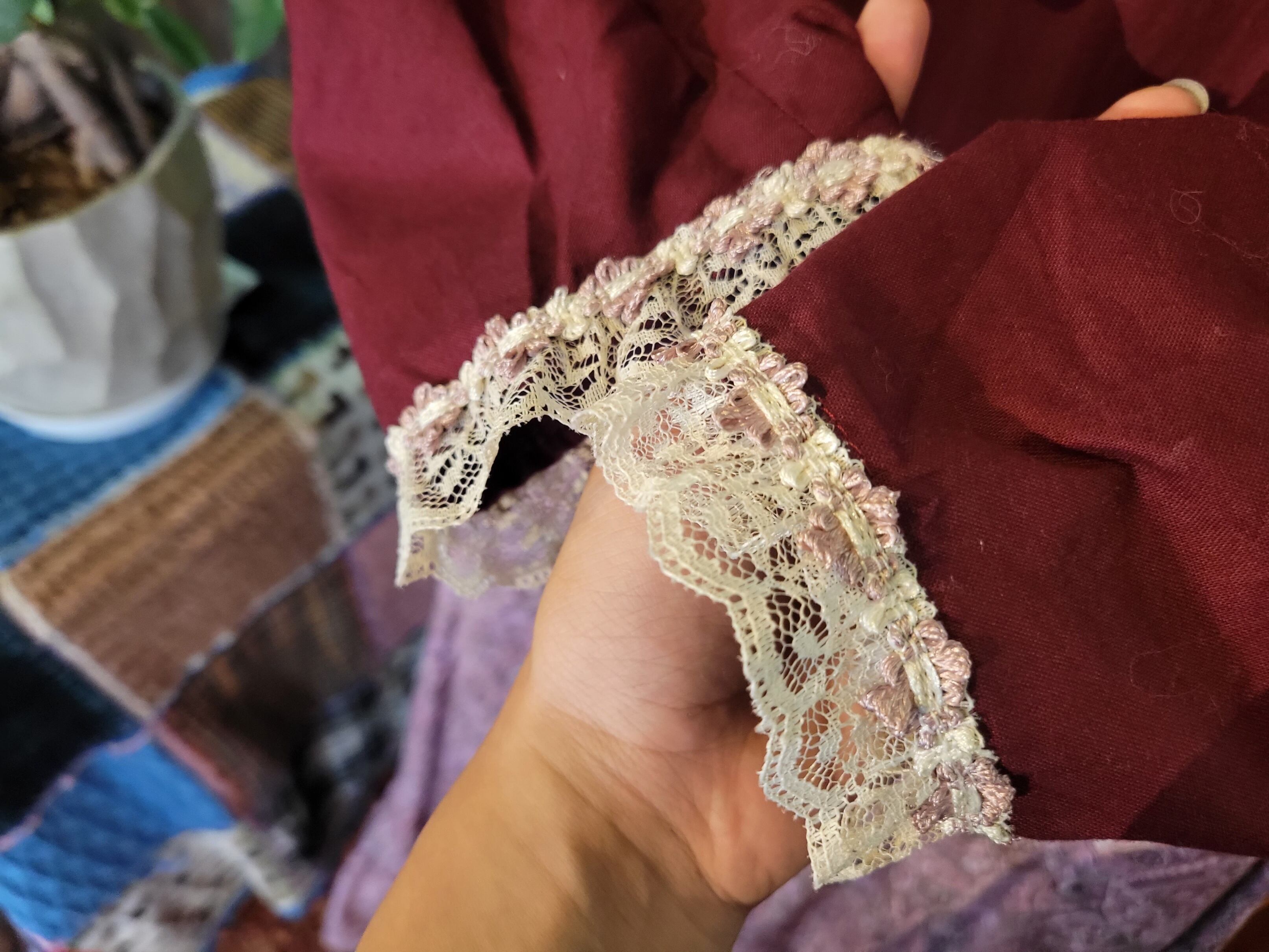 色味は、ボルドー×ホワイト×ピンク。とってもロマンティックなデザインが素敵。パフスリーブやたっぷりと使われたスカート部分、腰部分の装飾も◎襟元や袖のレースにはお花があしらわれており細部にも目を引くポイントがたくさんです。