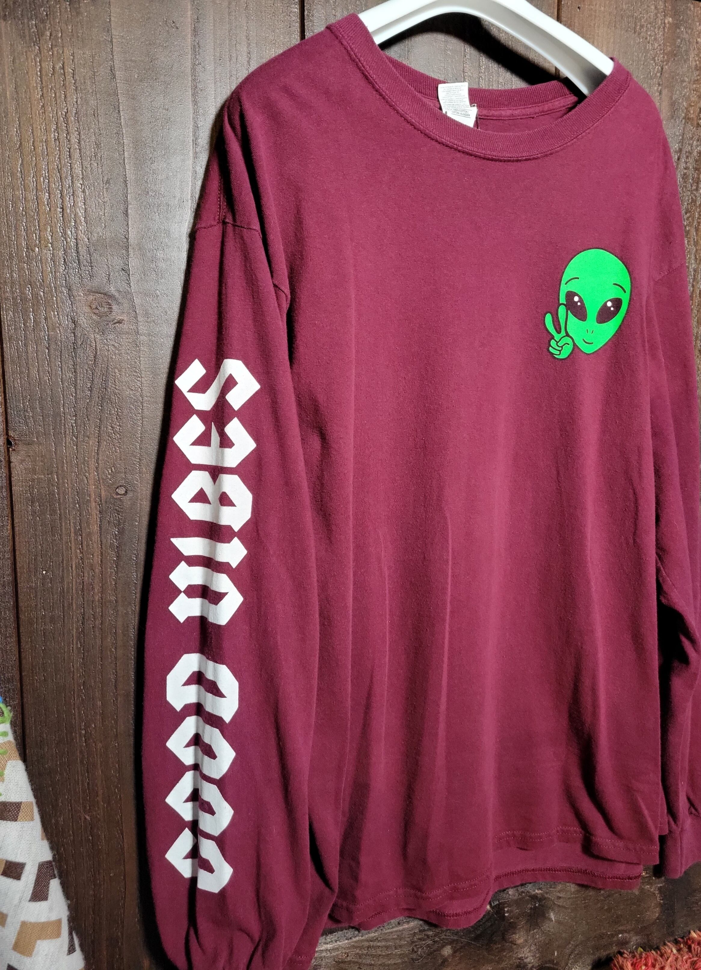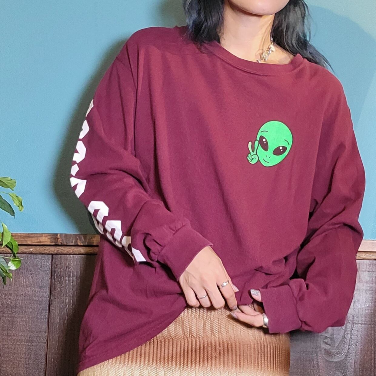 色味は、ボルドー×グリーン×ホワイト。小顔に見せたいのか、お顔の横でピースサインのエイリアンちゃん。キラッキラのおめめがキュートです。落ち着きのあるカラーとゆったりサイズが◎