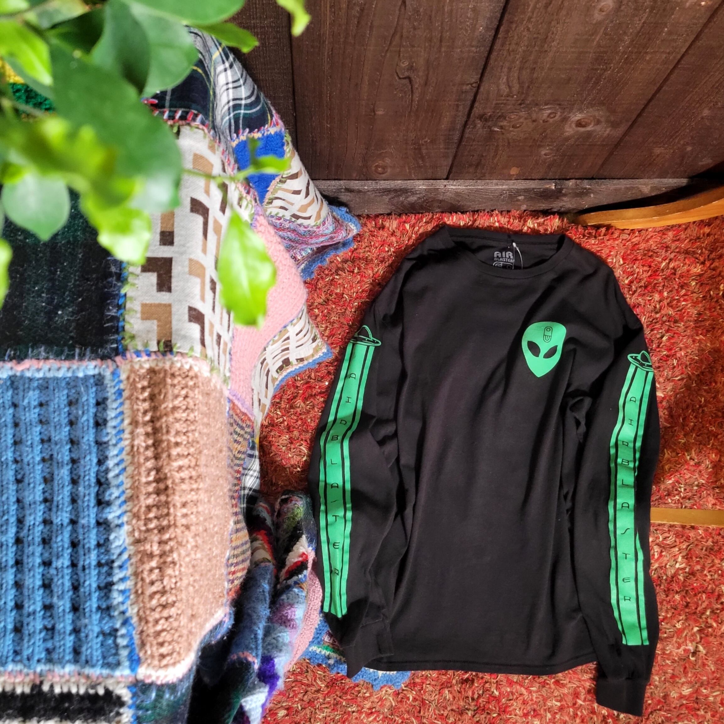 色味は、ブラック×グリーン。蛍光グリーンのエイリアンがんじっとこちらを見ています。袖にはUFOからのレーザーにブランド名のプリントが最高。袖のプリントってなんでこんなに嬉しくなっちゃうんだろう。