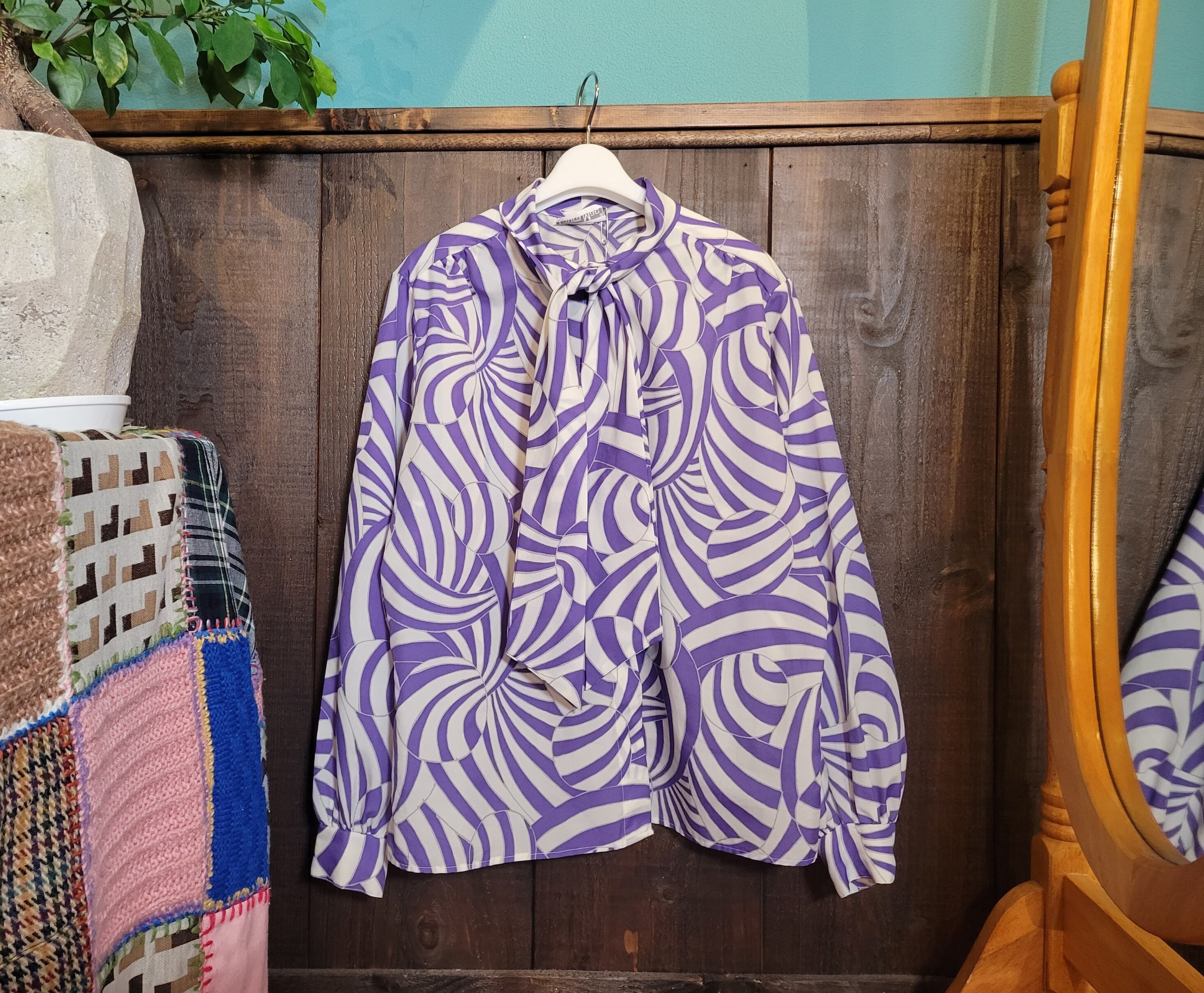 色味は、ホワイト×パープル。抽象的なテキスタイルがインパクトのある1着。スウェットなどとレイヤードしてリボン部分やうでまくりをしてチラリと見せたり、もちろんジャケットにも◎