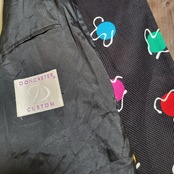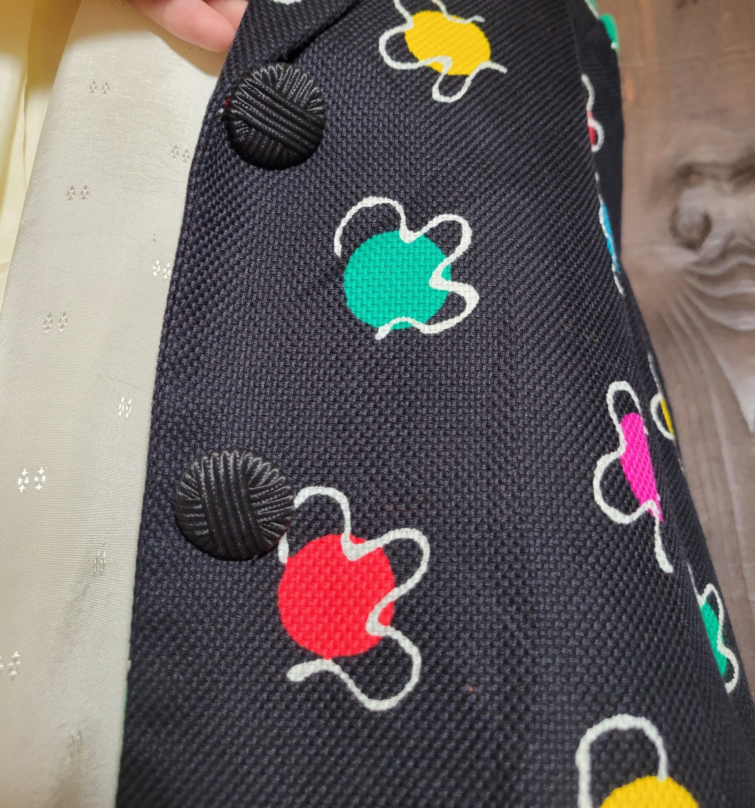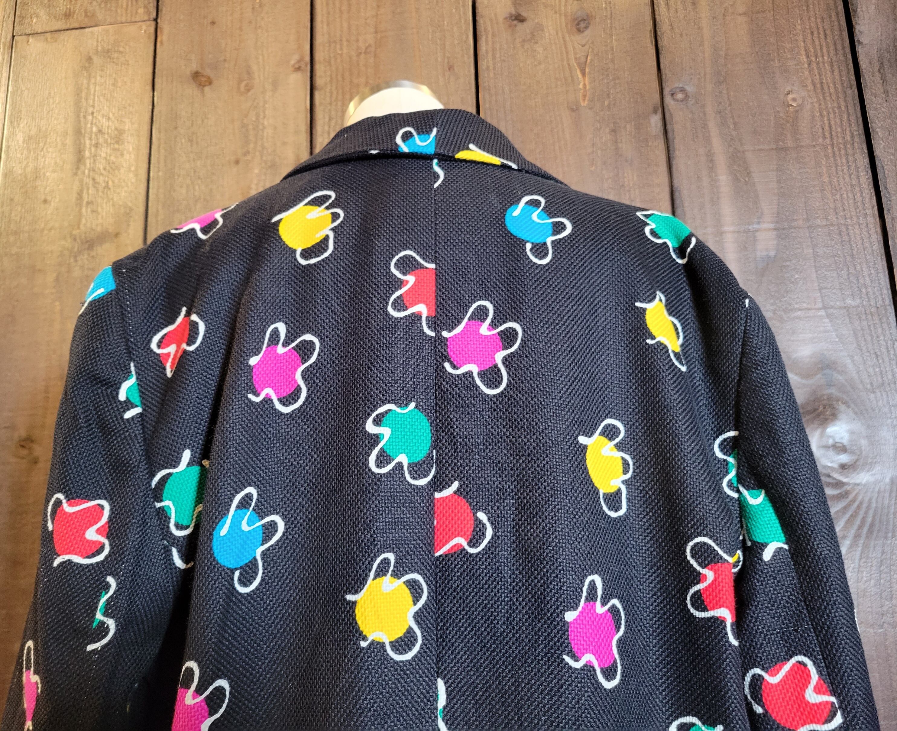 色味は、ブラック×ホワイト×イエロー×グリーン×レッド。不規則なお花のような柄のテキスタイルが魅力的。不思議ながらとは反したショールカラーでシンプルなデザインのギャップがなんだか気になります。