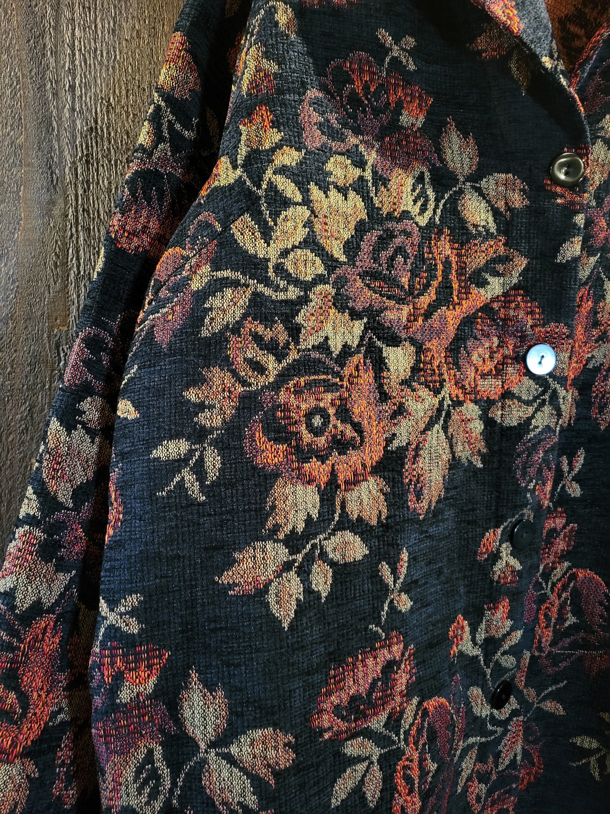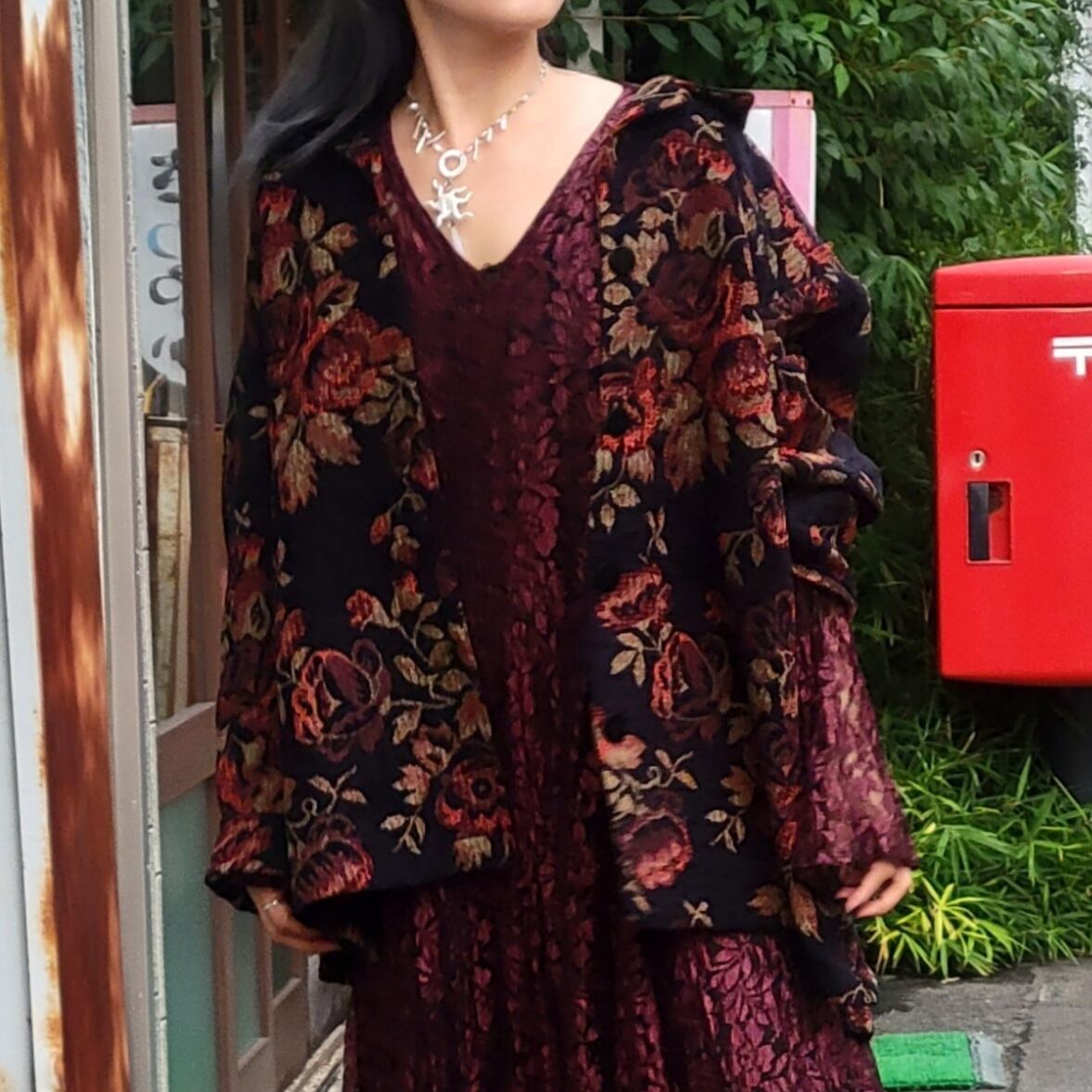 色味は、ブラック×ボルドー×オレンジ。ガバッと羽織れる大きなサイズと上品な質感が魅力的。ベロア素材にバラが施されたテキスタイル。いま時期は軽やかなアイテムに羽織るもよし、寒い時期にはライトなコートやニットなどにもざっくりと羽織れます◎