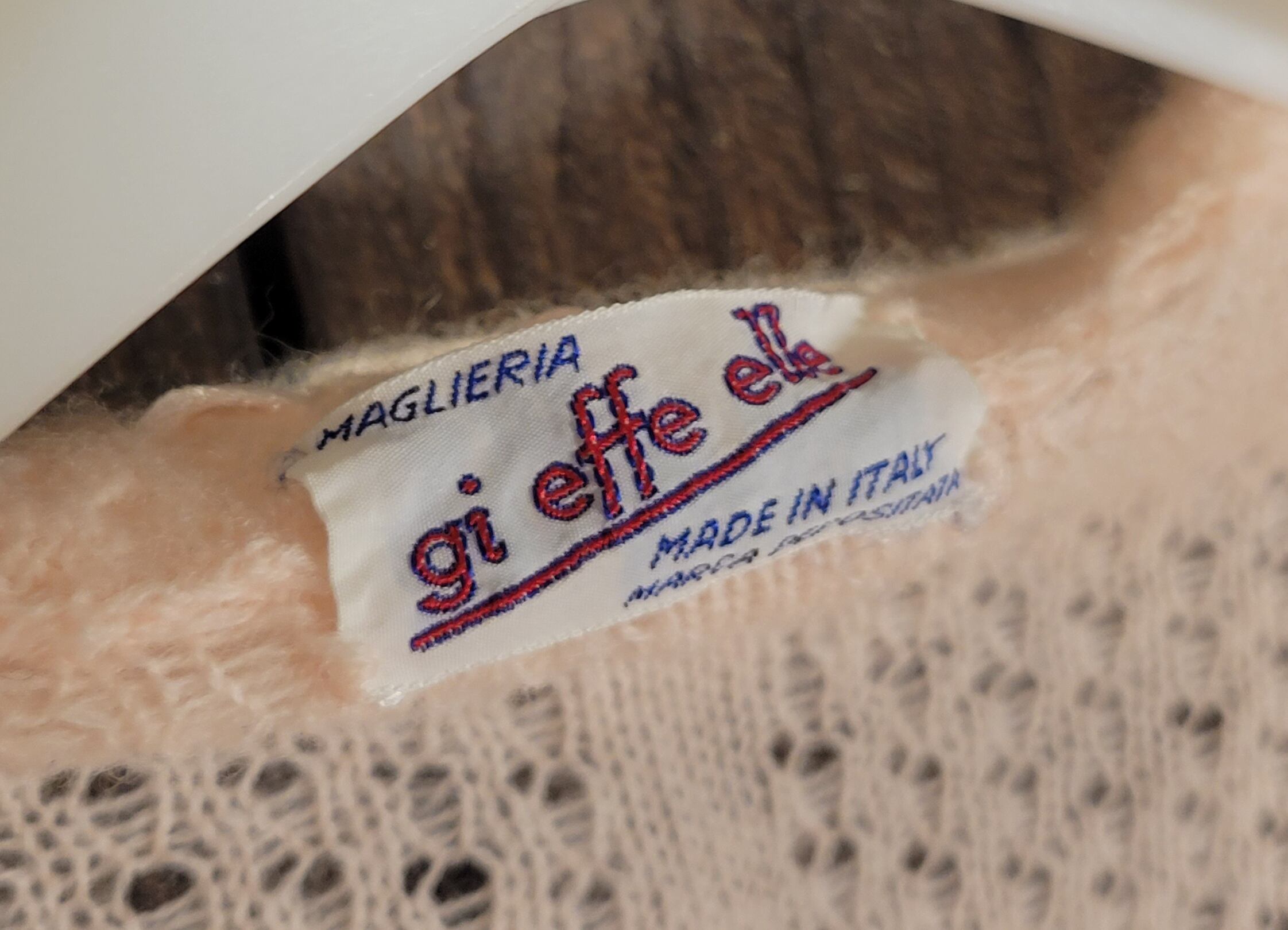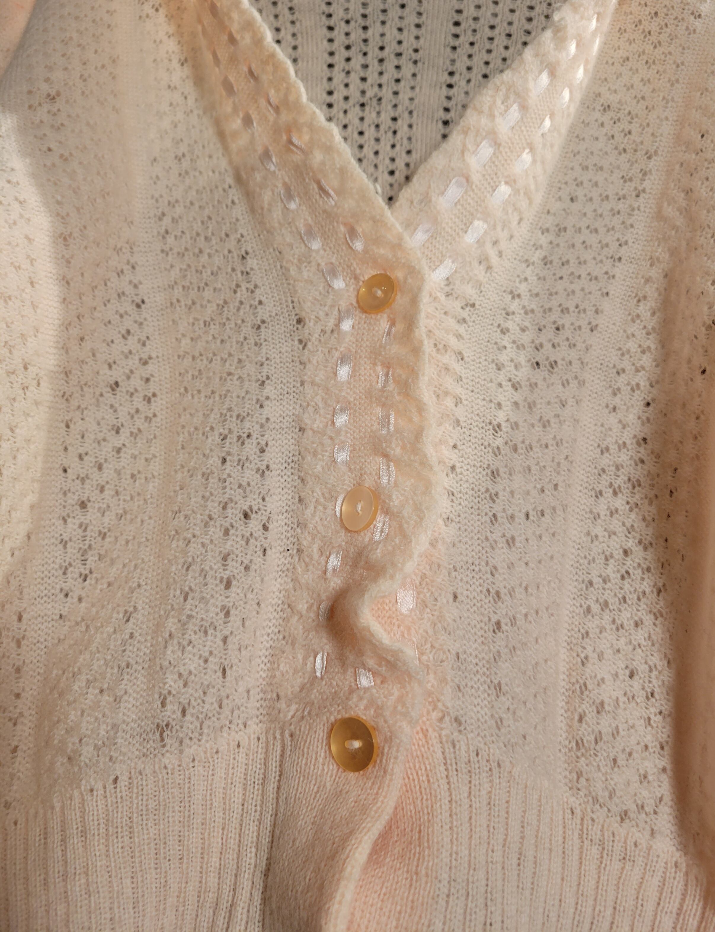 シャーベットカラーの淡いピンクが可愛らしい雰囲気。透かし編みの儚げな雰囲気と襟元から続くリボンが印象的です。