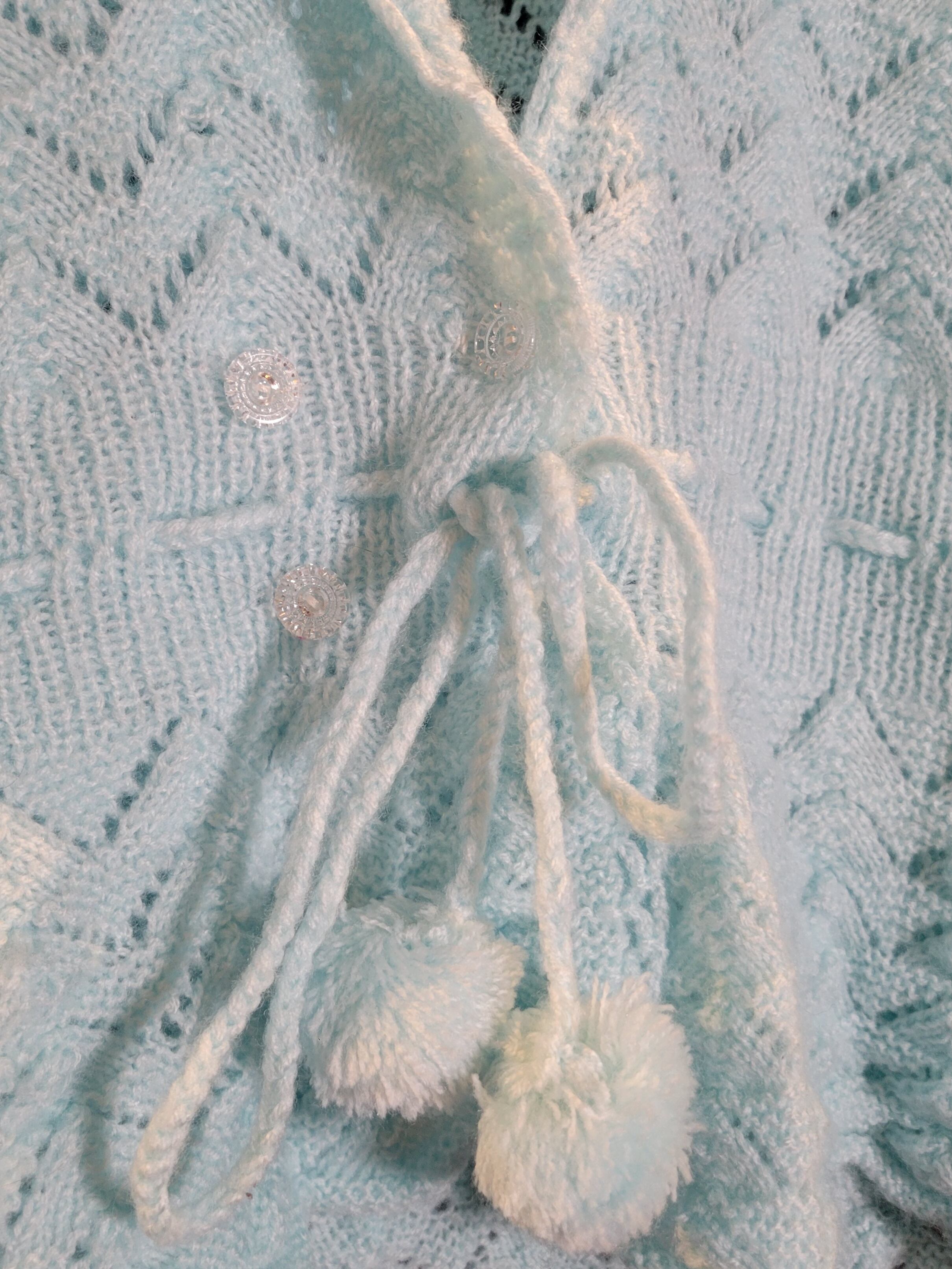 キラキラとしたまるでガラスのようなボタンや、ウエスト調節が可能な紐の先にはポンポン。ディティールもとっても可愛らしい一着です。