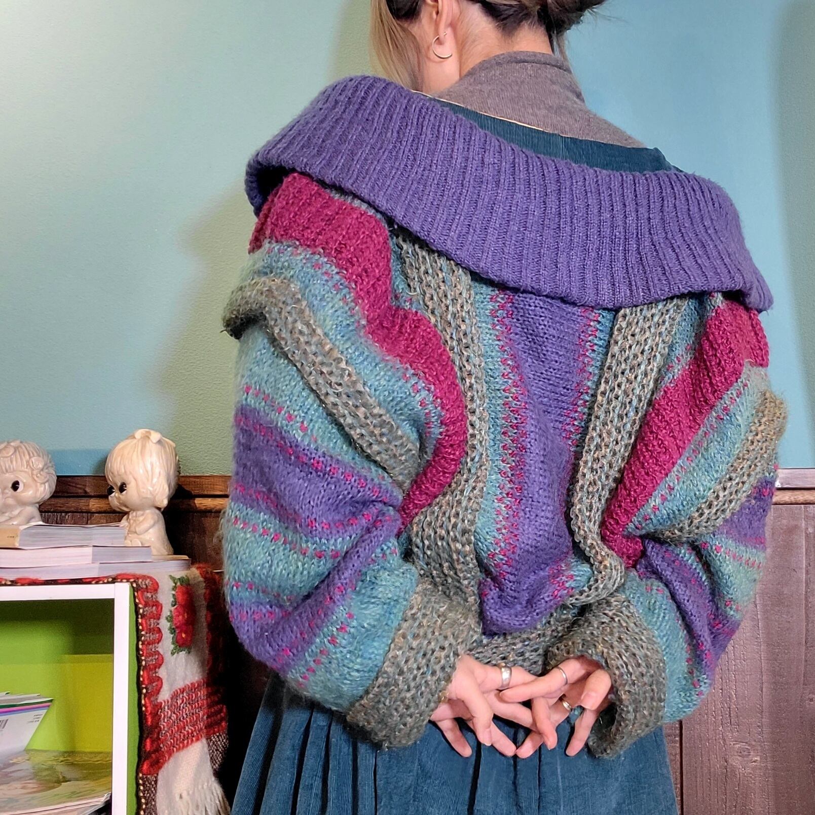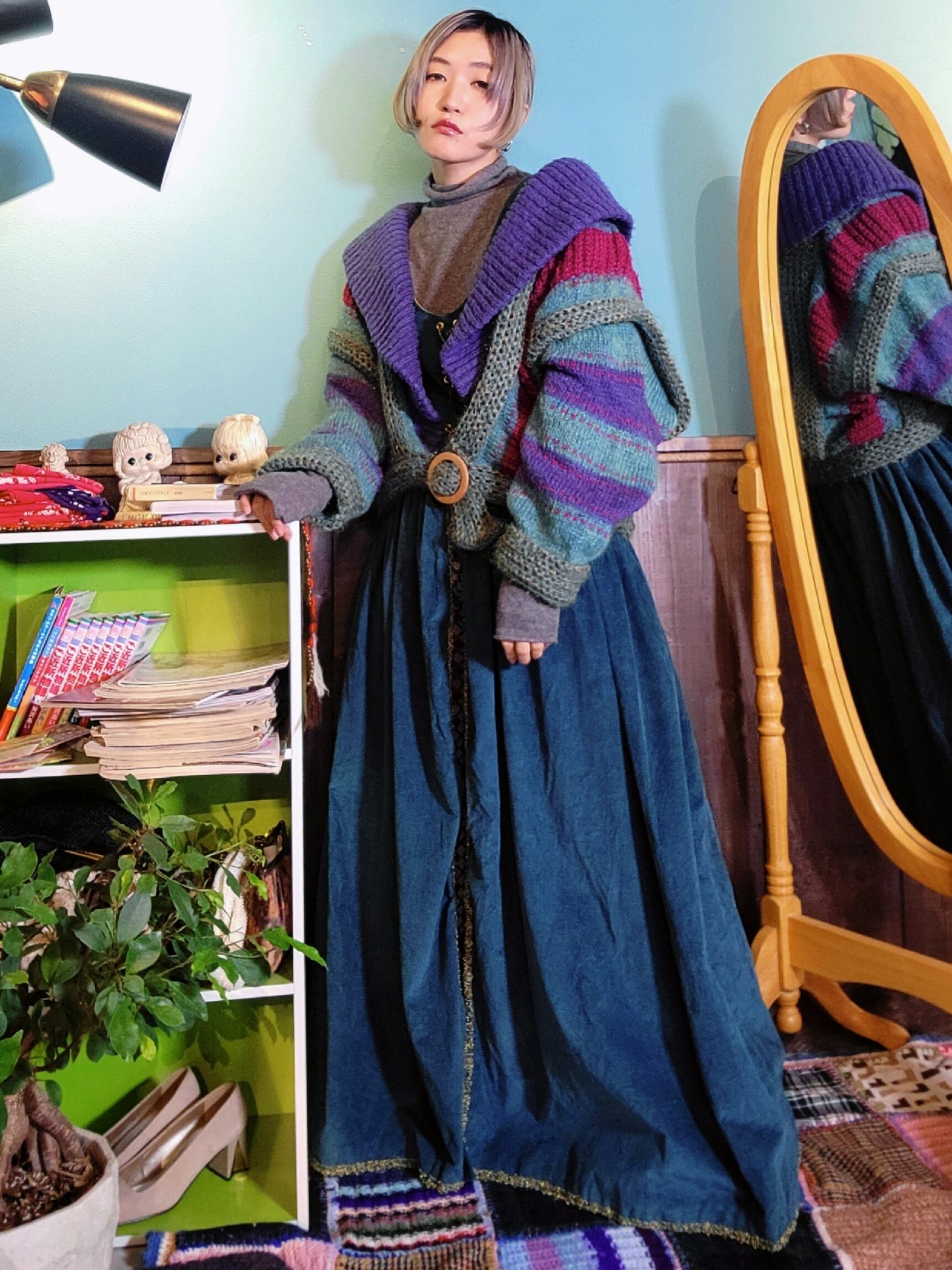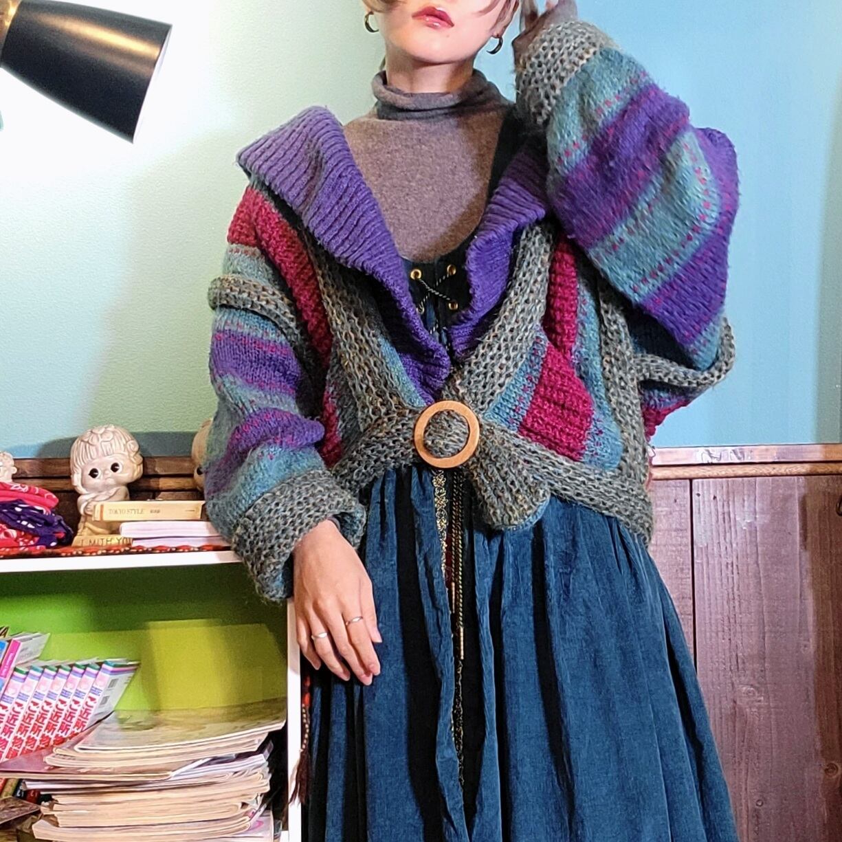 所々に立体感のある編みが施されていたり、緩やかに余るショールカラーのフリフリとした落ち方やアクセントに付けられたベルトのウッドバックルが他にはないユニークさを演出しています。