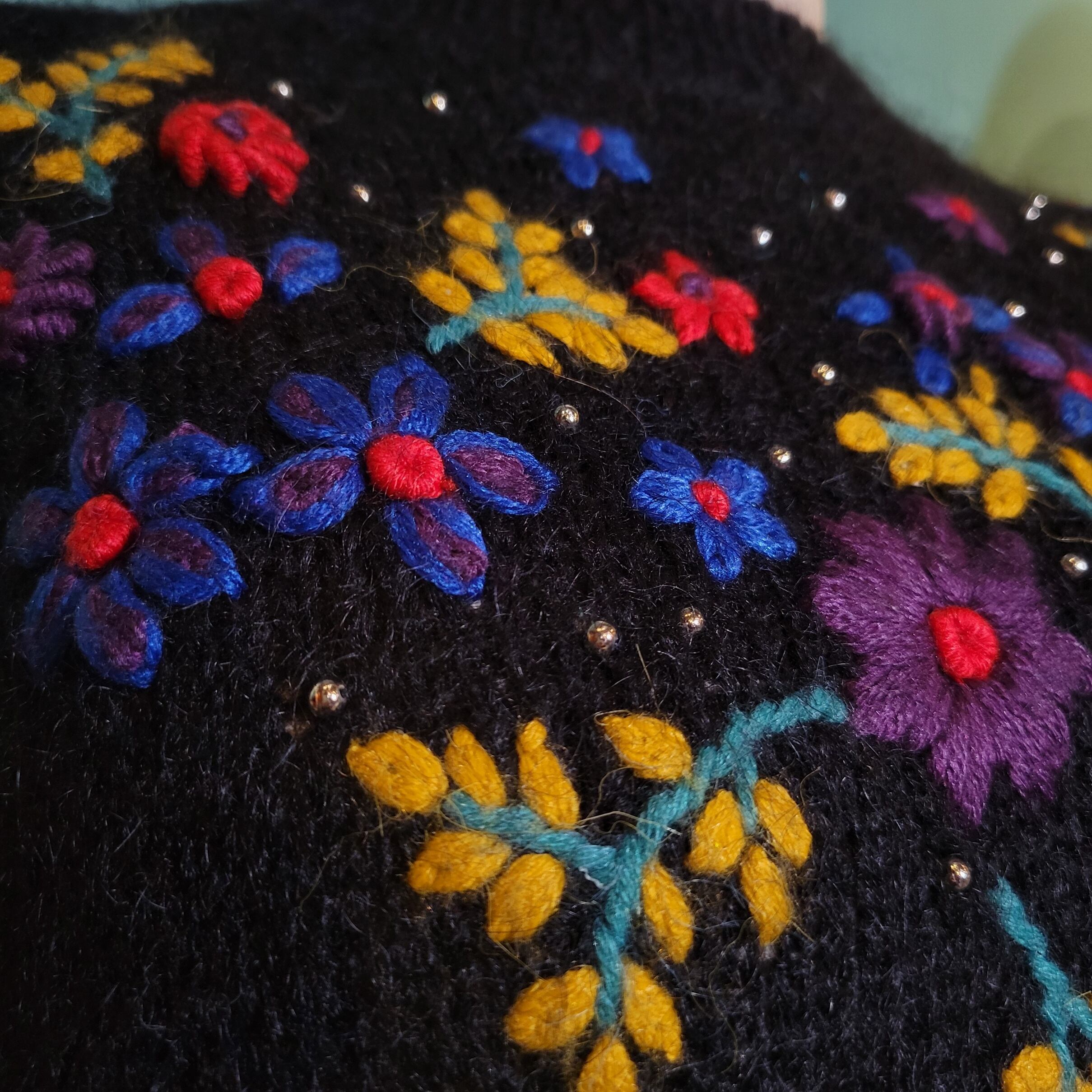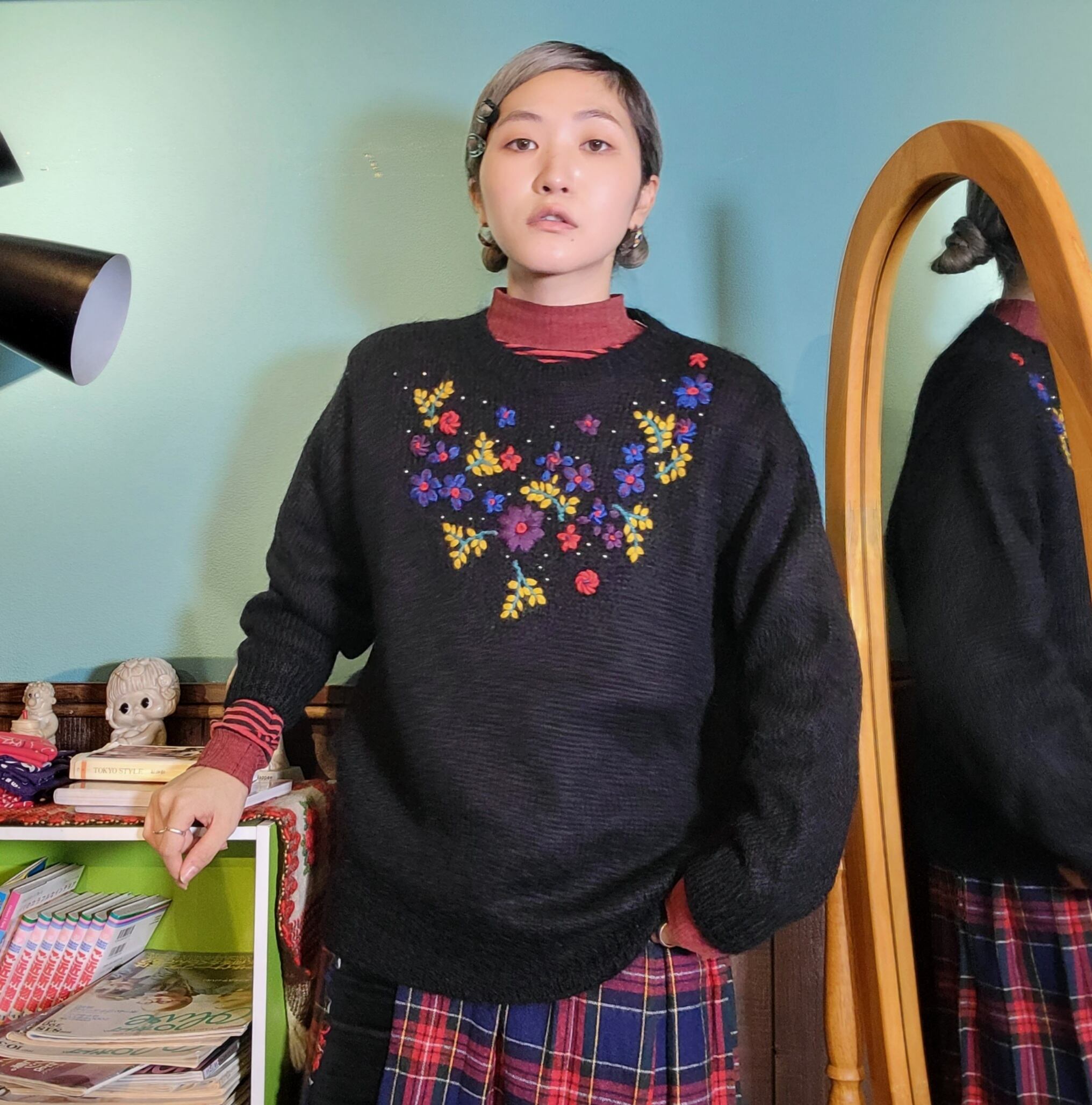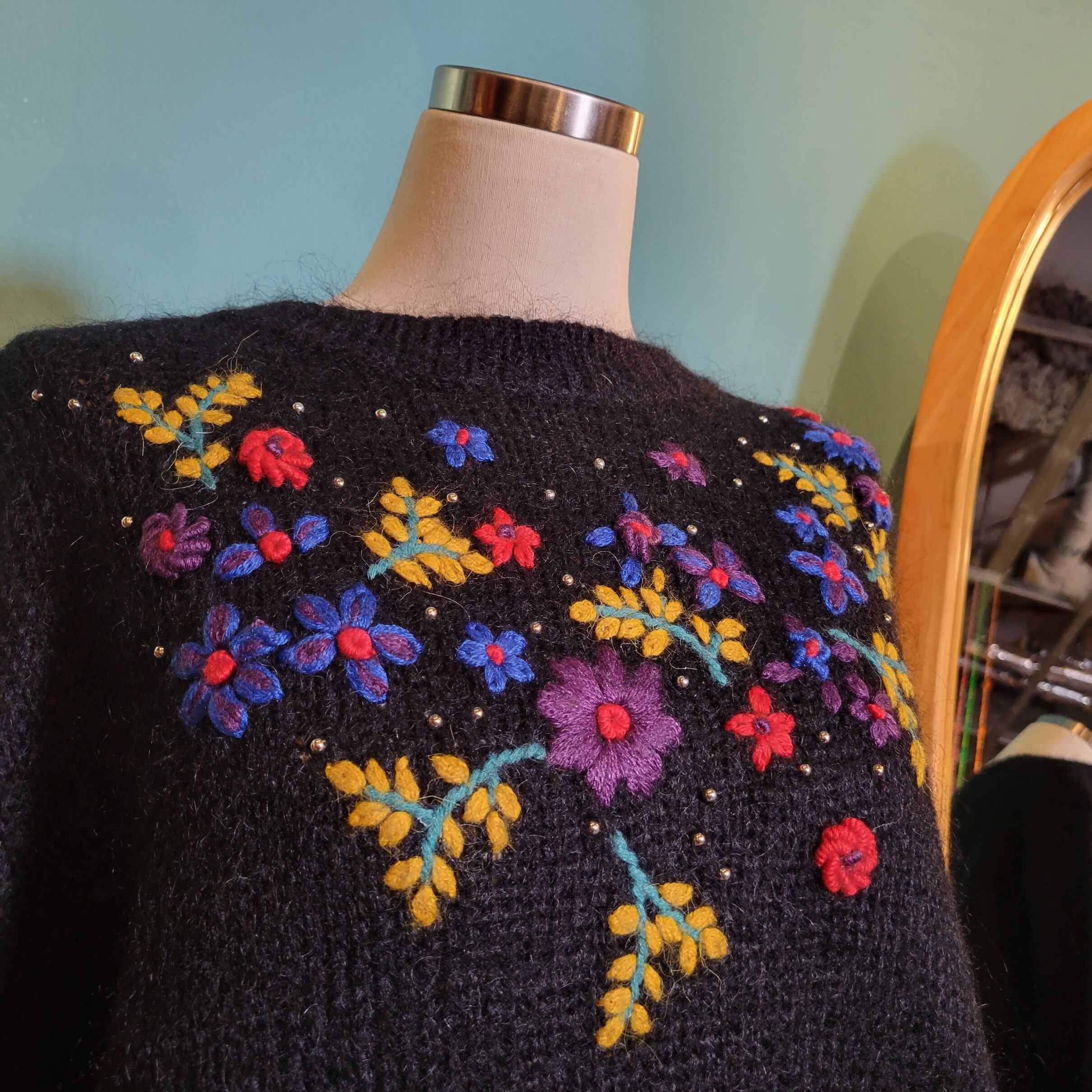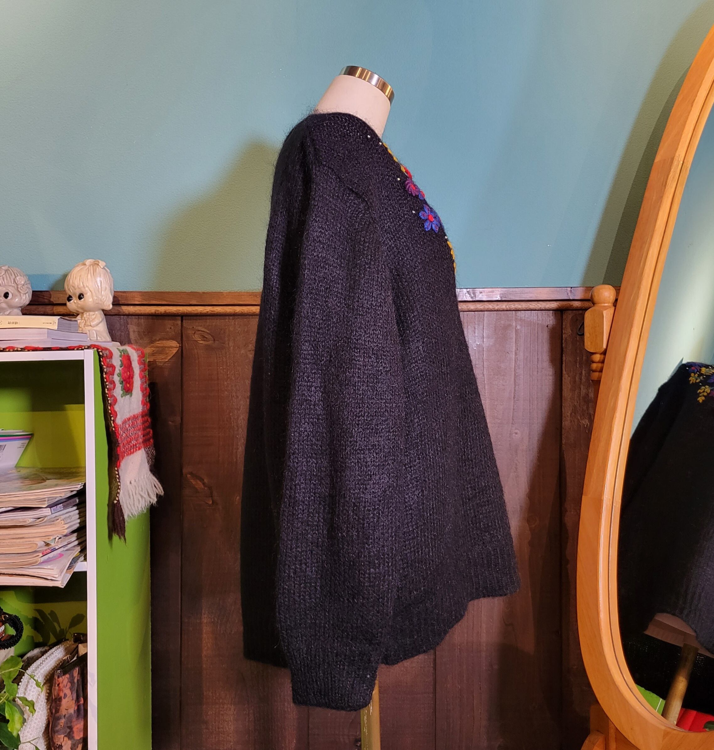 ブラックのモヘアのニットに、カラフルなお花が胸元に、立体感のある刺繍でパッと咲いているのが可愛らしい1着。