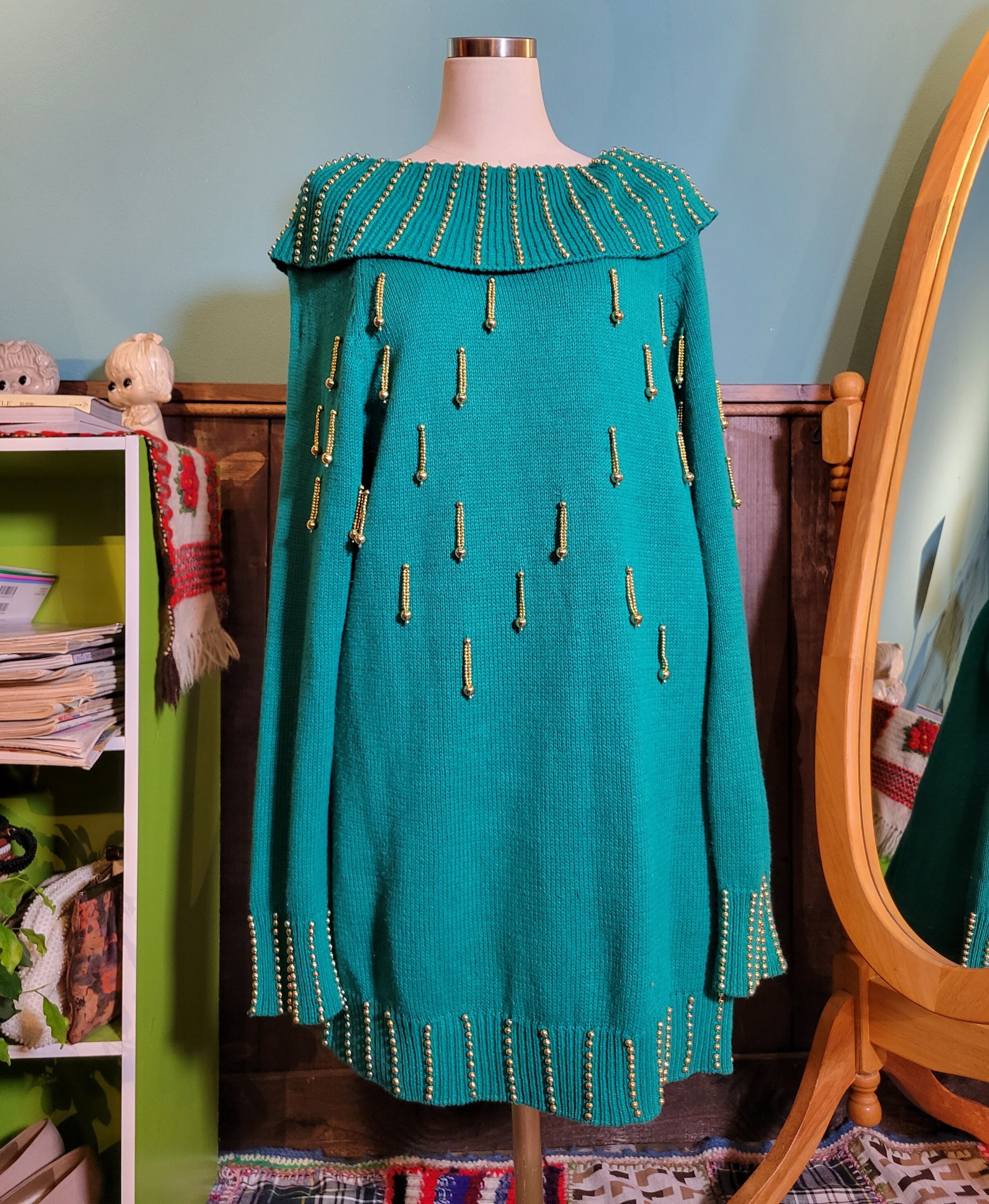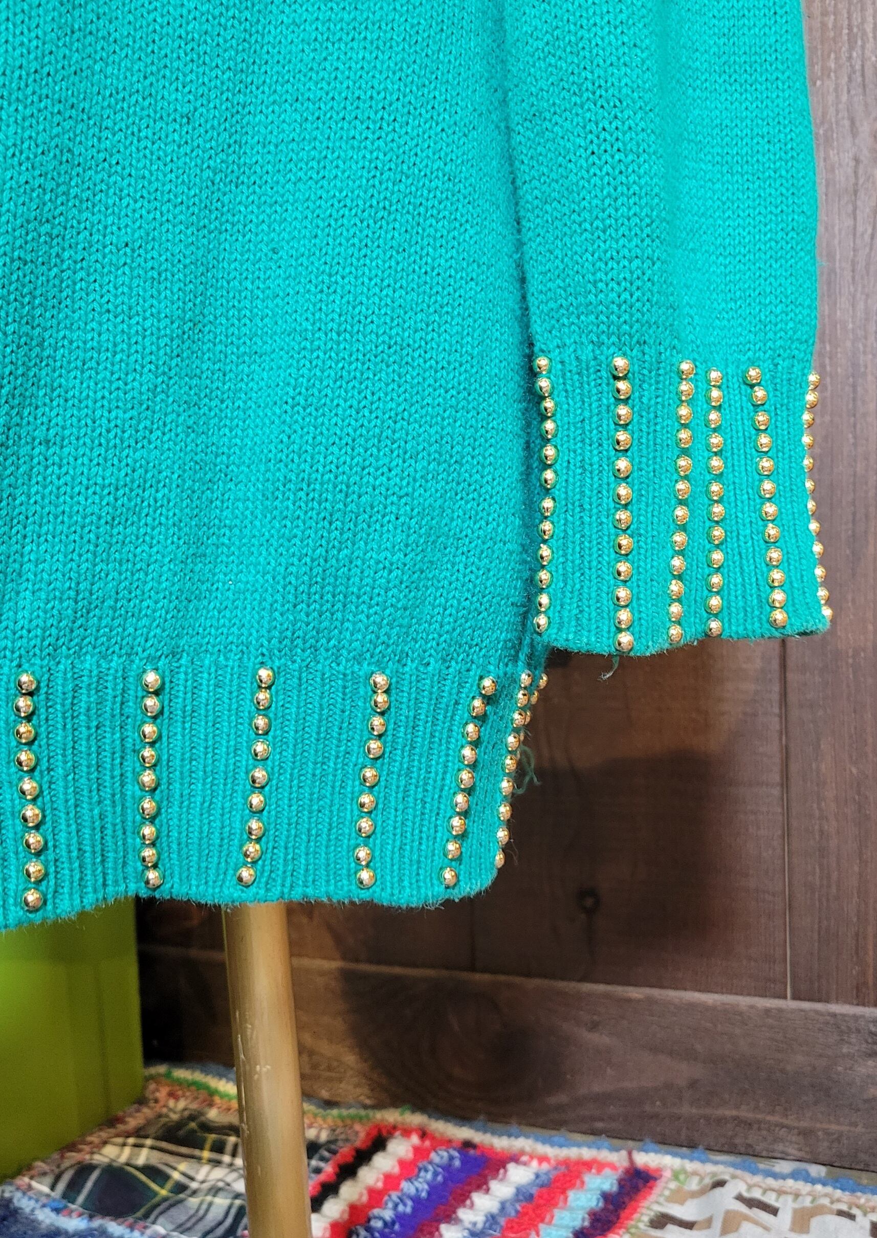鮮やかなグリーンの柔らかく優しいニット。サイズはゆるりとリラックス感のある大きさ。折り返された大きな襟、袖丈、裾のリブ部分に並んだゴールドのビーズのアクセント。