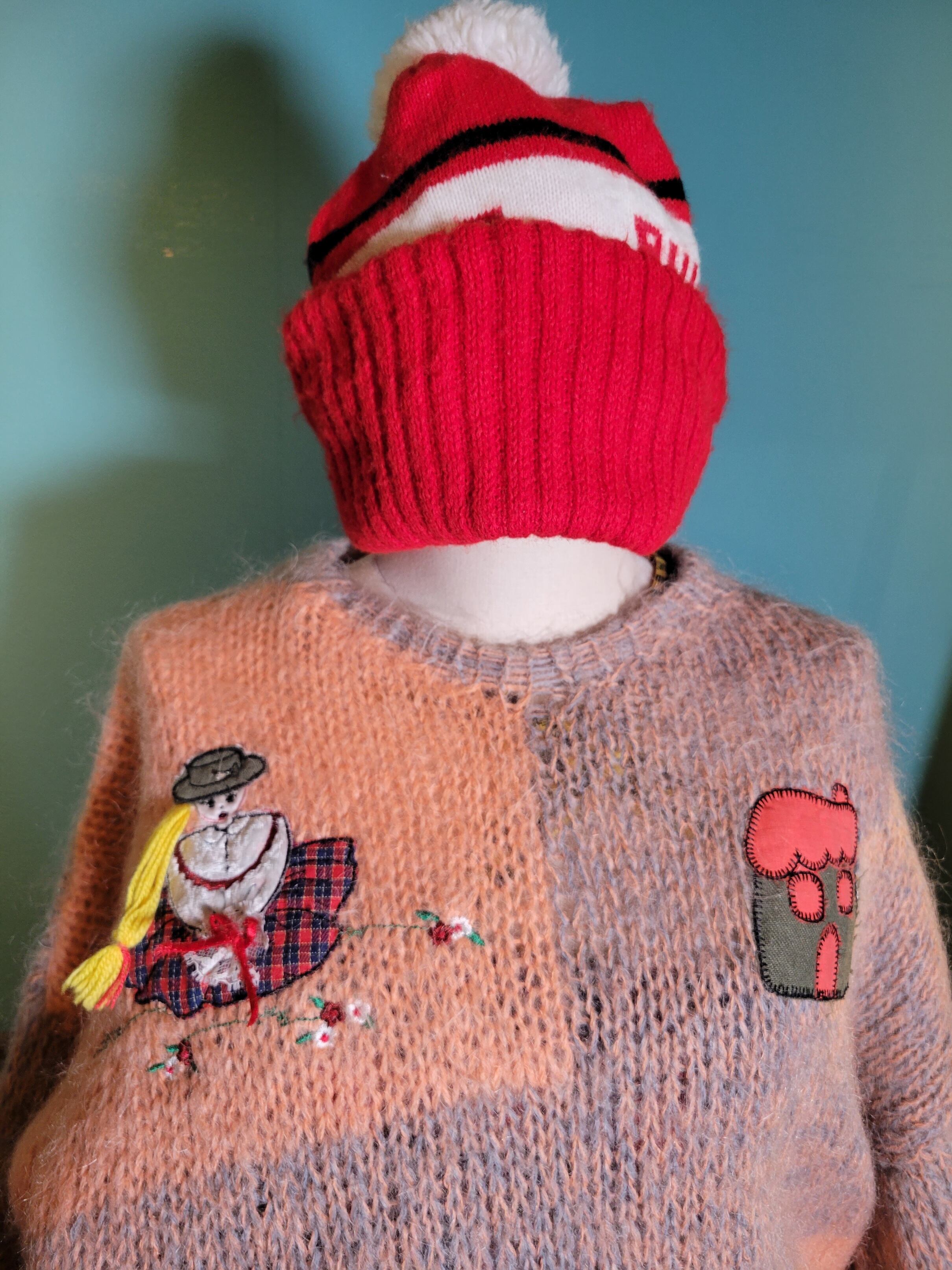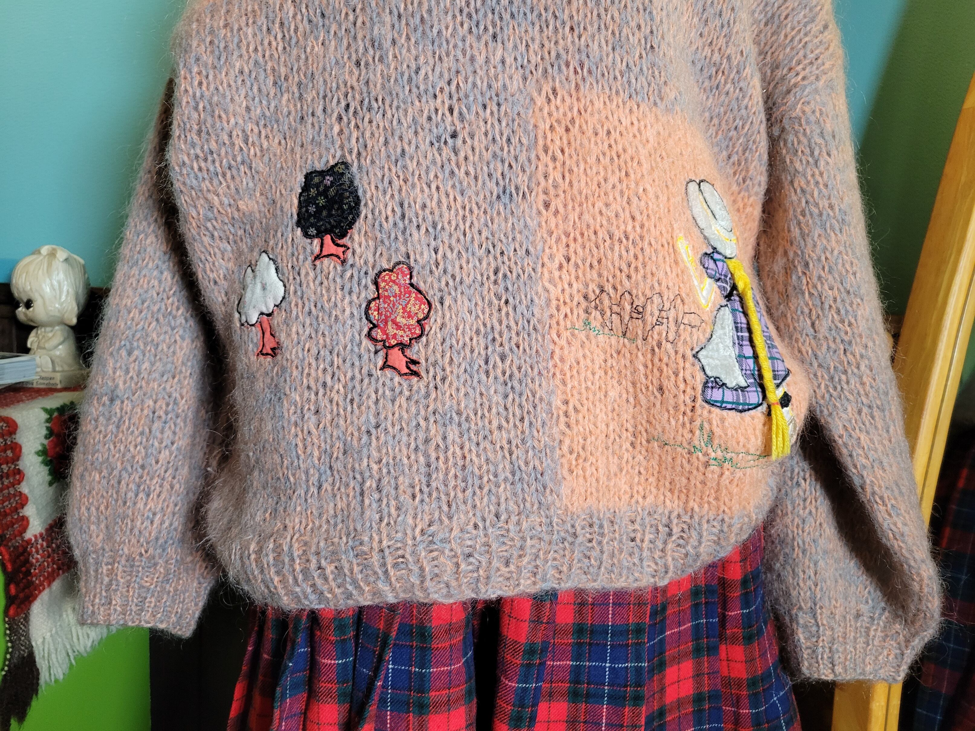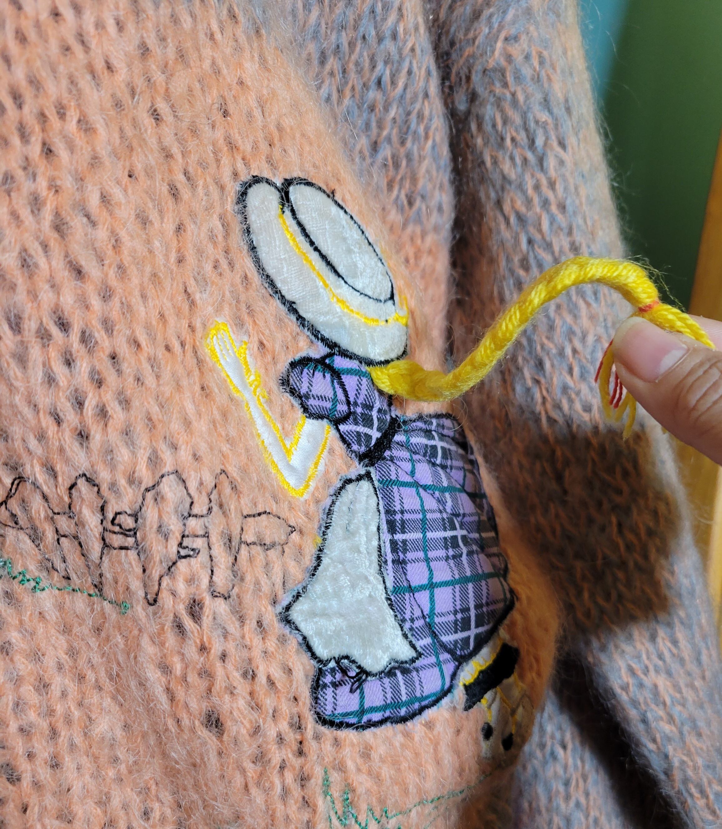 お花を摘む女の子に駆け寄る女の子。キュンと来るデザインです。ふわふわとした柔らかいニットは包み込まれるような大きなサイズ感。