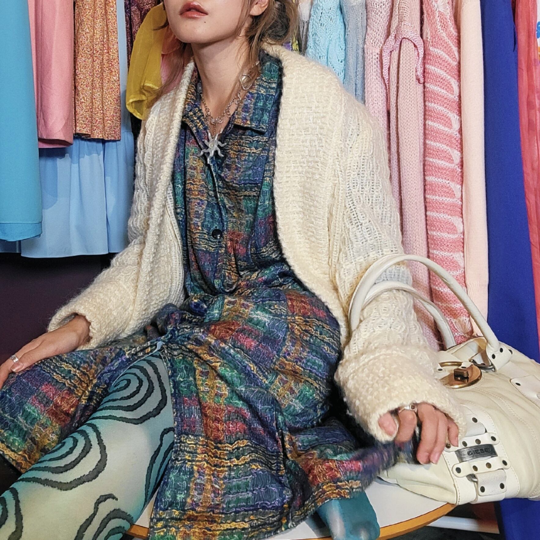 今回はカラータイツやニットカーディガンとあわせて。スタイリングの提案としては、マキシ丈のスカートにプラス、シャツのボタンを多めにあけて肌見せしながらのレイヤードもおすすめ。ショート丈のニットなどと重ねるのも◎