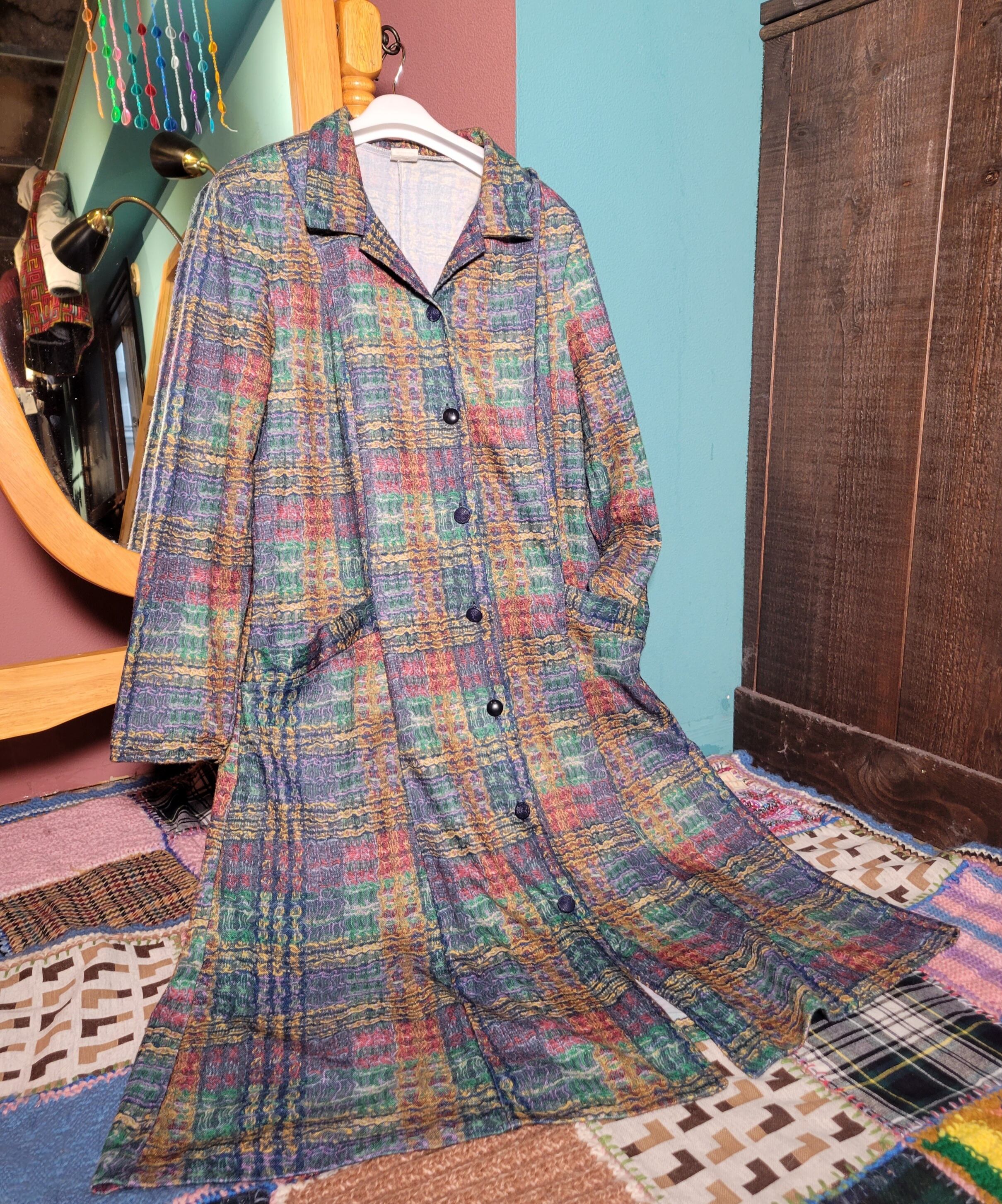 色味は、ブルー×グリーン×イエロー×レッド。ボヤボヤとしたチェックのような水面のような、波打つ不思議なテキスタイルは抽象的でつかみどころない雰囲気。