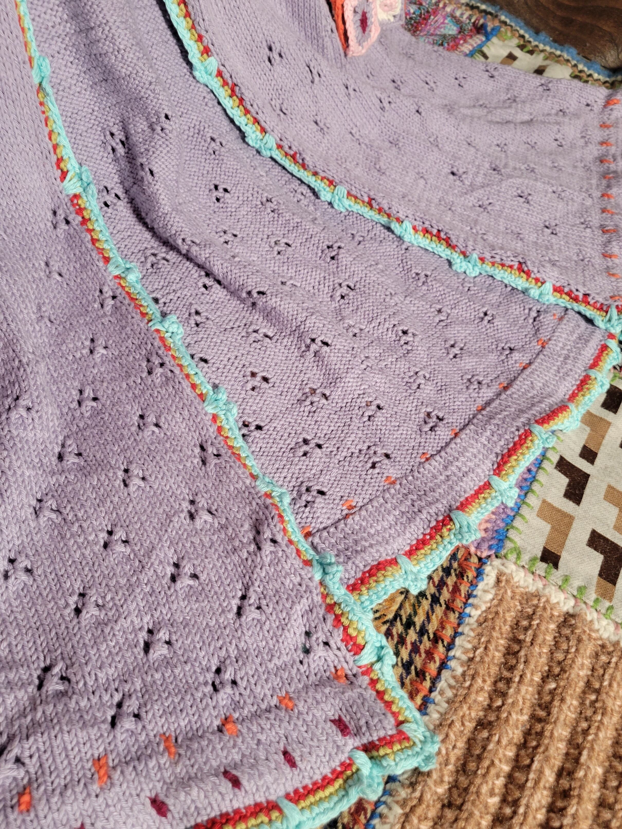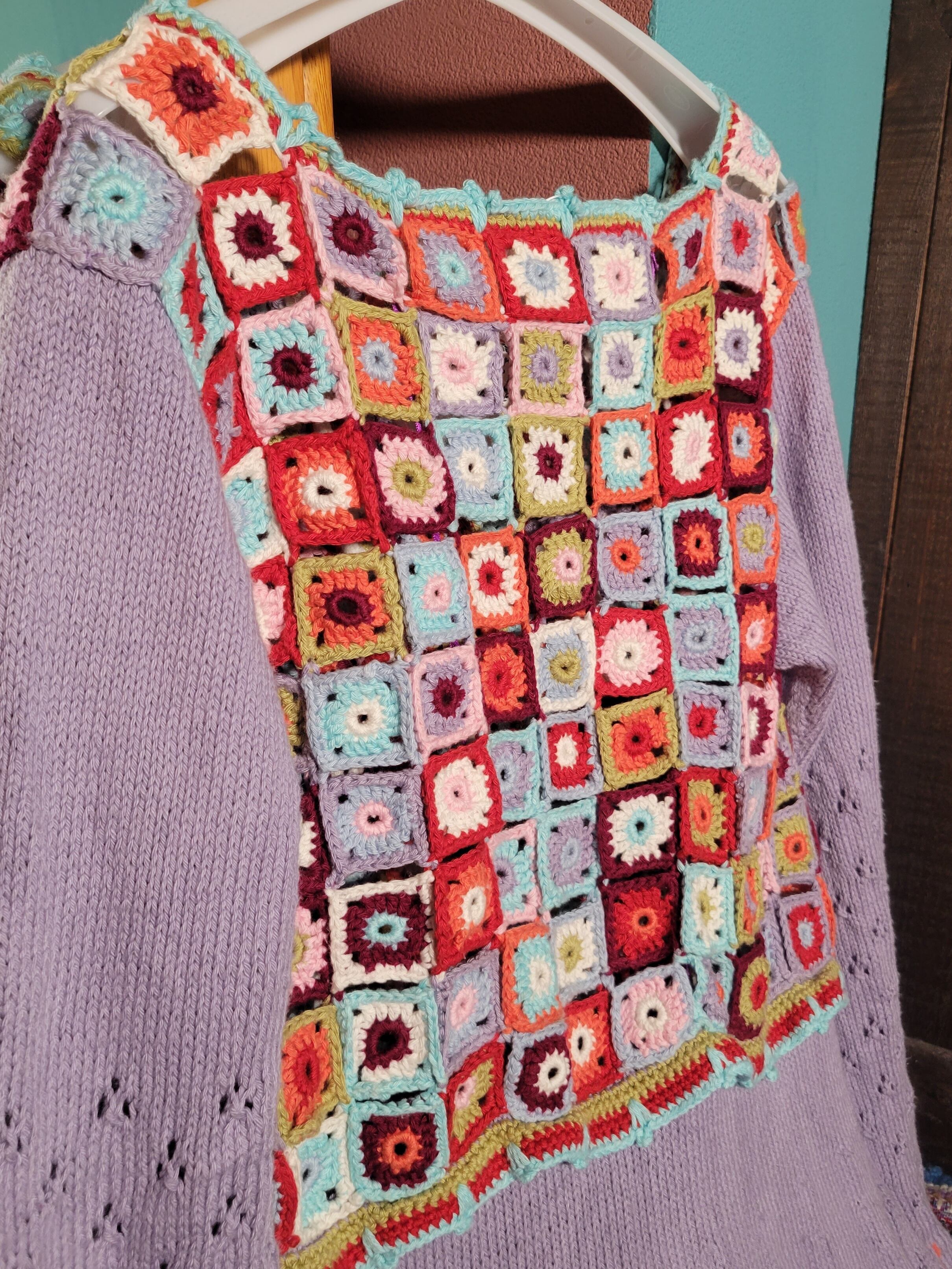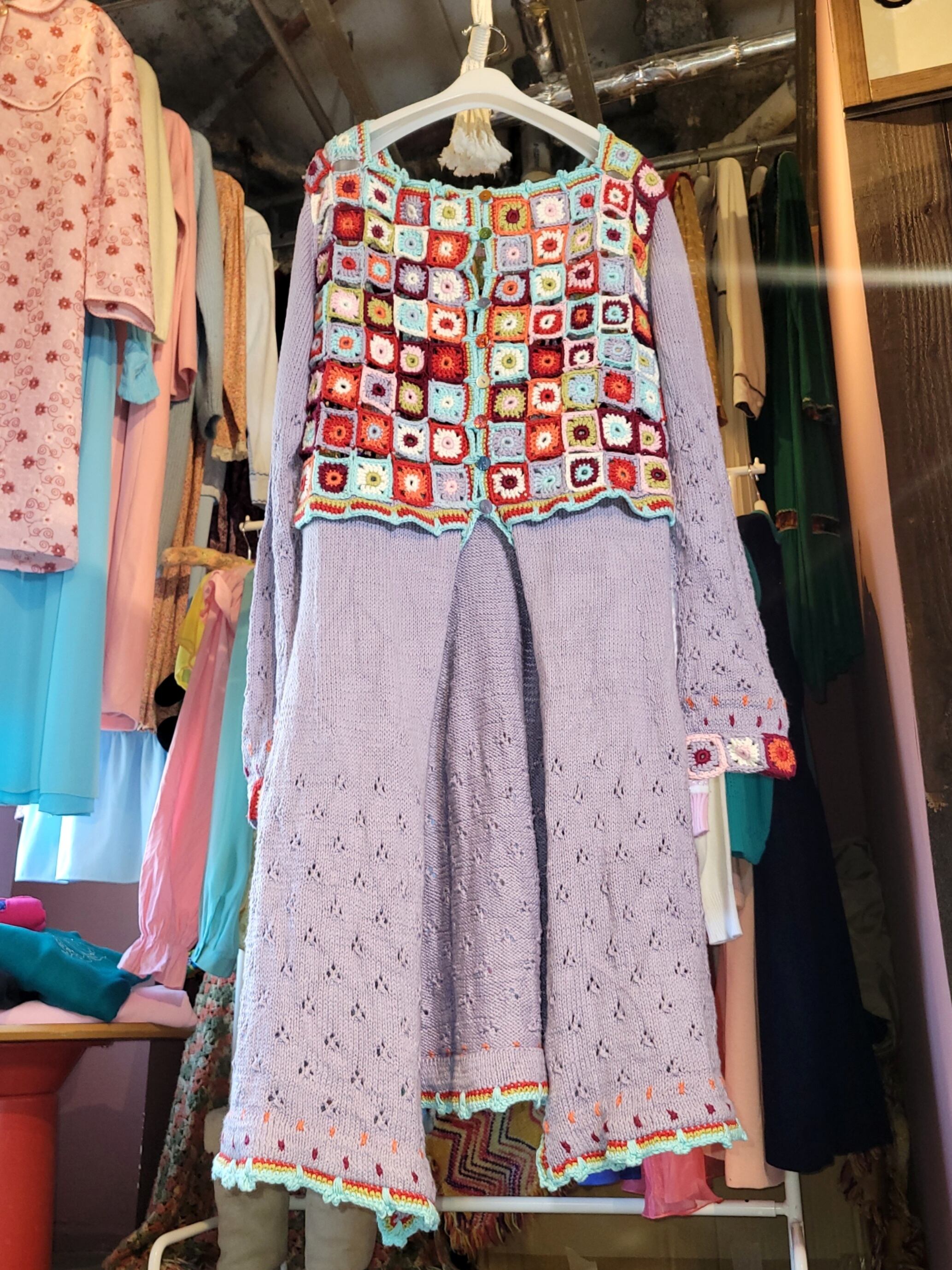 とっても華やかな一着です。小さくひしめき合うグラニースクエアのはトップス部分の全面、袖部分にも施されています。袖、裾の透かし編み、アウトラインのカラーリングも堪らない。スペシャルな一着です。