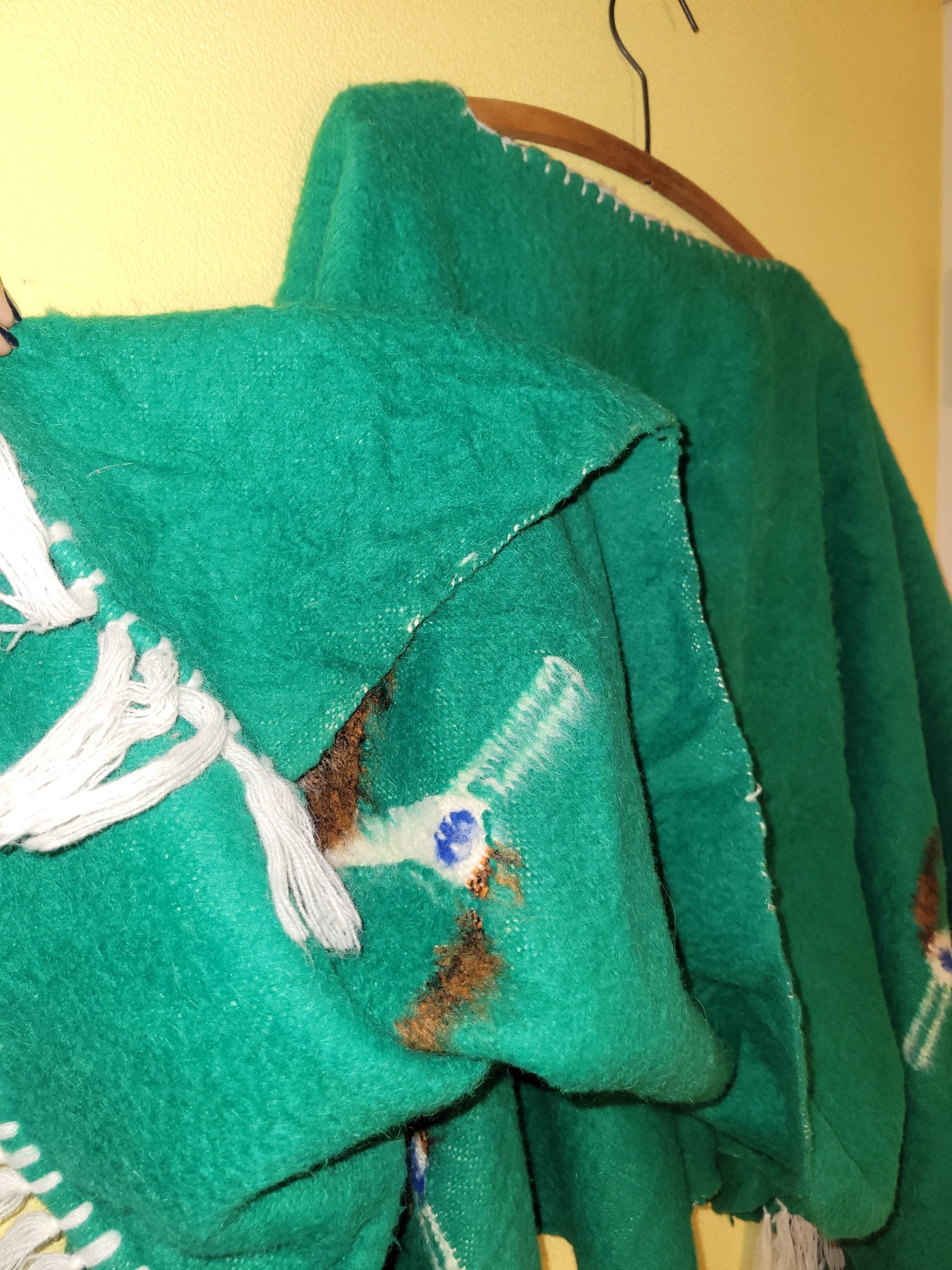 毛足のながいもふもふとした質感の鮮やかな緑が目を惹きます。とりさん(たぶん)が両面裾側に4匹。