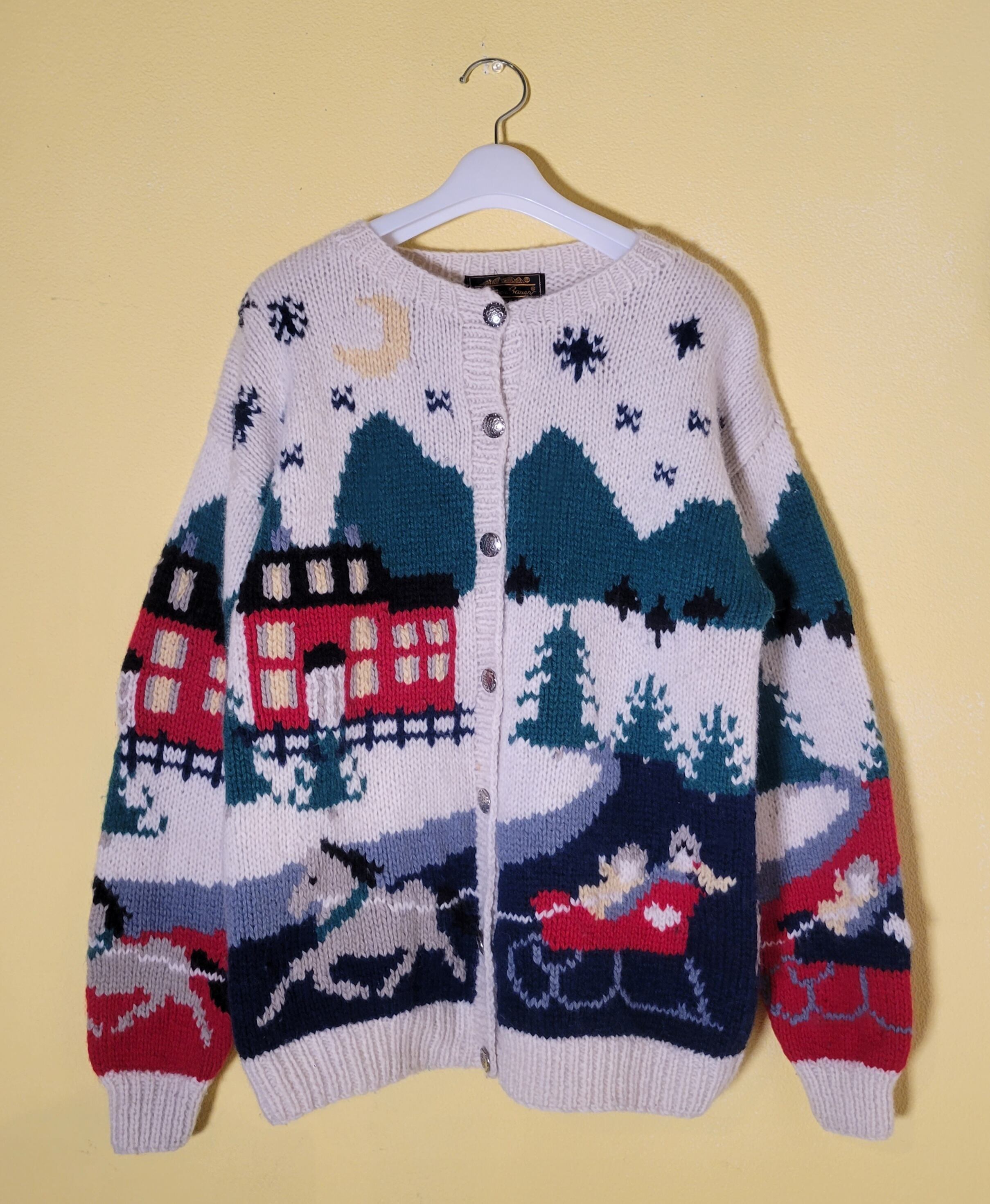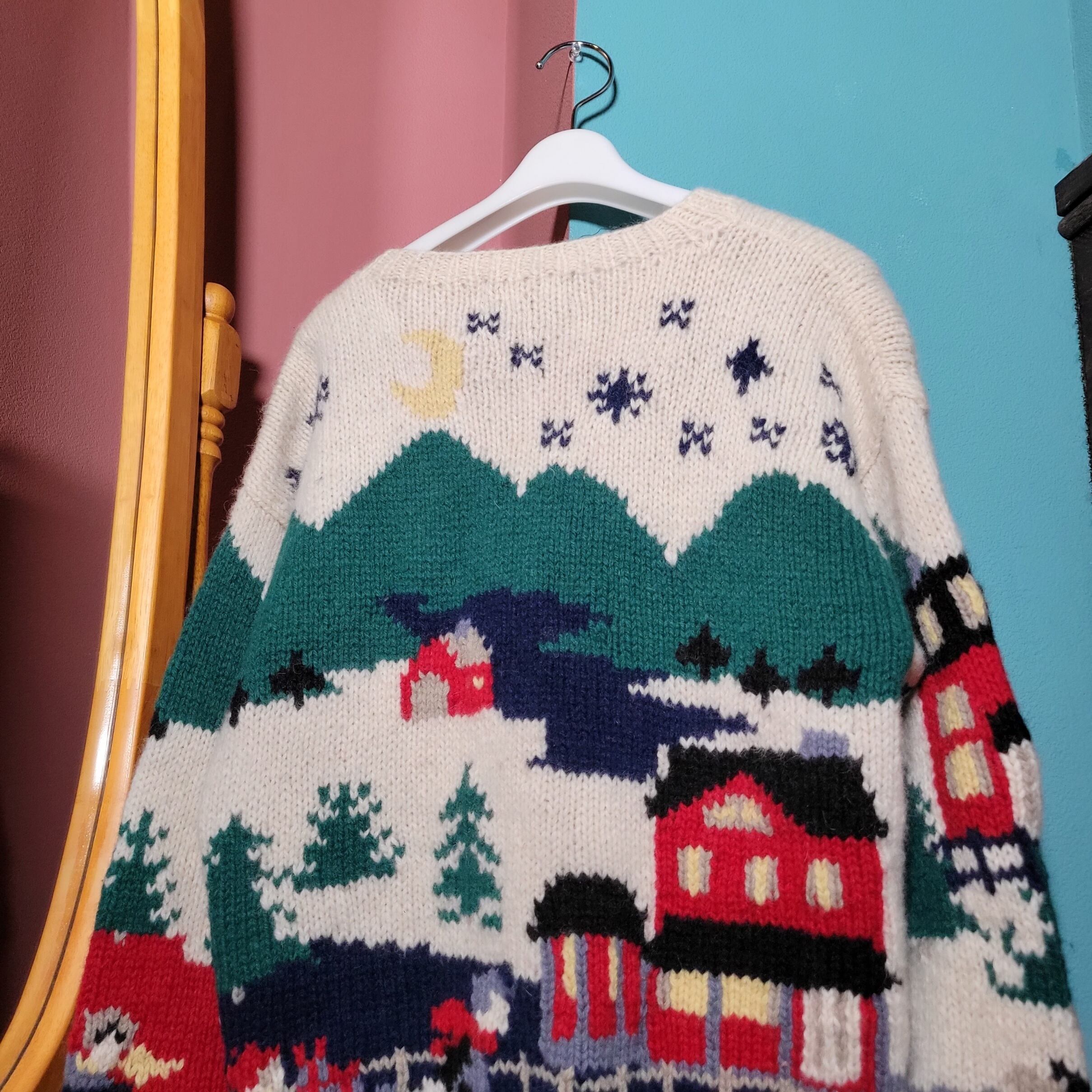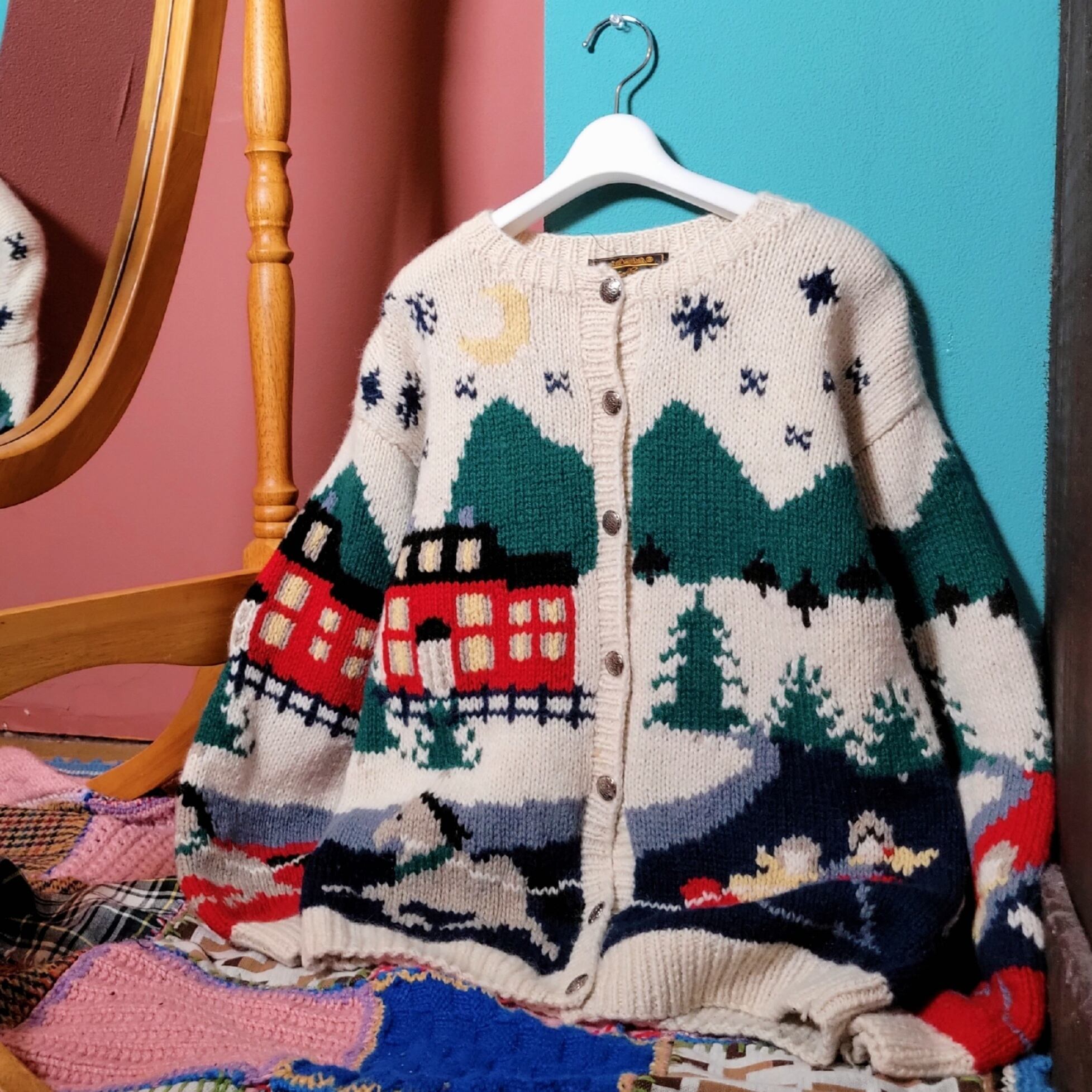 総柄、街のモチーフが全面にはいっています。ぎゅっと密な編みでほっこりポカポカ。キルトスカート等とあわせて古着らしい着こなしも、スラックス+サーマルなどとあわせて遊び心をプラスしてもかわいいです。